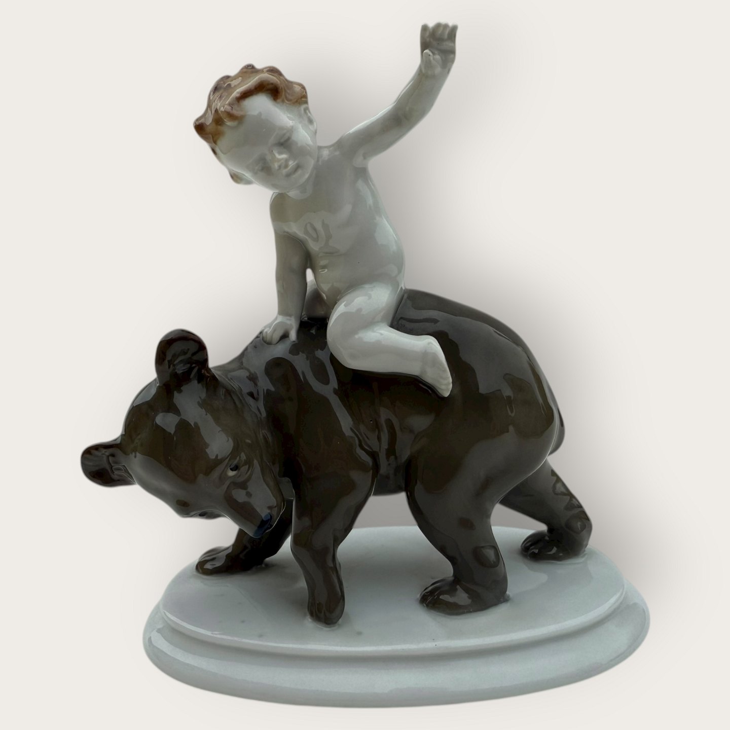 : Metzler & Ortloff, Dreng på bjørn, ca. 12x14,5cm *fin stand*