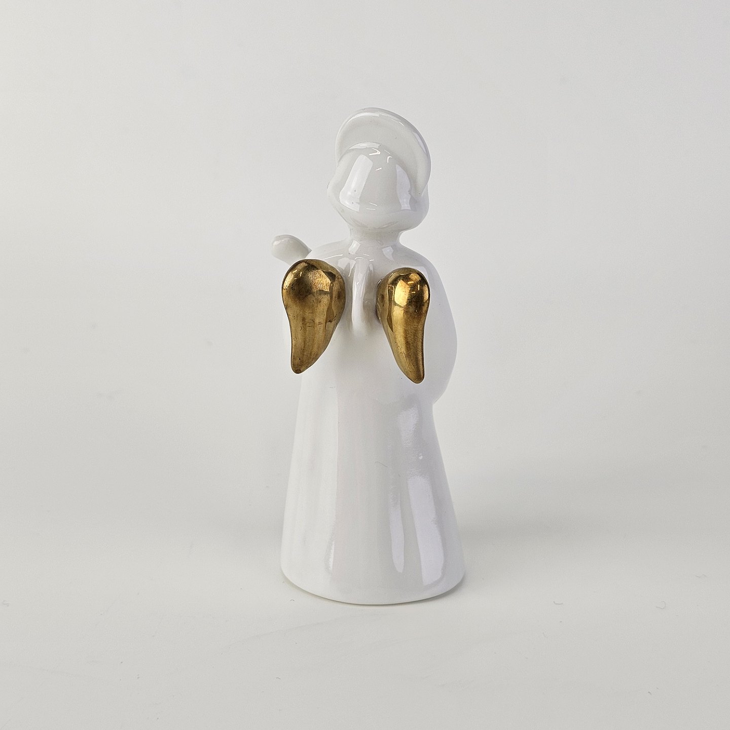 Beskrivelse: Figur med motiv af en engel som spiller på guitar. Figuren er i hvidt porcelæn med forgyldte vinger og detaljer i 24 karat guld.