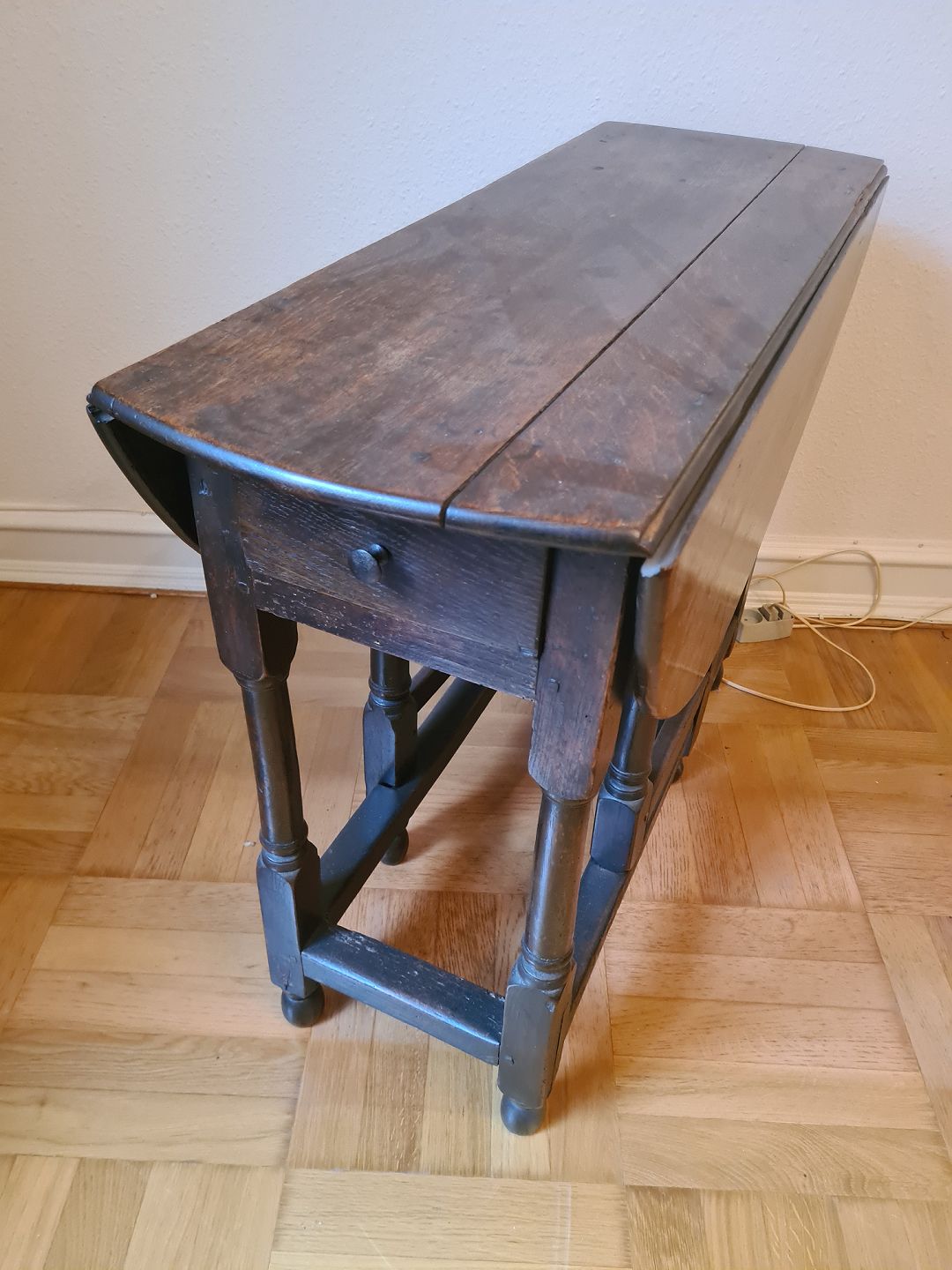 Beskrivelse: Klapbord fra 1800 tallet i eg og med skuffe. Pænt, velholdt og udmærket funktionsdygtigt.