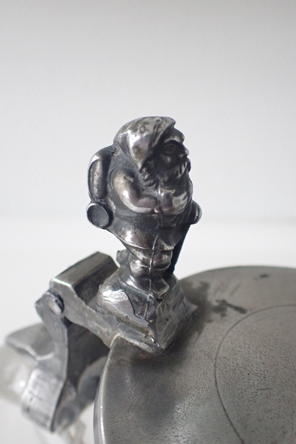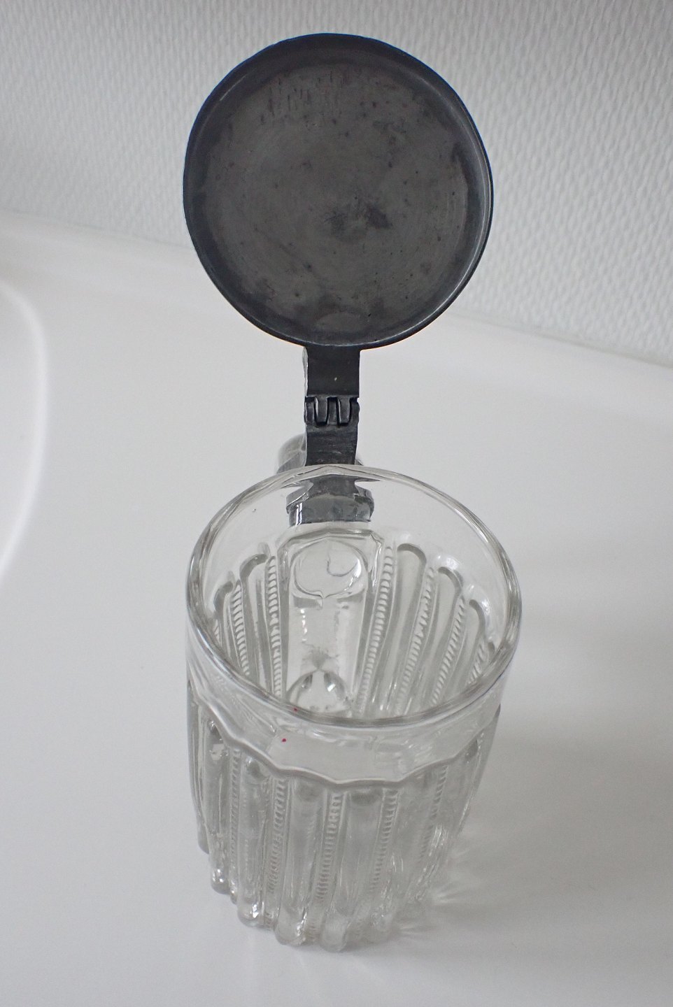 Beskrivelse: Nisse ølkrus - klart riflet glaskrus med hank og med tinlåg. Studsen på tinlåget er udformet som en nisse med rygsæk og stav. Tyskland ca. 1880. 1 liter. Højde med låg u. studs: 13,2 cm. Med studs: 17 cm. I pæn stand i forhold til alder.