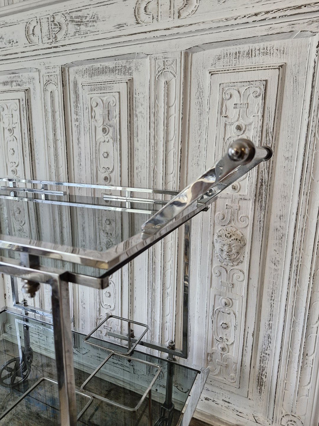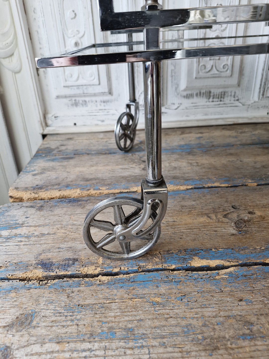 Vintage barbord med stel og hjul i forkromet stål