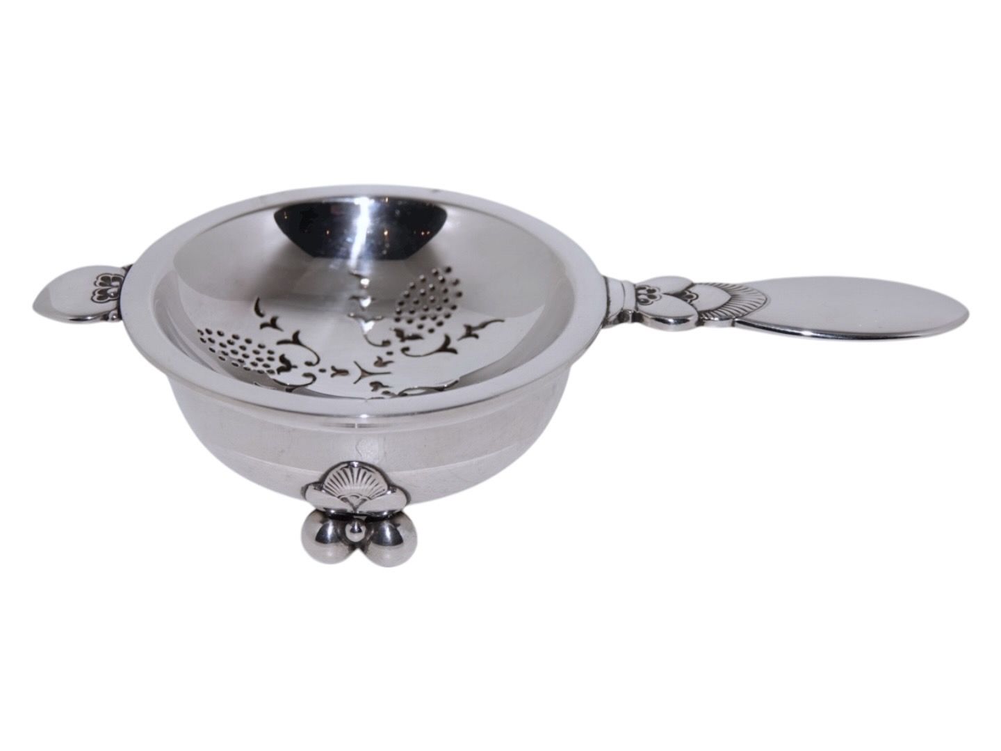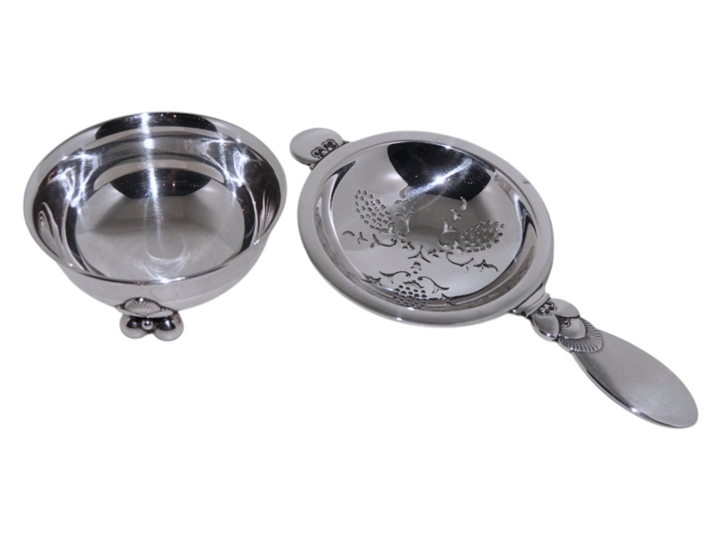 Description: Georg Jensen sterling silver, Cactus tea strainer on stand bowl.