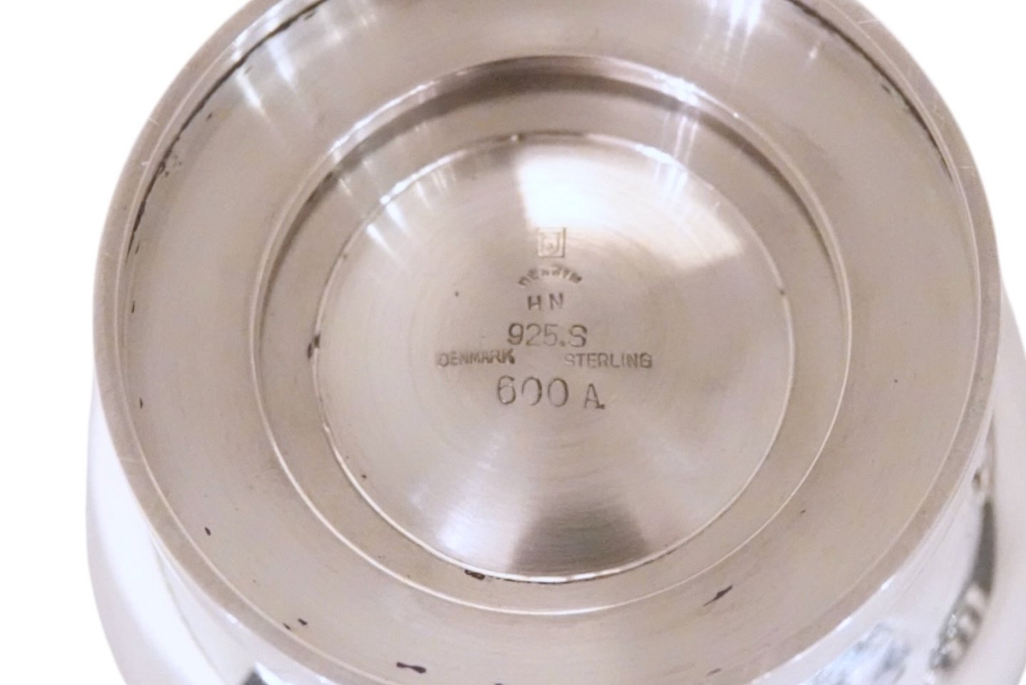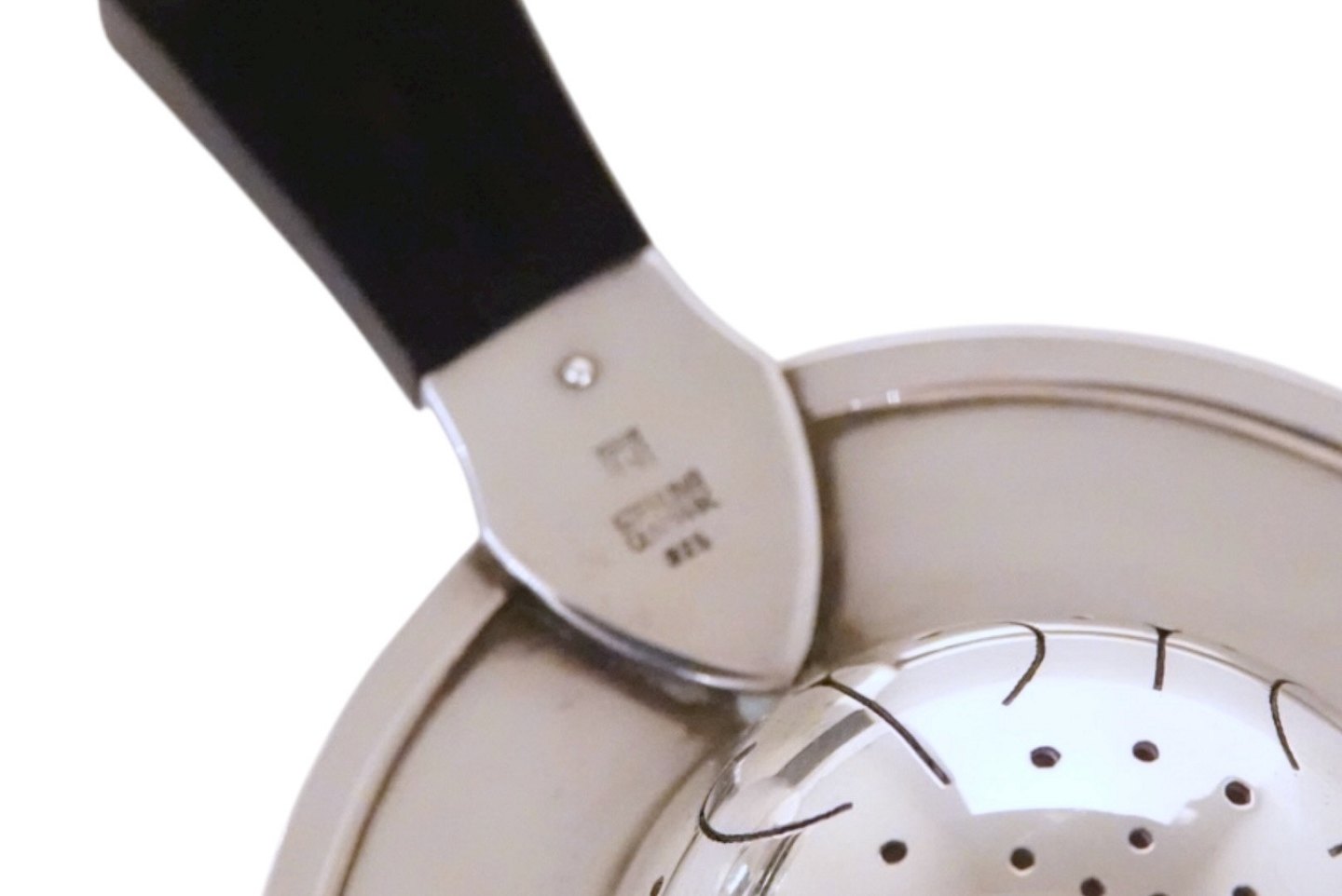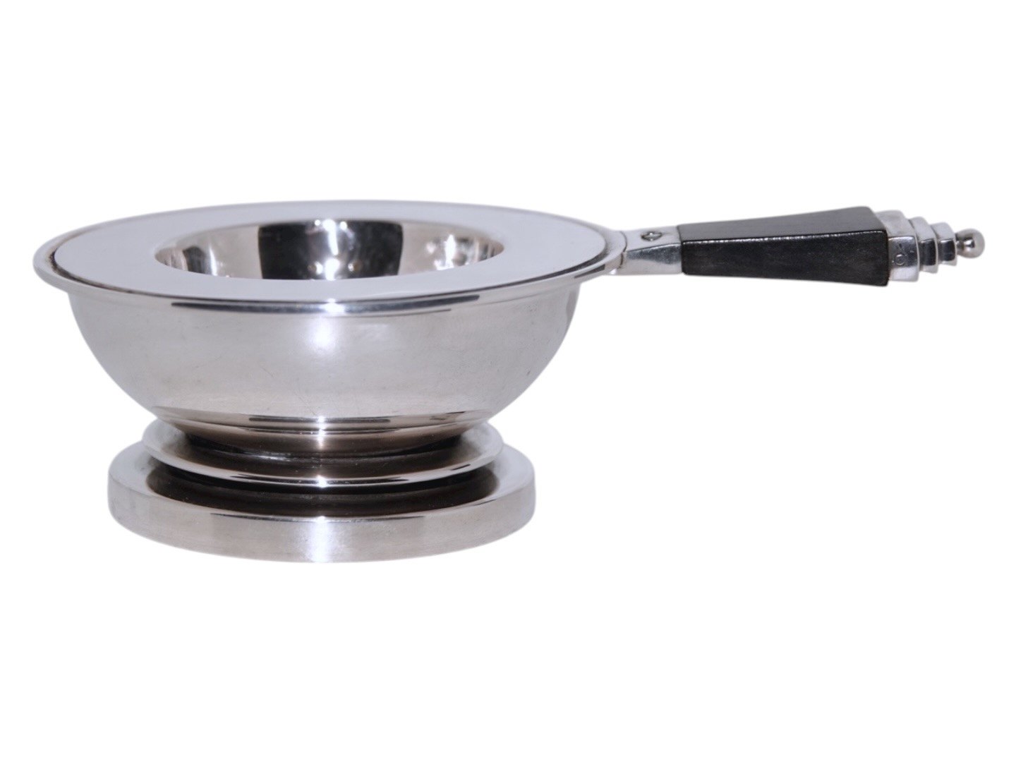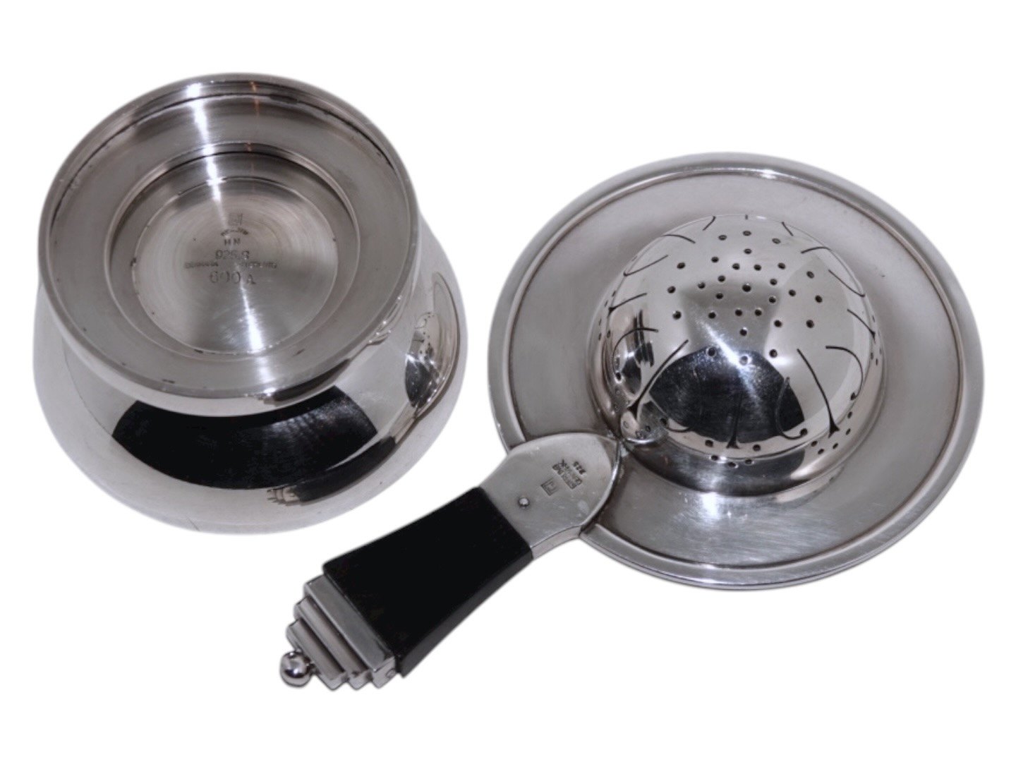 Description: Georg Jensen sterling silver and ebony, Pyramid tea strainer on stand bowl.