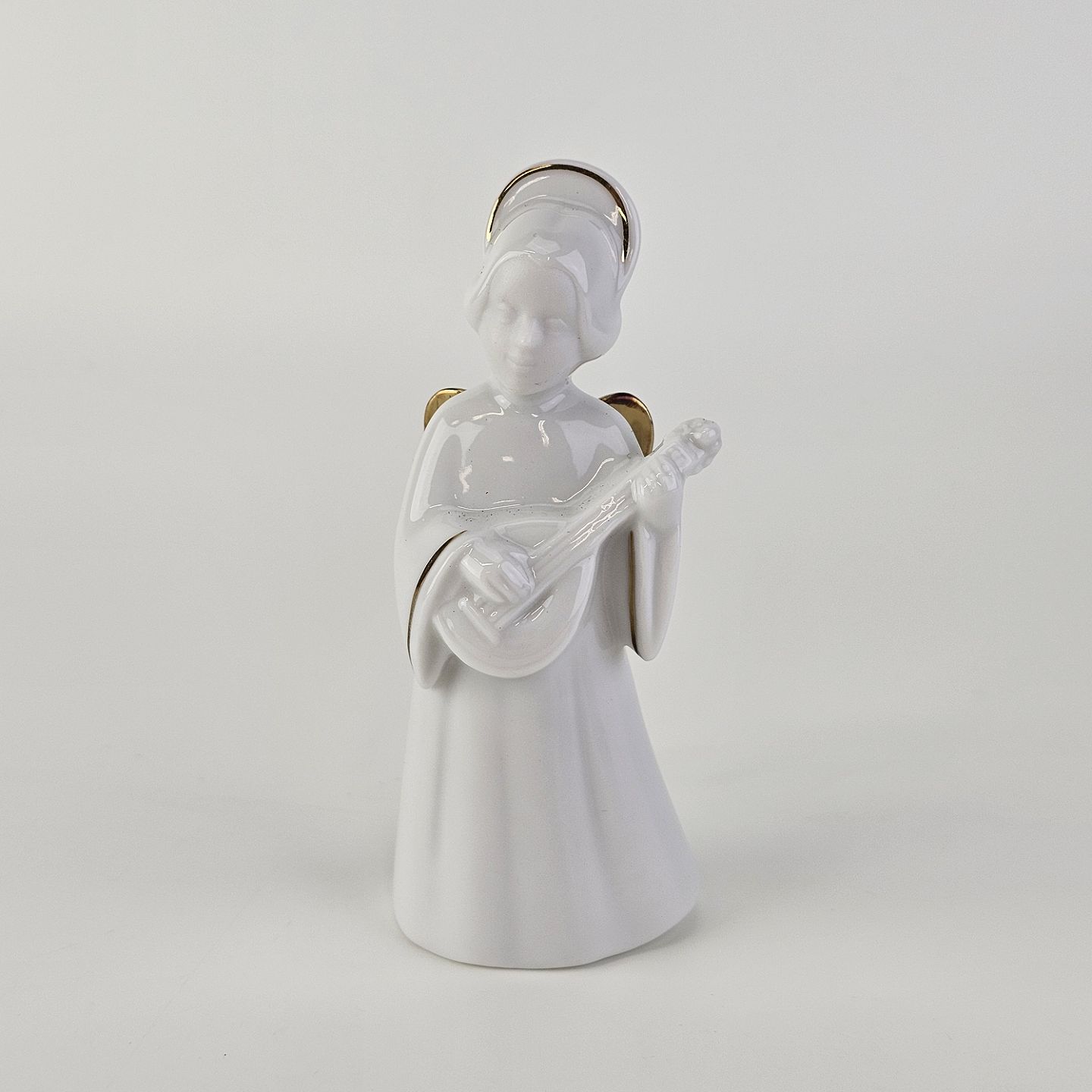 Beskrivelse: Figur med motiv af en engel som spiller på mandolin. Figuren er i hvidt porcelæn med forgyldte vinger og detaljer i 24 karat guld.