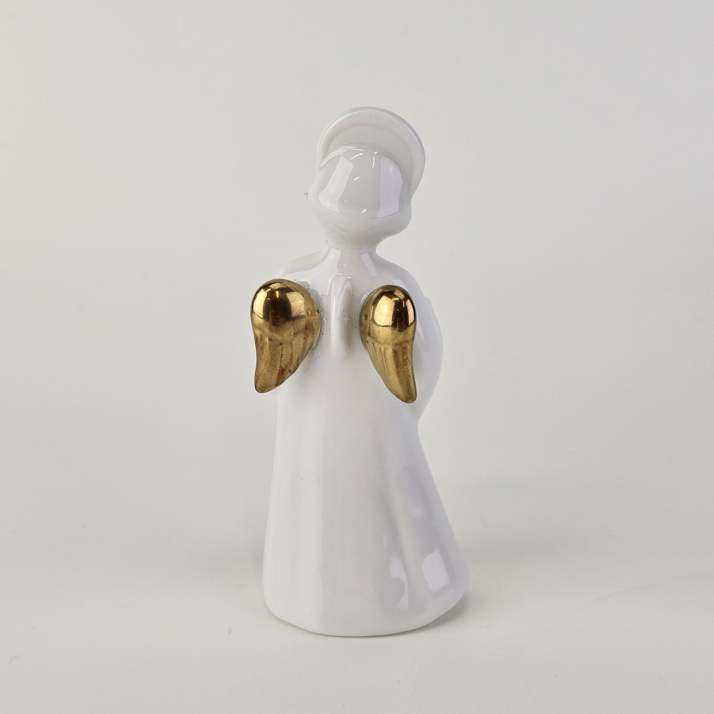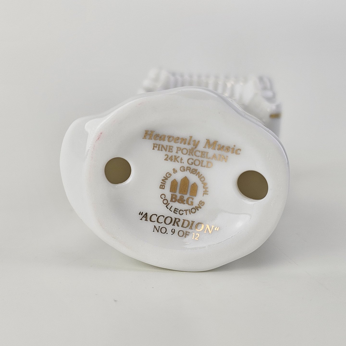 Beskrivelse: Figur med motiv af en engel som spiller på harmonika. Figuren er i hvidt porcelæn med forgyldte vinger og detaljer i 24 karat guld.