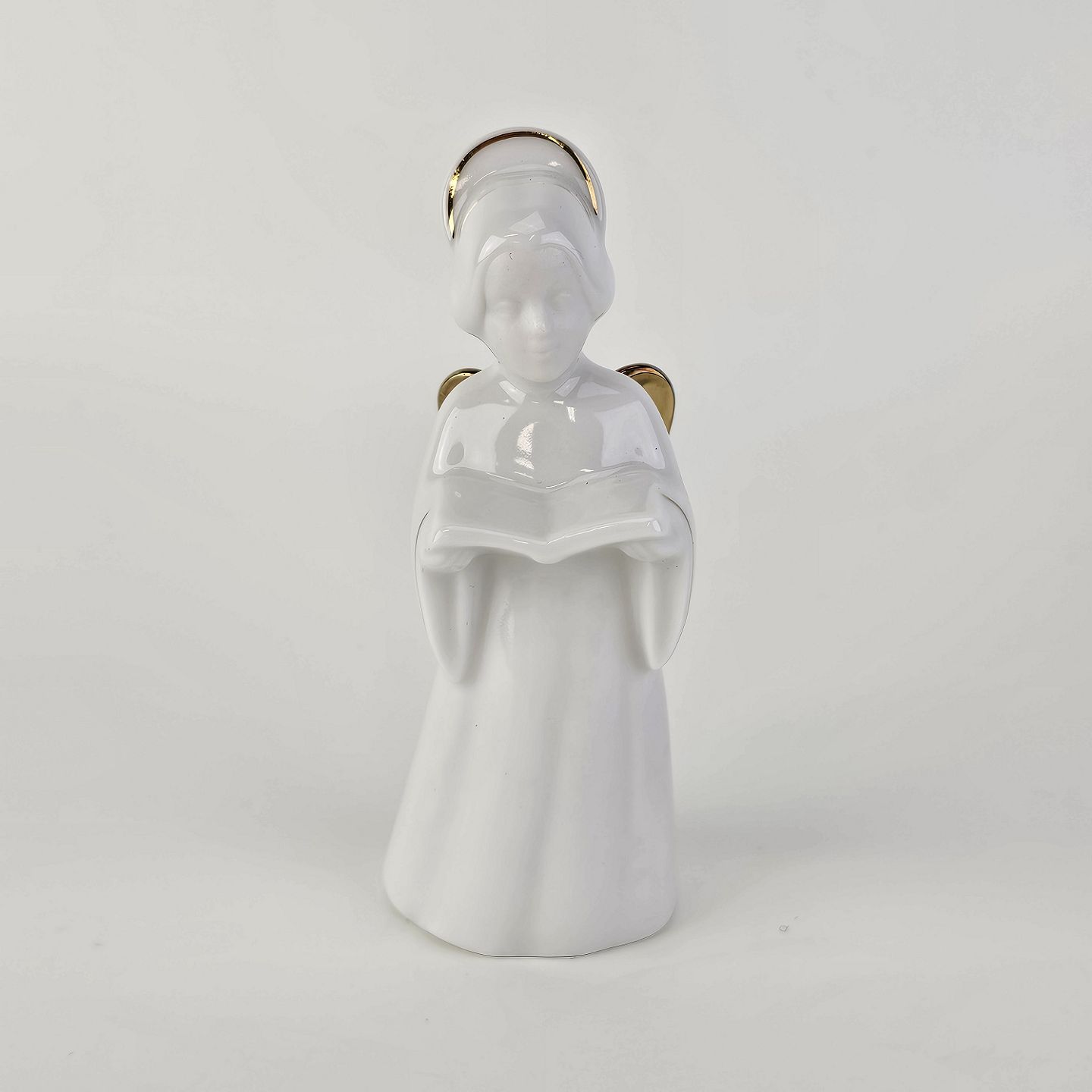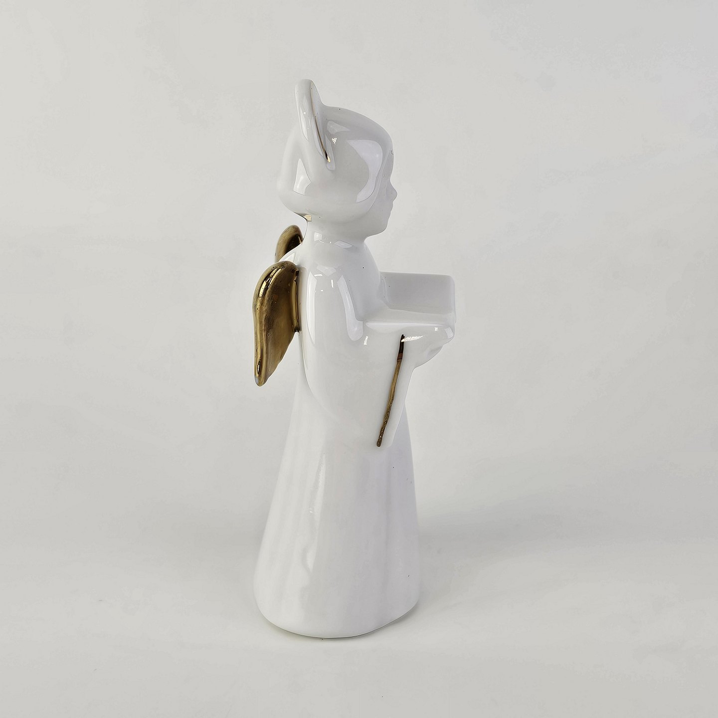 Beskrivelse: Figur med motiv af en engel med en sandbog. Figuren er i hvidt porcelæn med forgyldte vinger og detaljer i 24 karat guld.