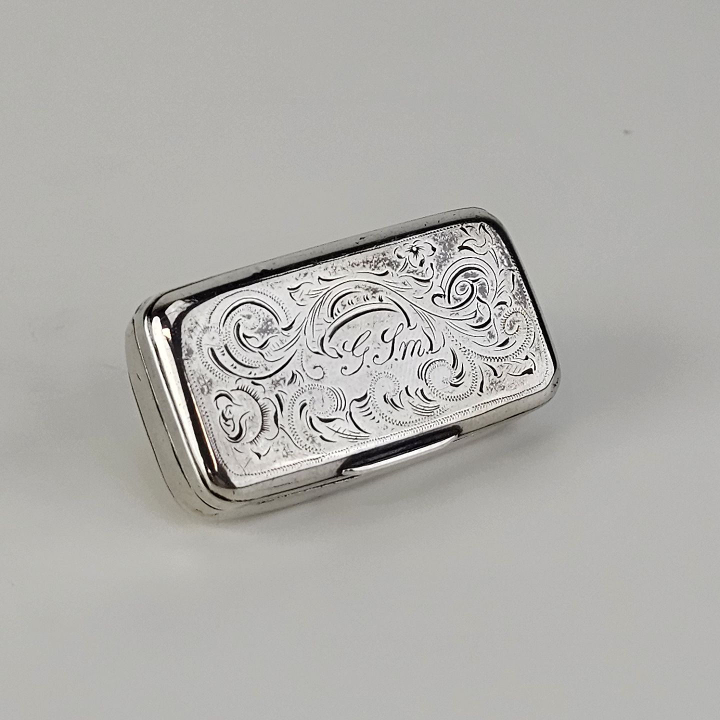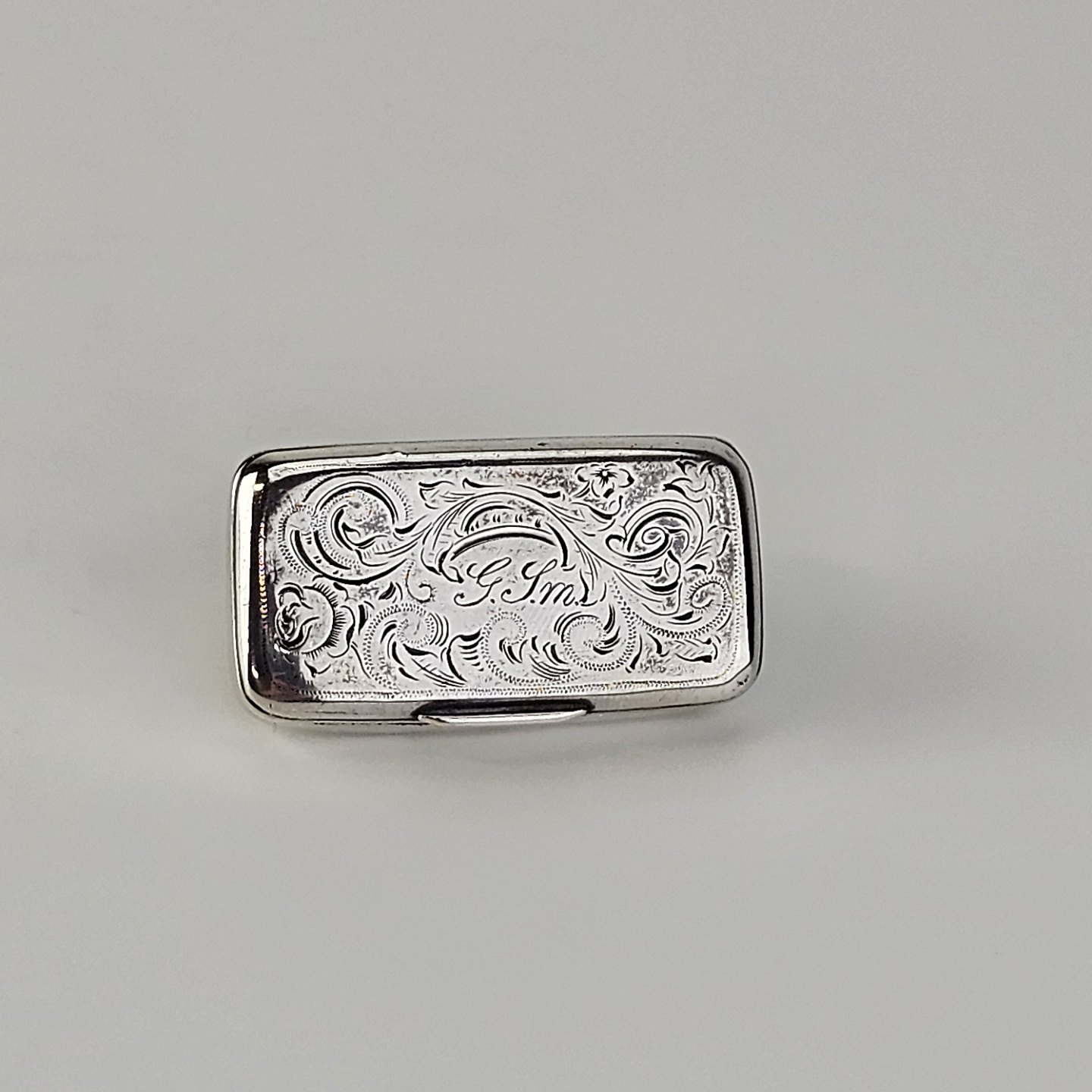 Beskrivelse: Pilleæske i sterling sølv med bladmotiv, indgraveret G.S.M.