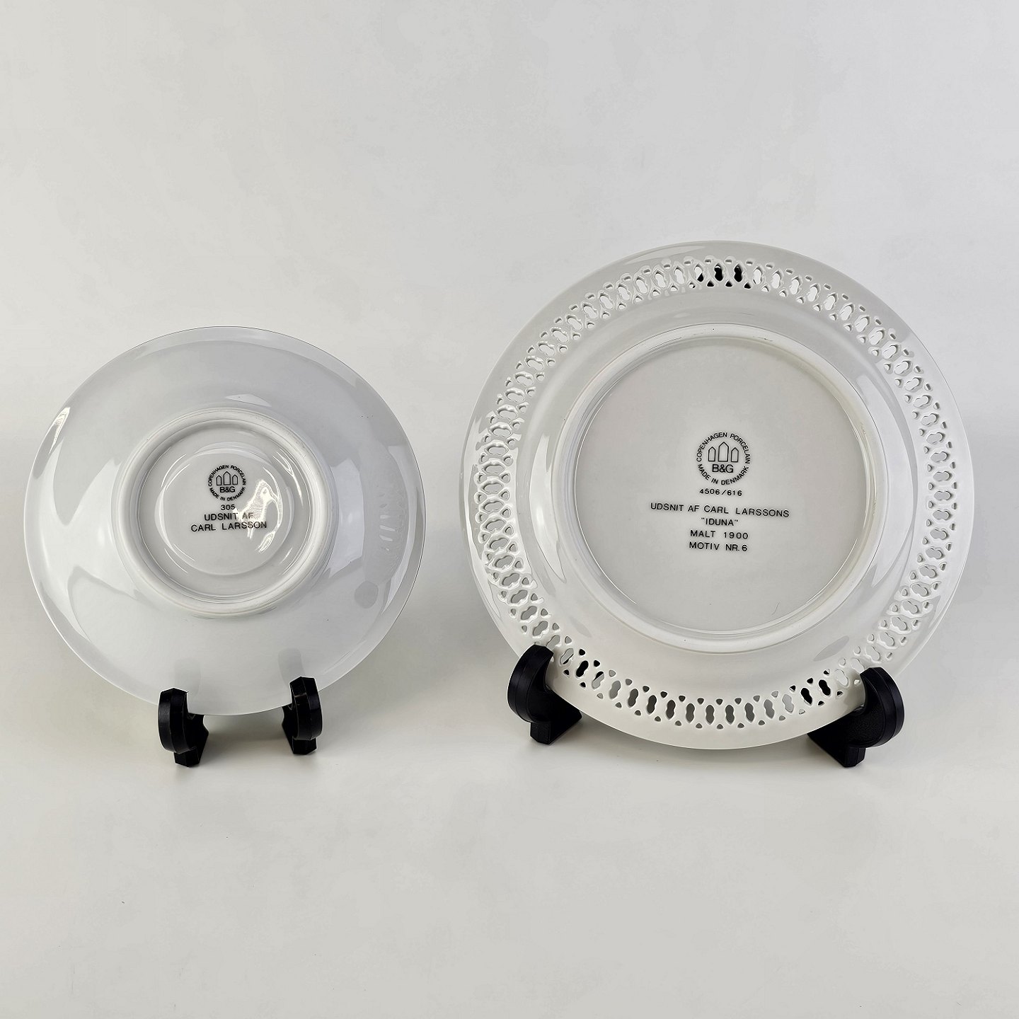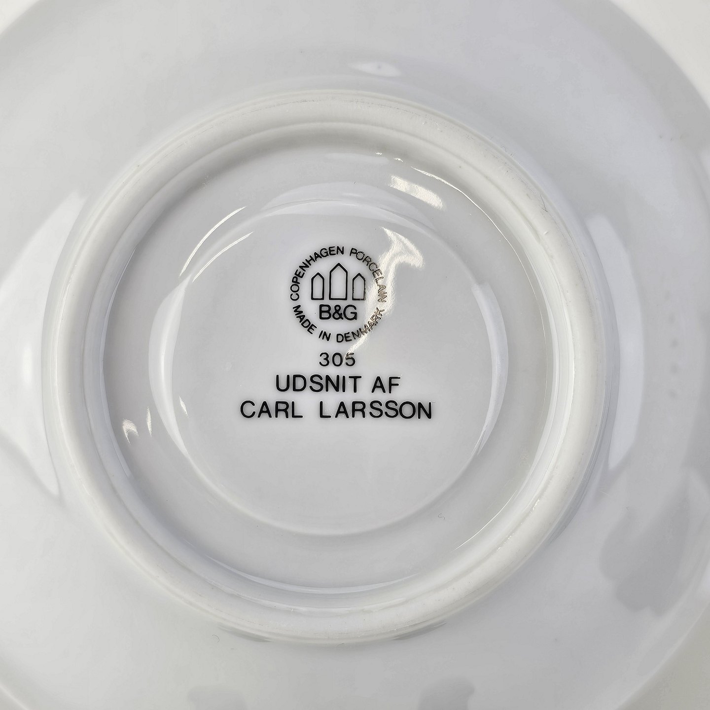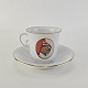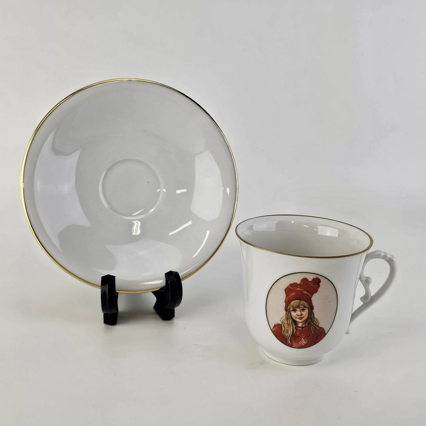 Beskrivelse: Kop med underkop i porcelæn med guldkant og platte i porcelæn med guldkant og udsnit af Carl Larsson malt 1900, fra Carl Larsson kaffestellet.