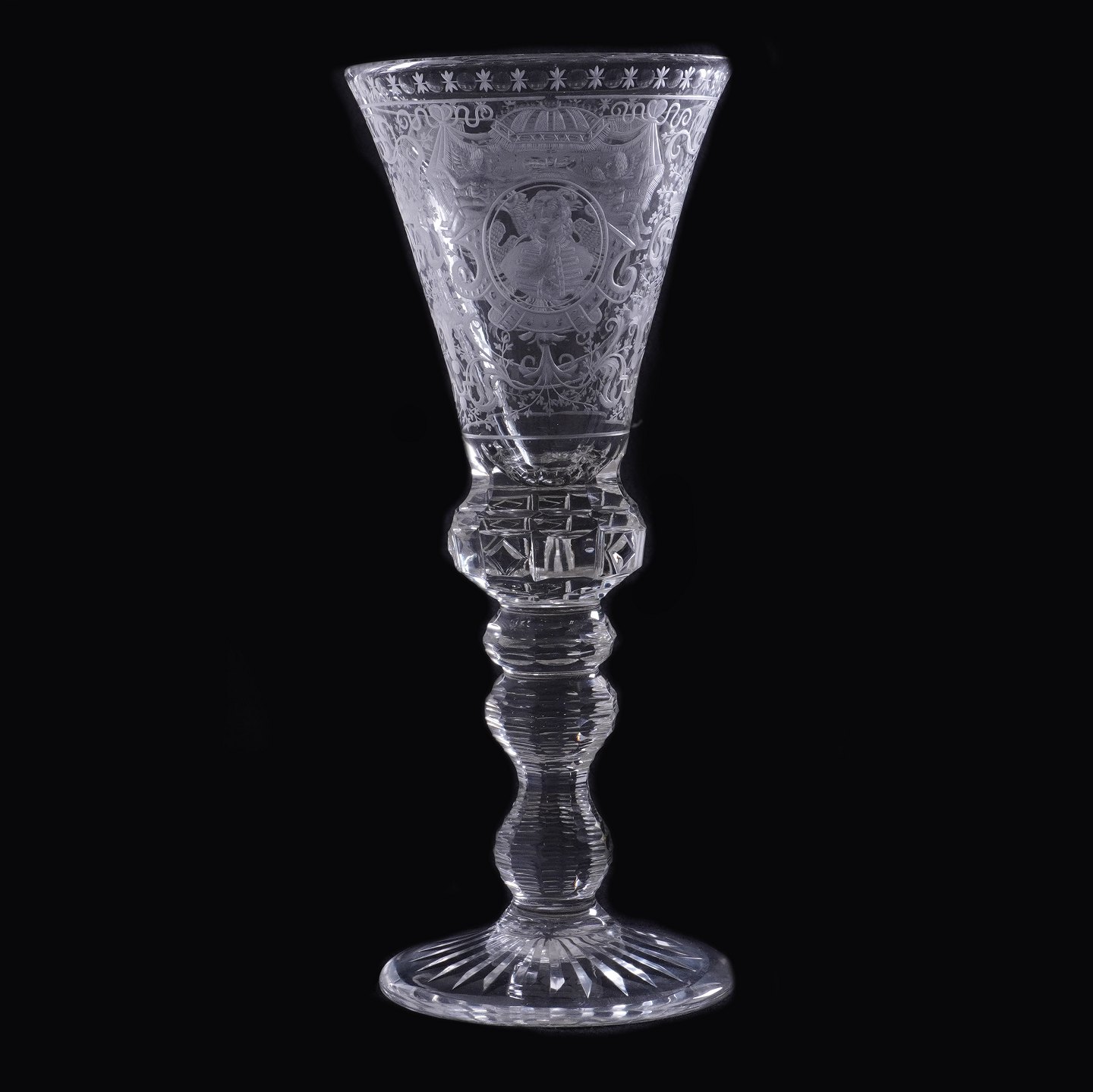 Tysk glas pragtpokal indgraveret med adeligt portræt og kronet spejlmonogram. Thürringen 1730-50. H: 28cm