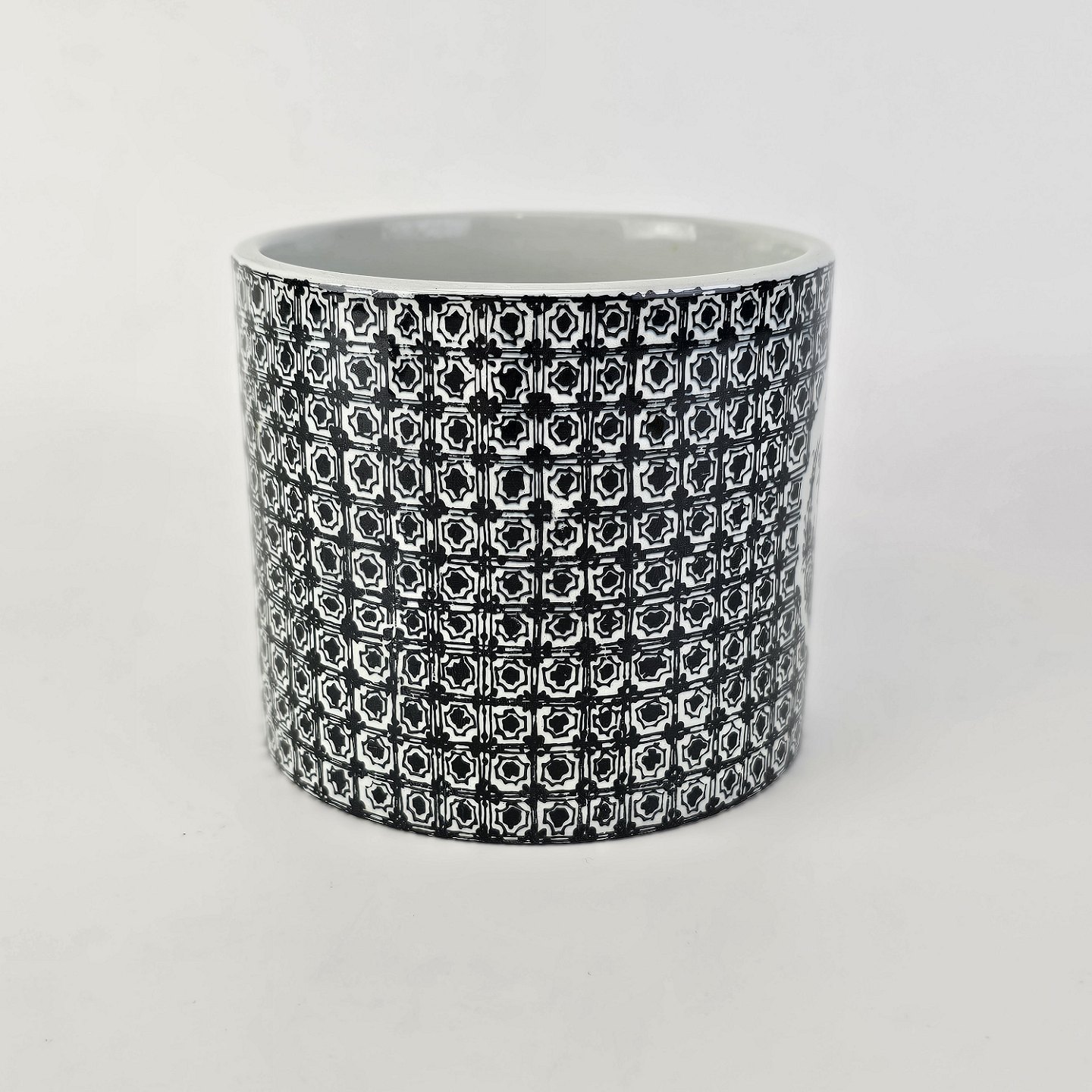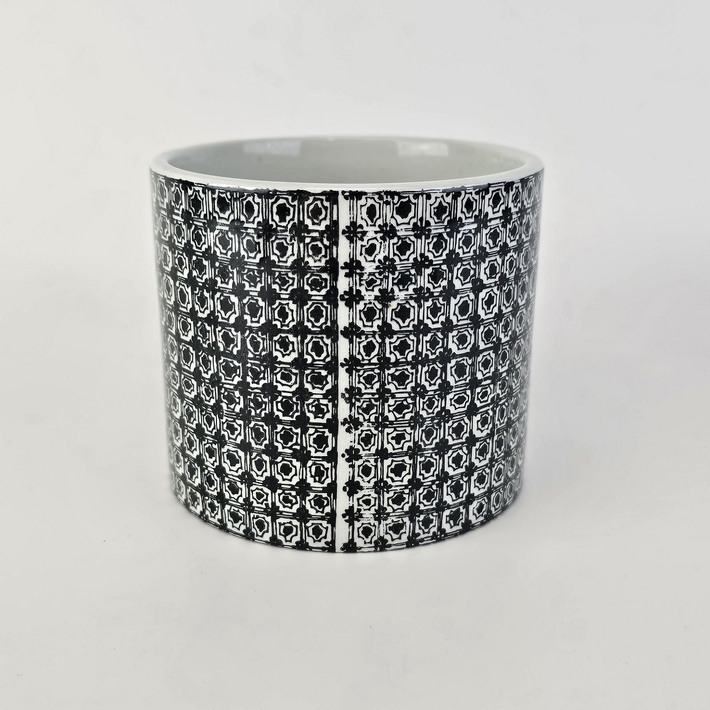 Beskrivelse: Urtepotteskjuler i porcelæn med motiv i sort streg af kineser samt titlen Øst. Nr. 3022-697