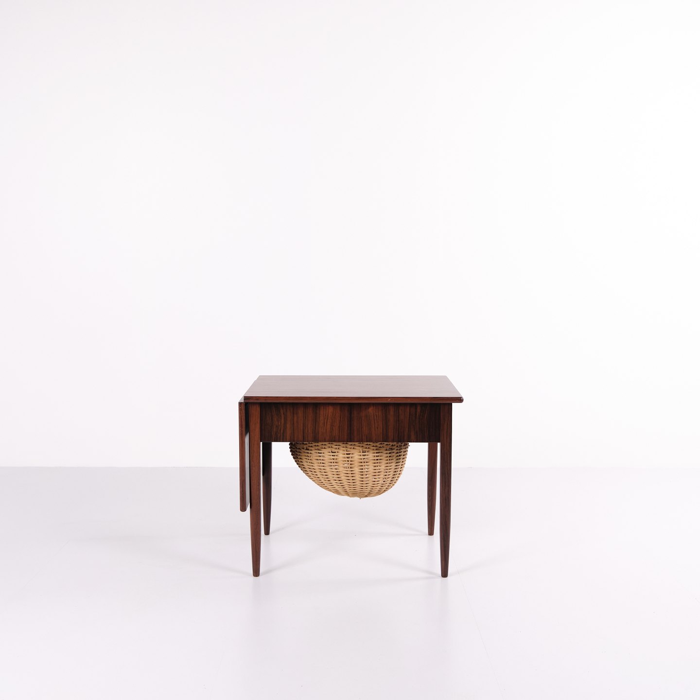 Beskrivelse: Foldbart sybord designet af Johannes Andersen og fremstillet af Silkeborg Møbelfabrik i 1960’erne. Bordet er udført i palisander og har både skuffe og udklappelig bordplade, hvilket gør det særligt funktionelt til opbevaring og arbejde.