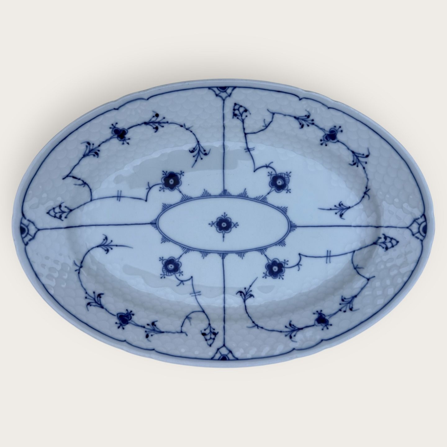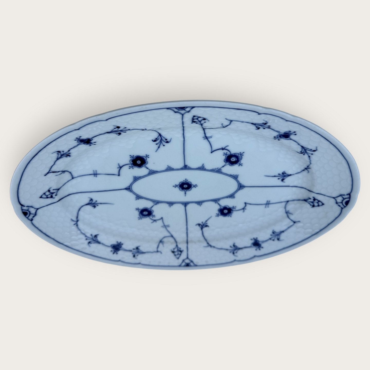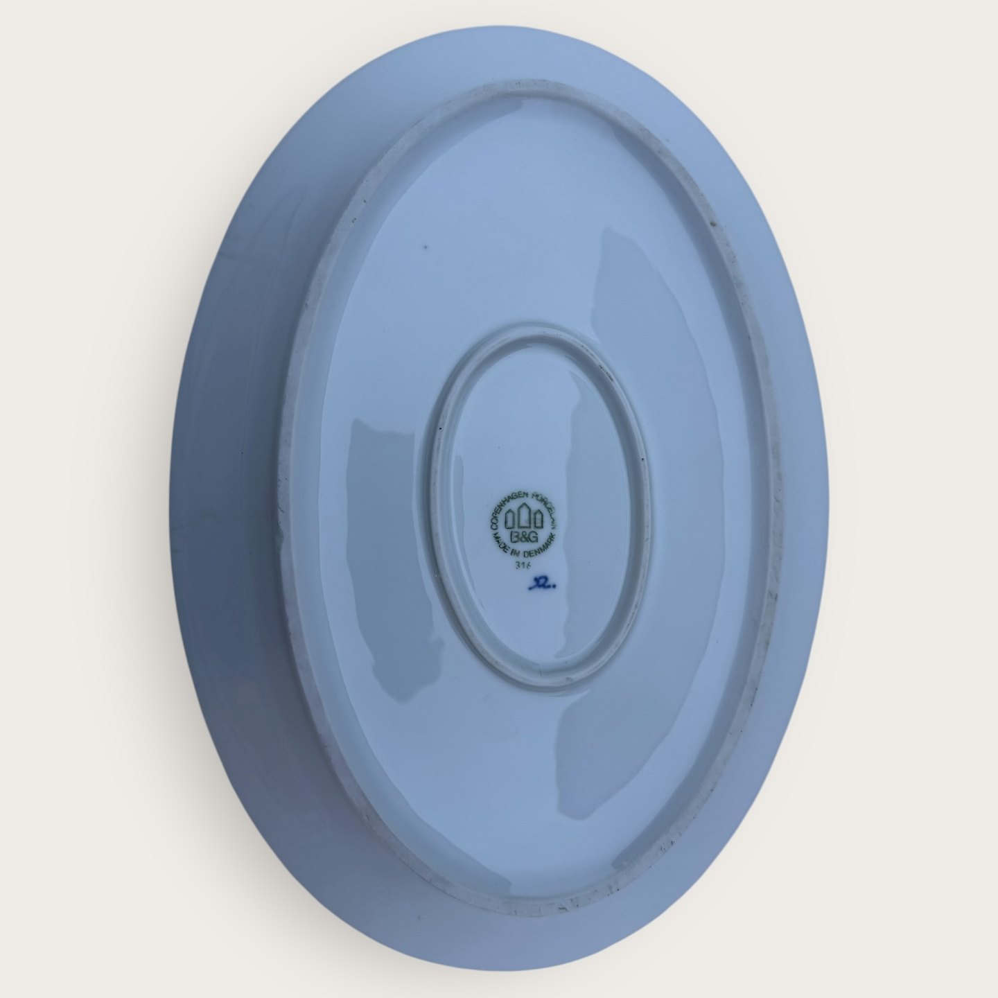 Beskrivelse: Bing & Grøndahl, Blåmalet / Musselmalet, Serverings fad #316, 34x23,5cm, 3. sortering p.g.a. en lille fejl på fodranden under glasuren (se foto) ellers pæn stand*