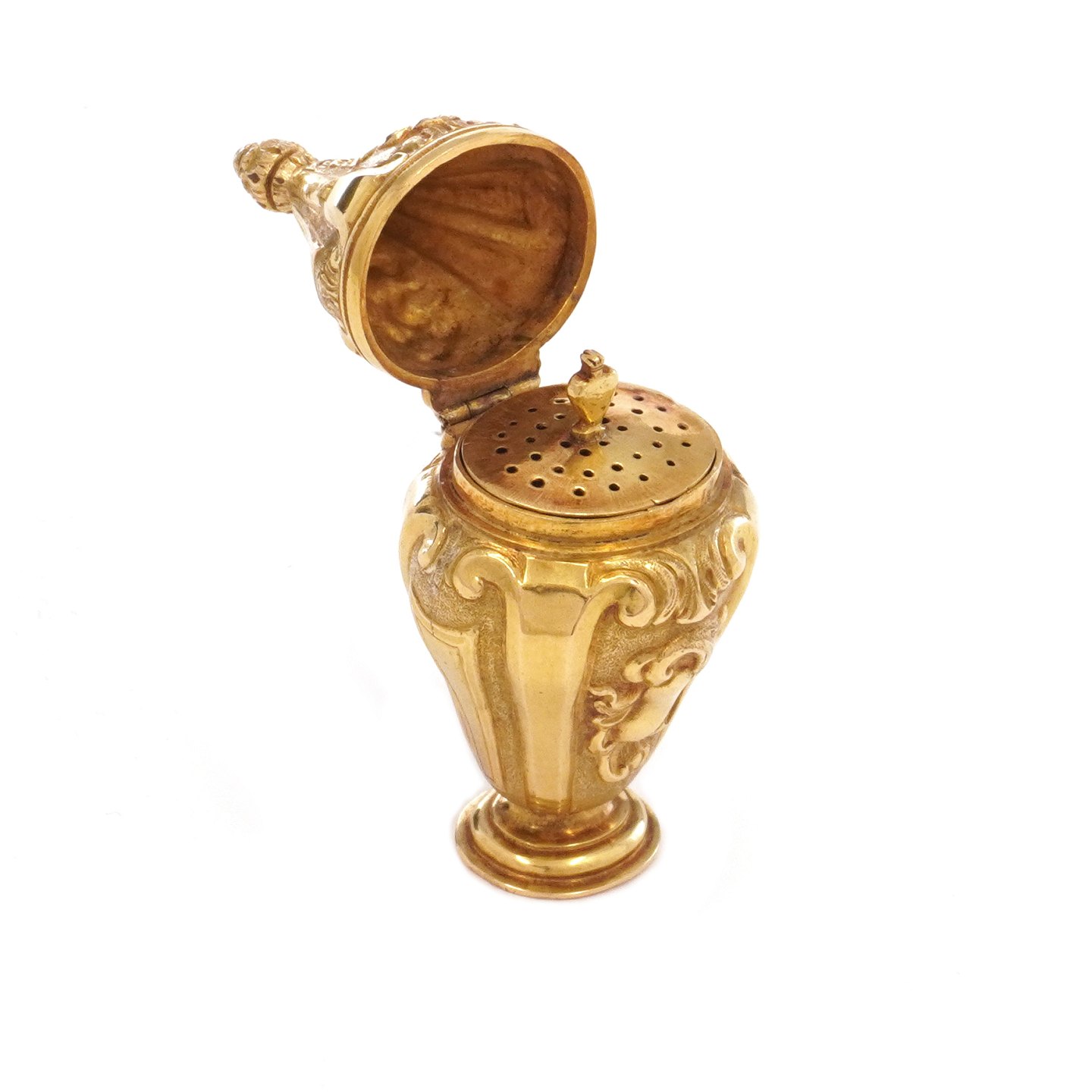 Rokoko Riechdose aus 18kt Gold. Undeutlich gestempelt "RK"(?). H: 6,2cm. G: 24,3gr
