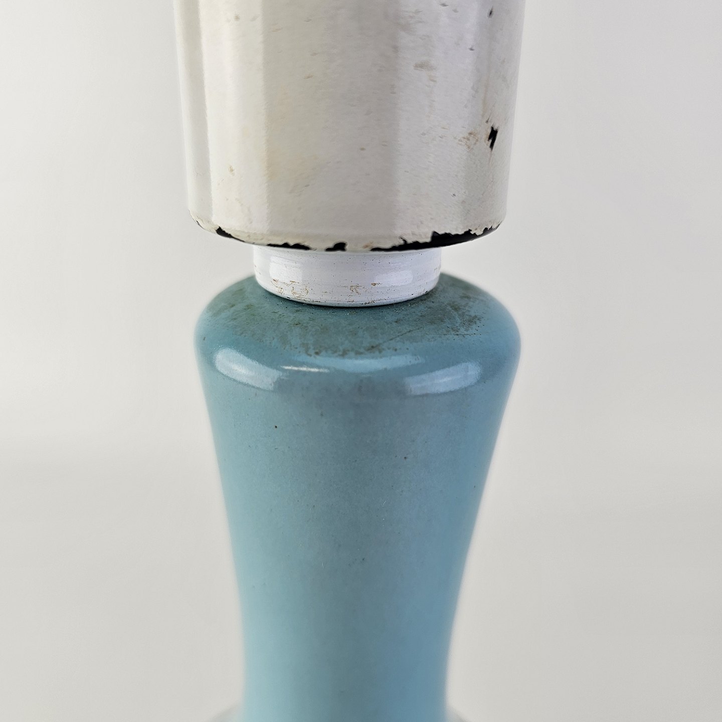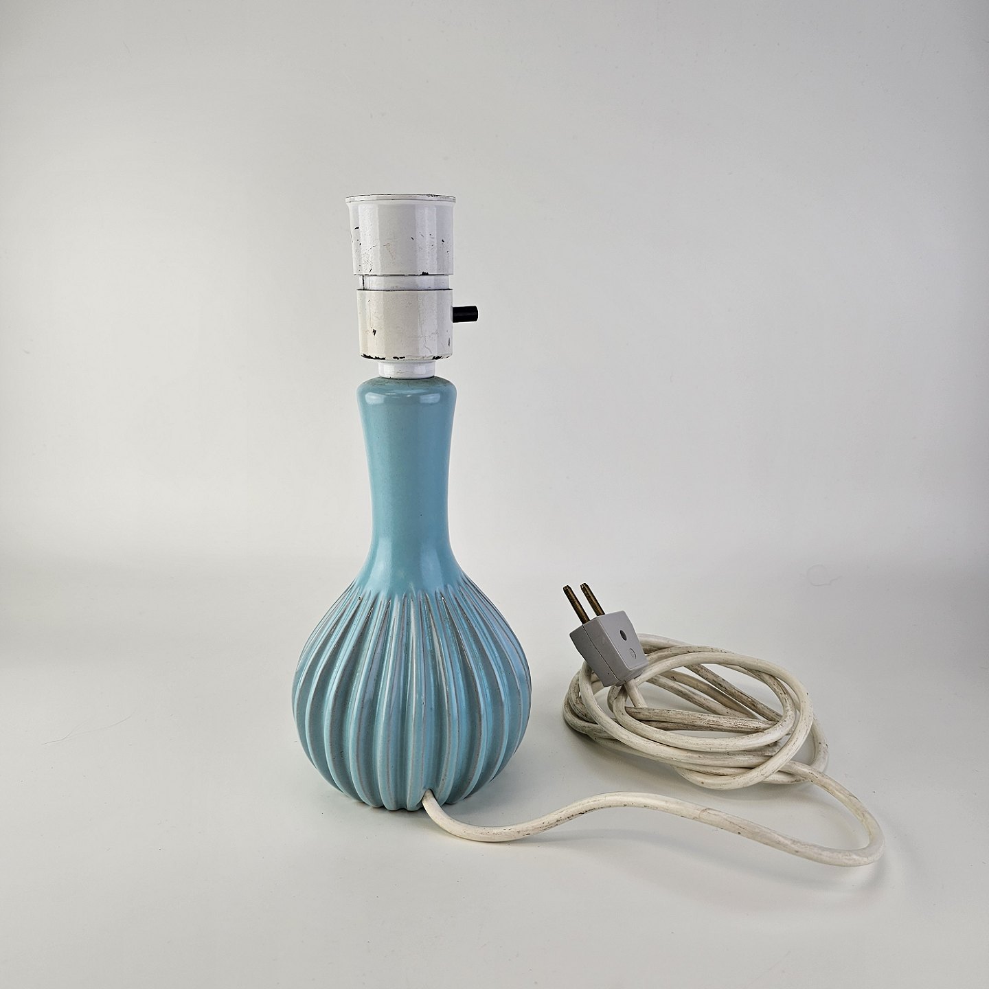 Beskrivelse: Rund bordlampe i rillet grønblå keramik med hvid fatning