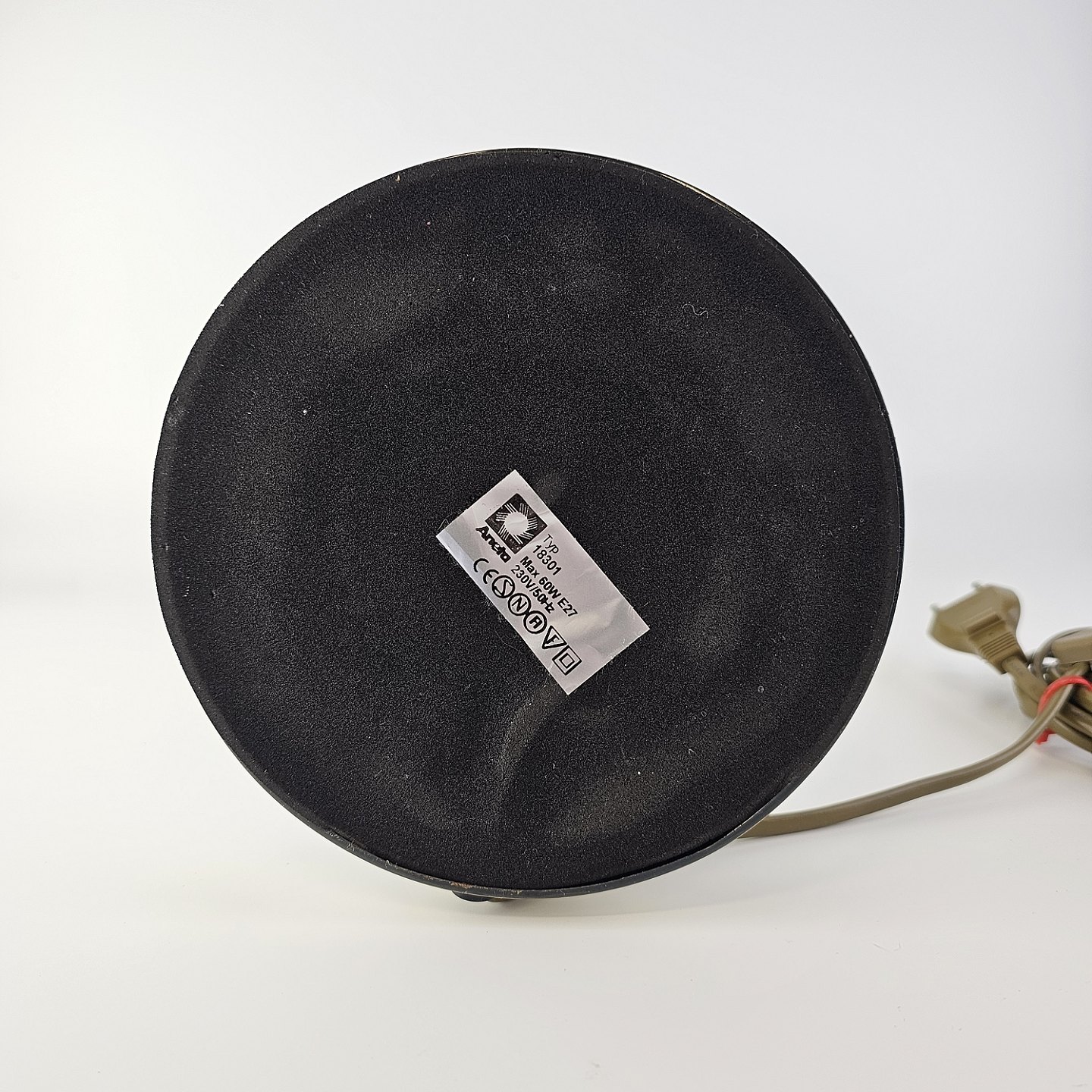 Beskrivelse: Bordlampe med fod i messing og skærm af grønt/hvid glas