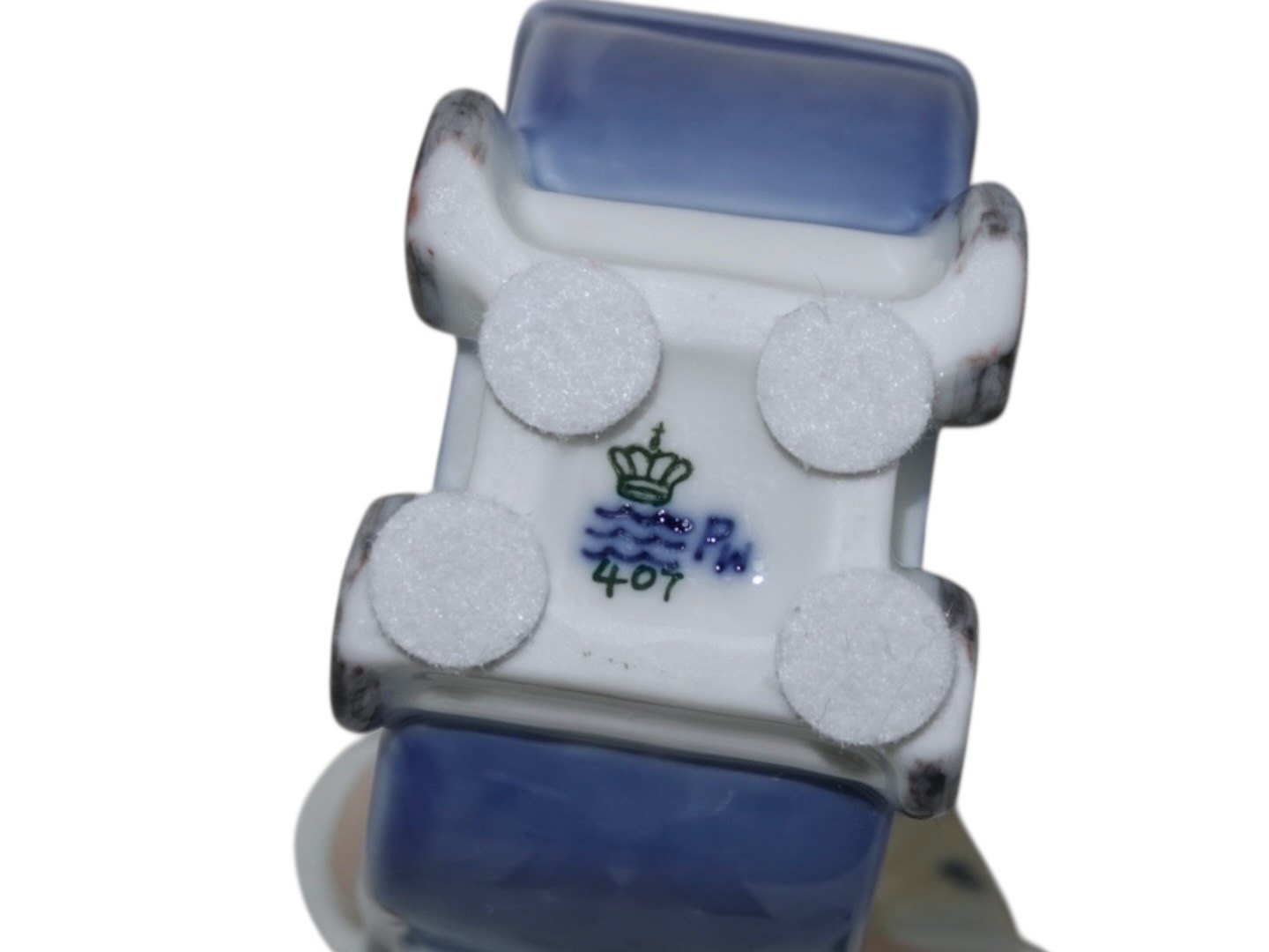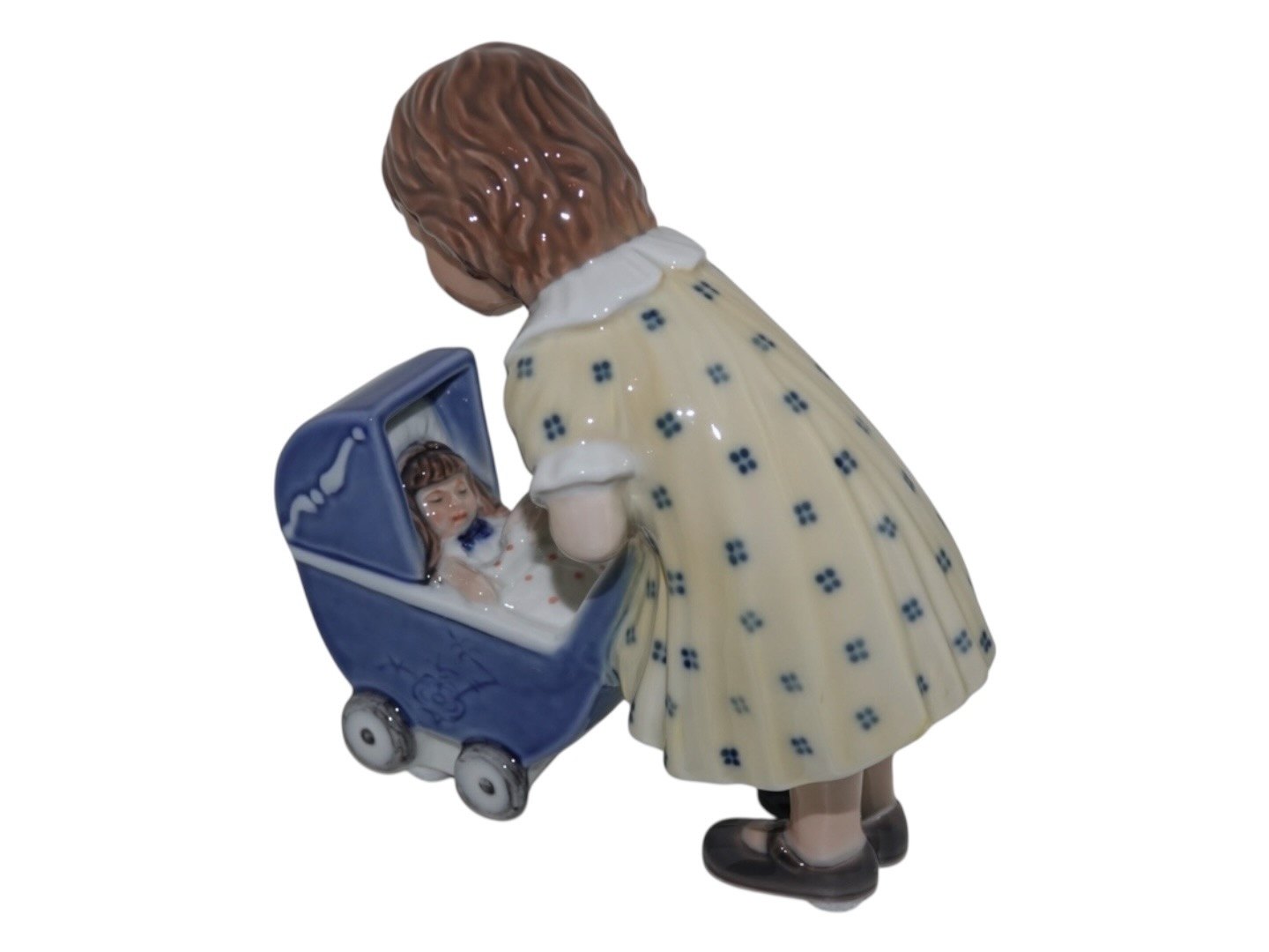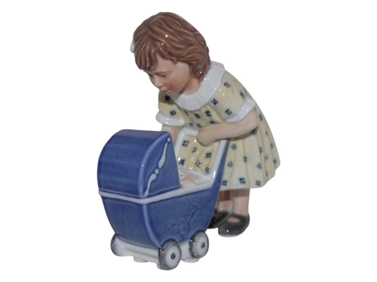 Beskrivelse: Større Royal Copenhagen figur, pige med blå barnevogn.