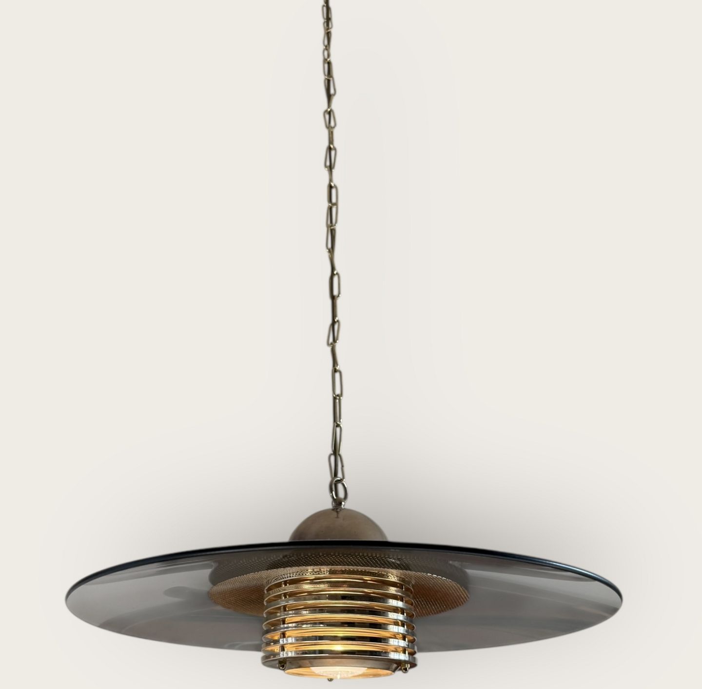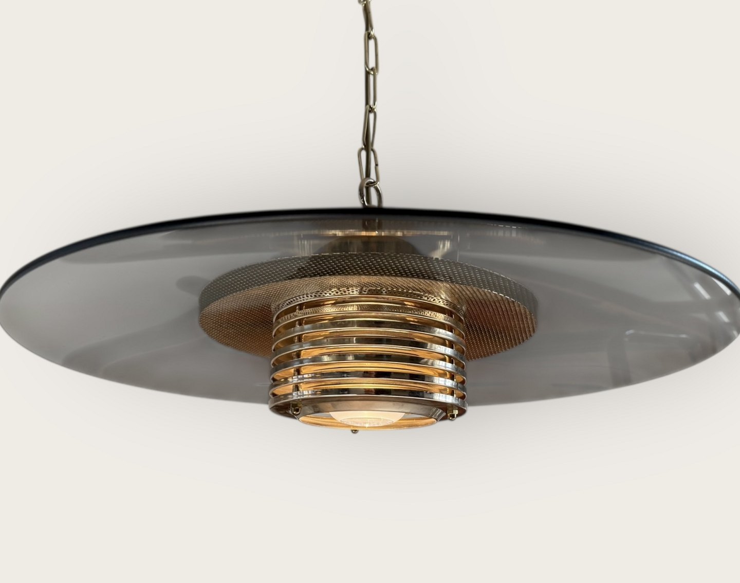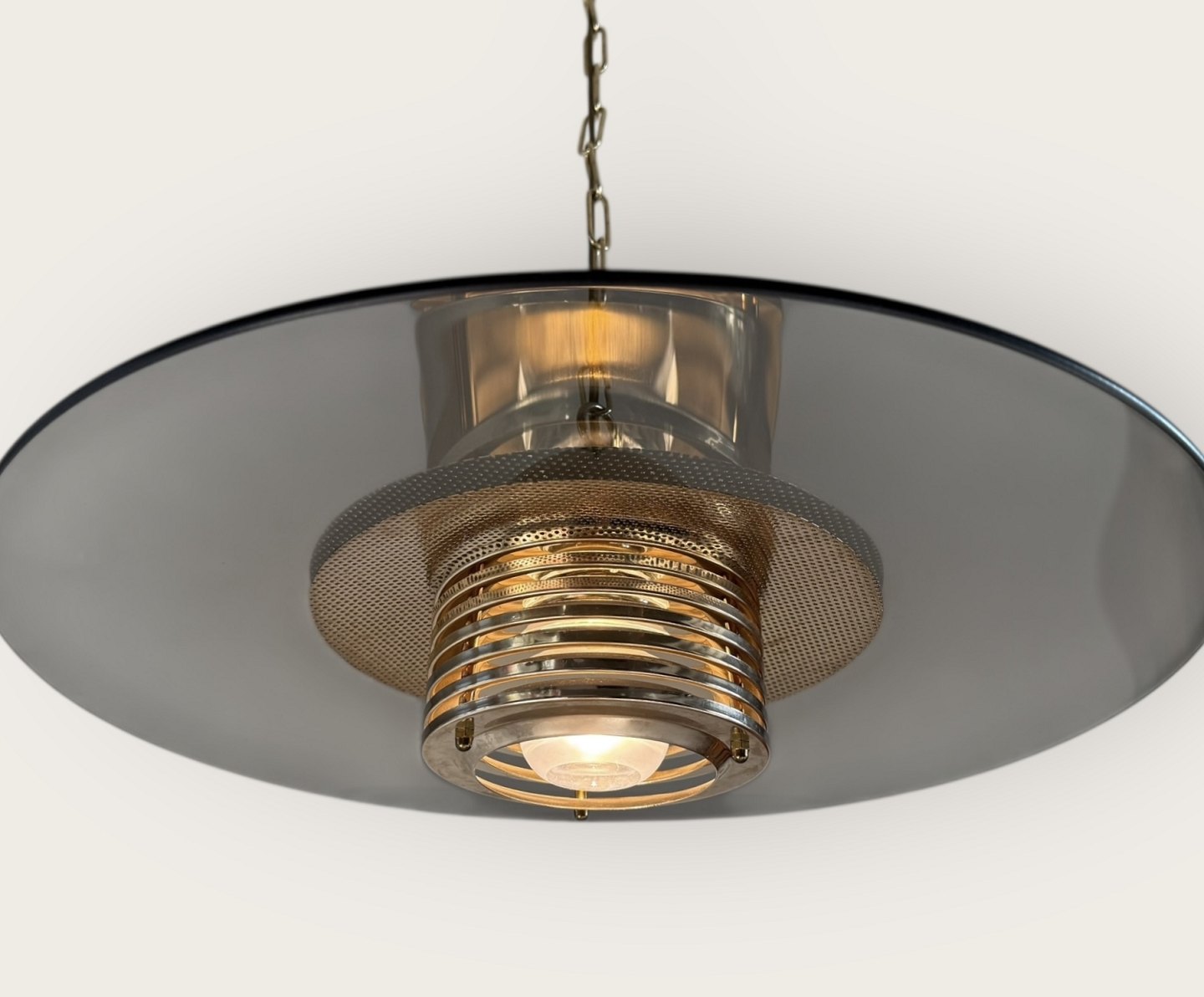 Beskrivelse: Jan-Eskild Eskildsson, Belid, Sverige, reflektor Loftlampe i røgfarvet glas og messing, Diameter 49cm *pæn stand*