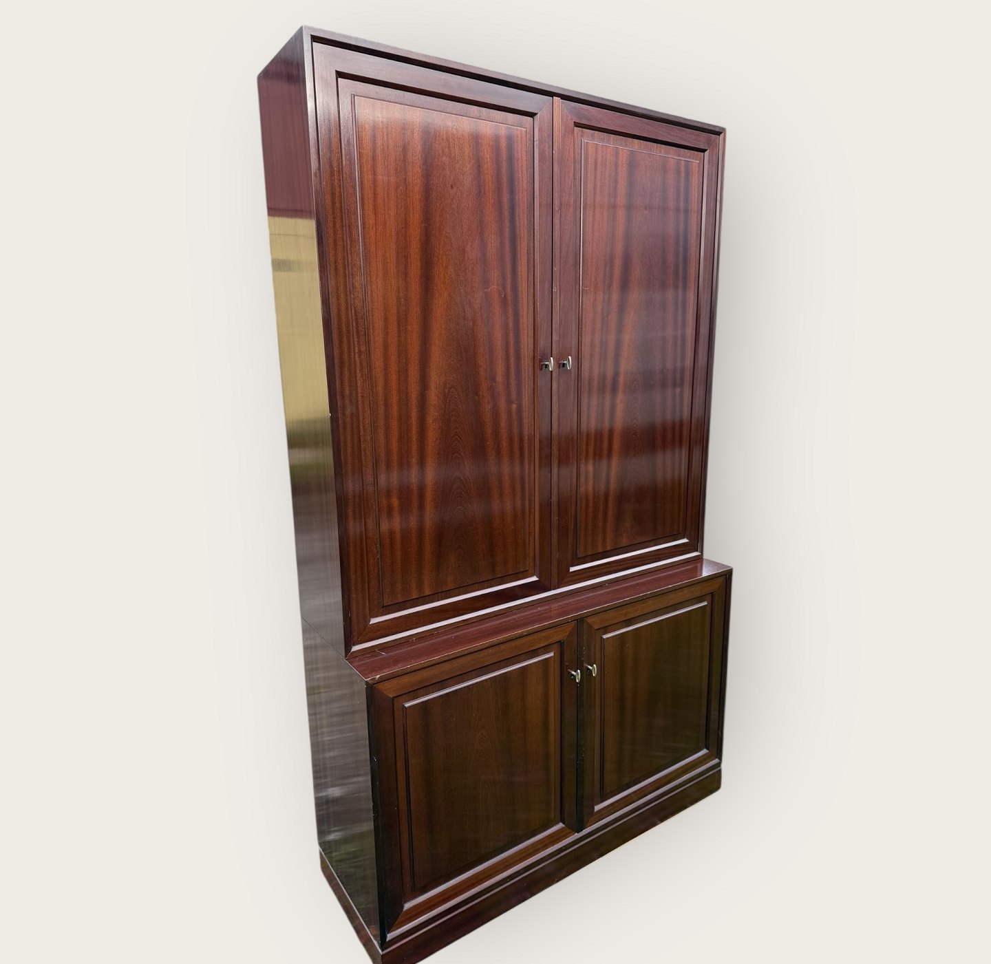 Beskrivelse: Stort rummeligt skab med hylder, mahognifiner, Mål: HxBXD 186x110x38cm *Pæn stand med enkelte brugsspor*