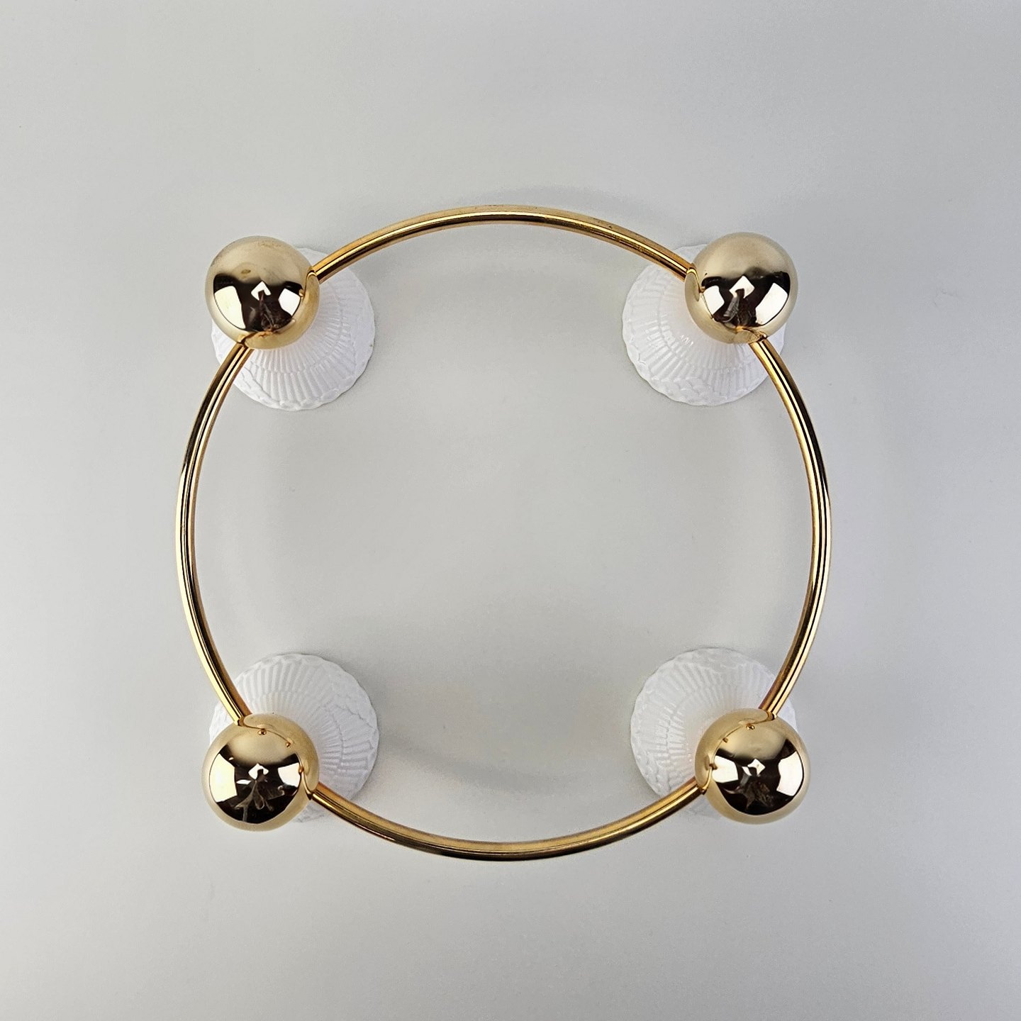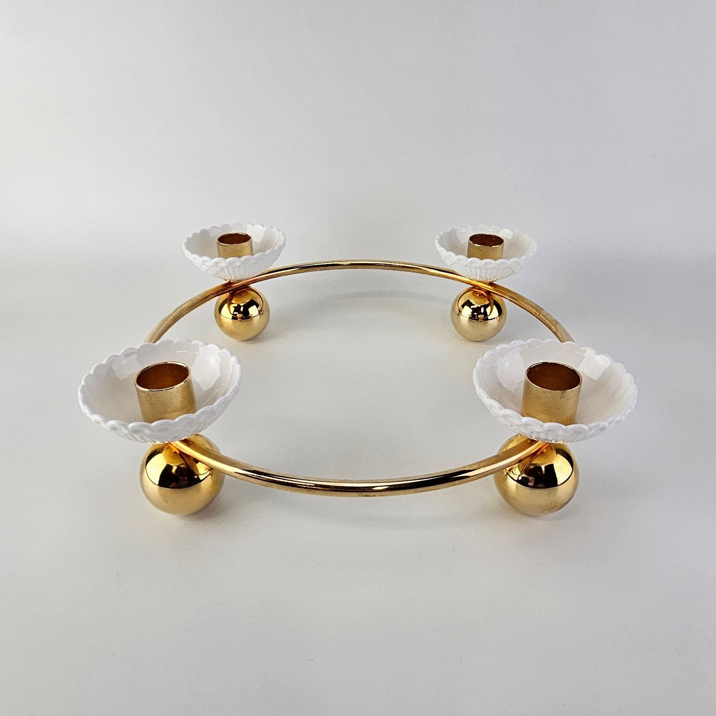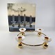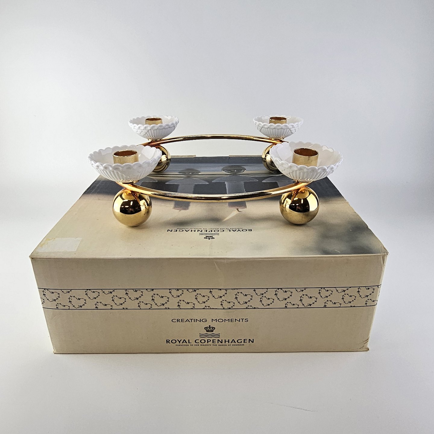 Beskrivelse: Rund lysestage i forgyldt messing med plads til fire lys i små hvide skåle af kongeligt porcelæn. Stagen er fra serien Creating Moments og kommer i original kasse