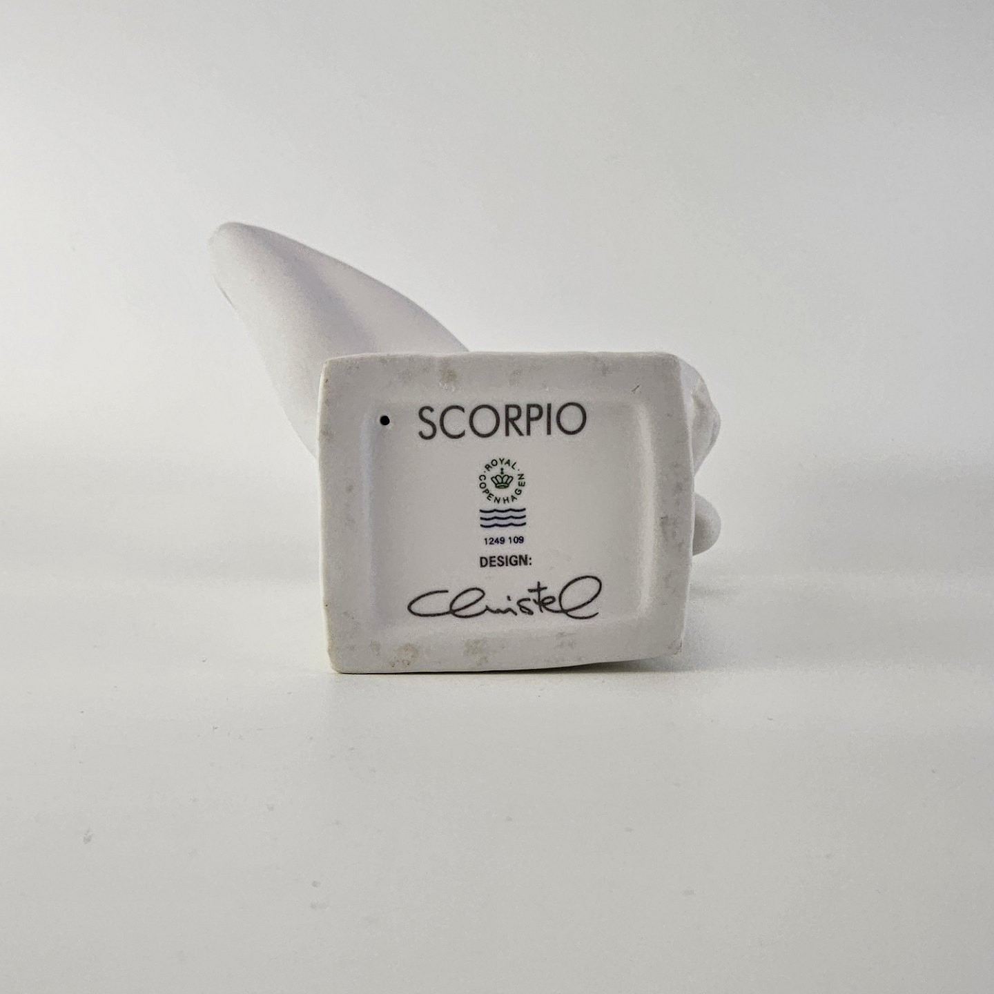 Beskrivelse: Figur i hvidt kongeligt porcelæn med motiv af stjernetegnet skorpionen og titlen Scorpio