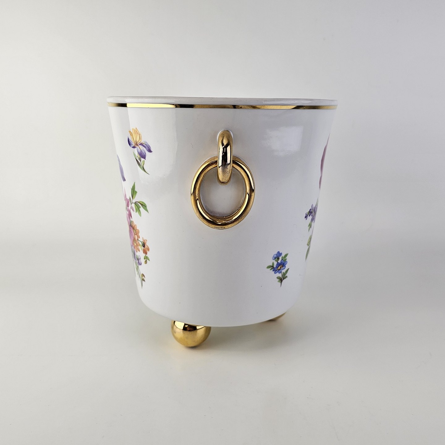 Beskrivelse: Urtepotteskjuler i porcelæn med farverigt blomstermotiv med tre guldbelagt kuglefødder og to guldbelagt hanke,