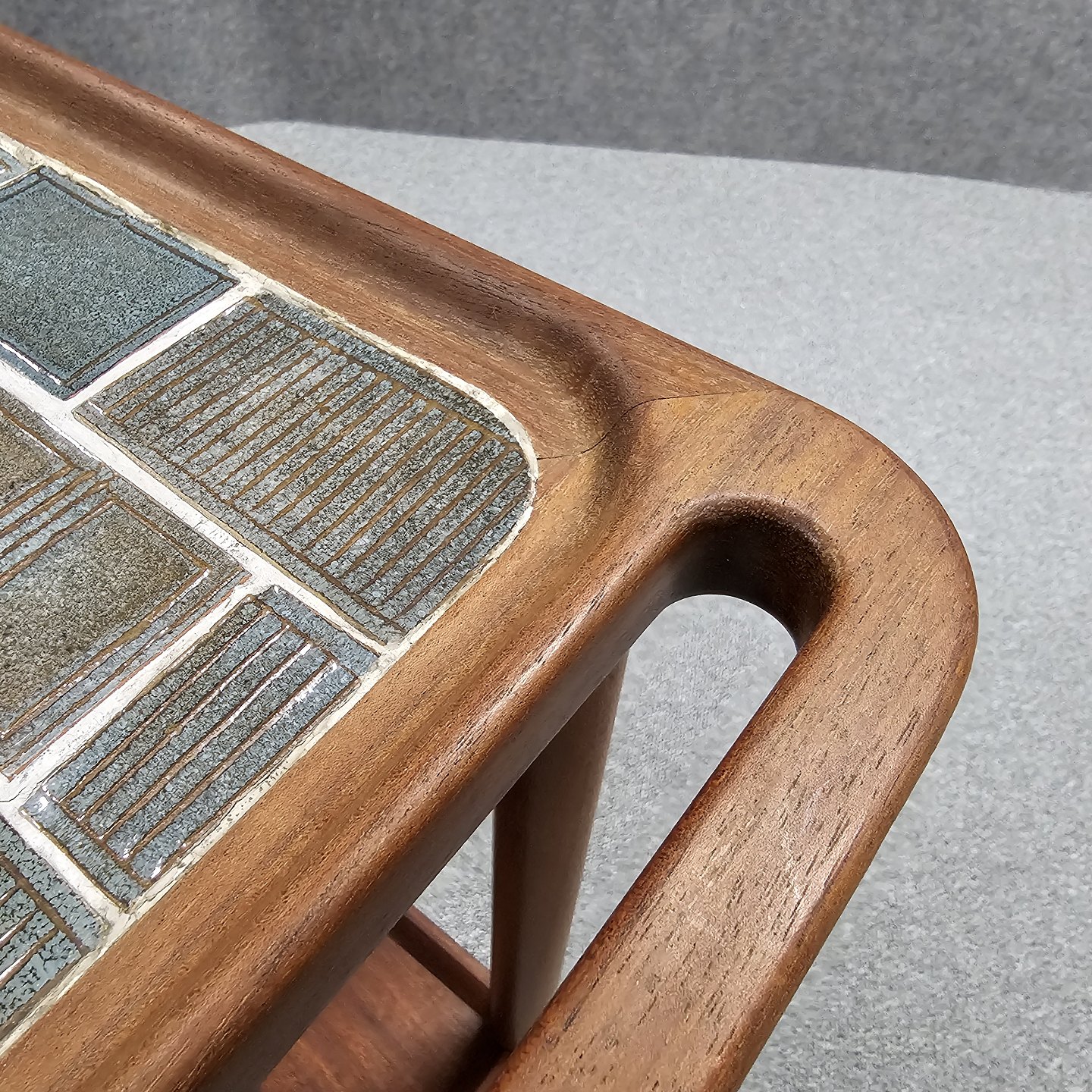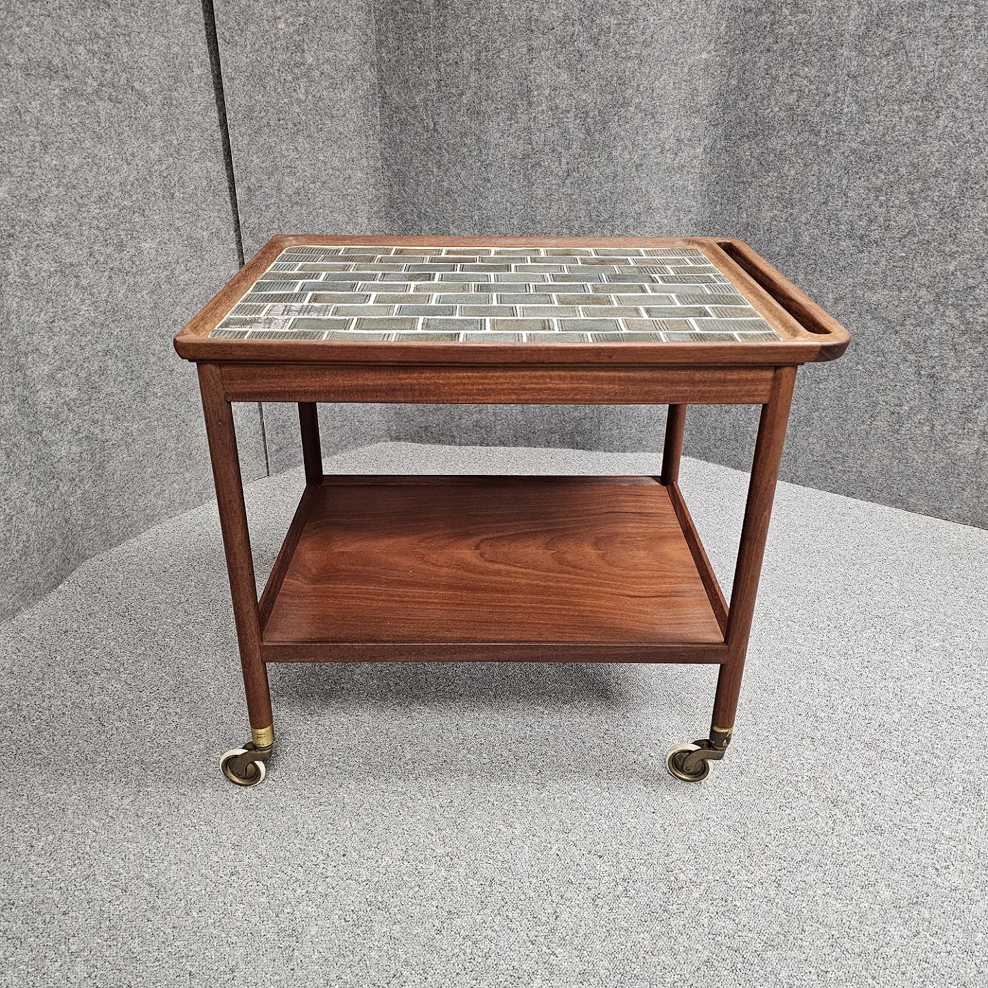 Beskrivelse: Rullebord i teak dekoreret med kakler i grønlige nuancer