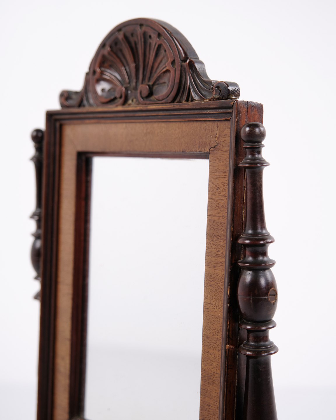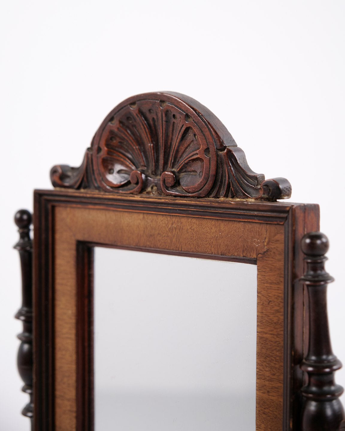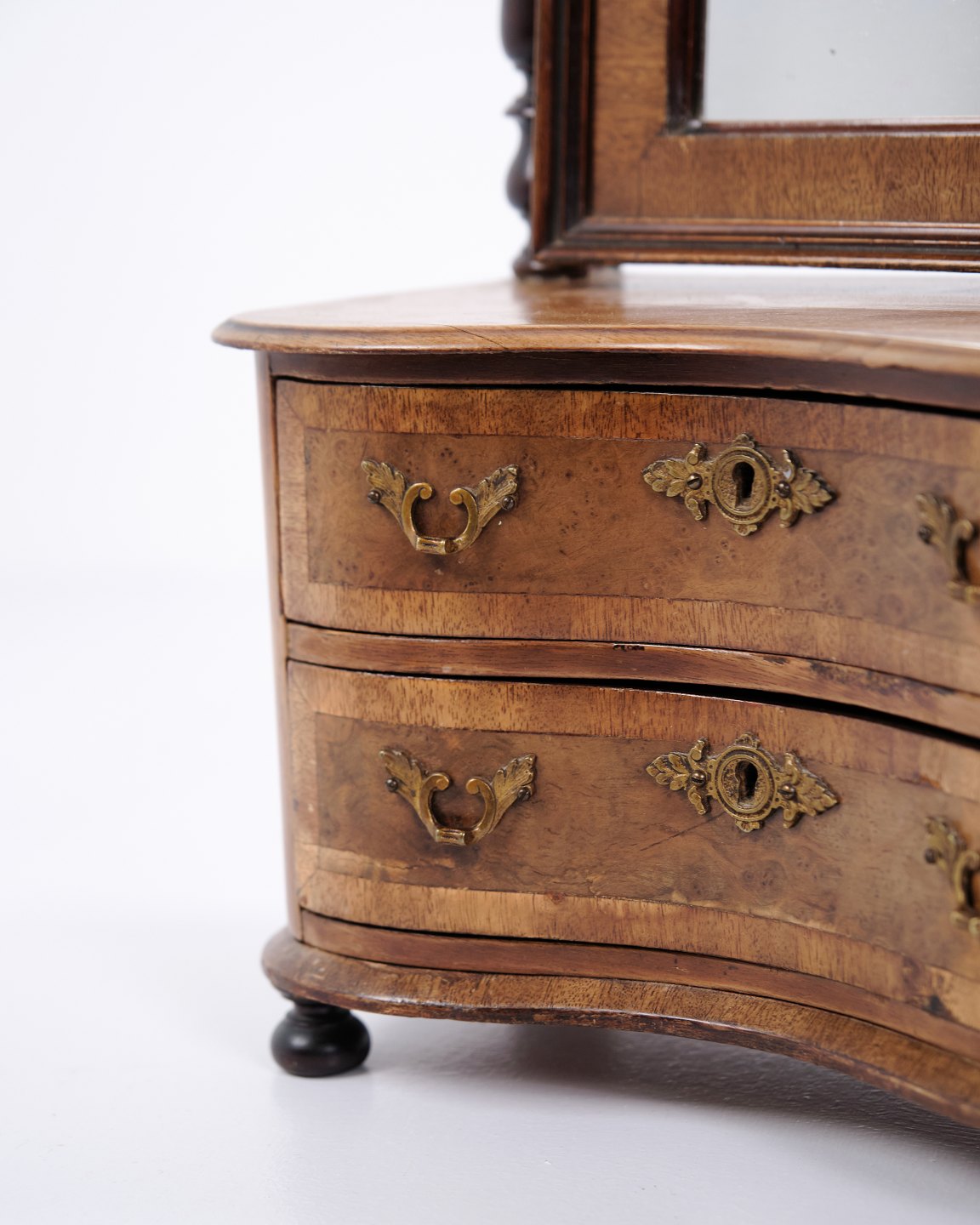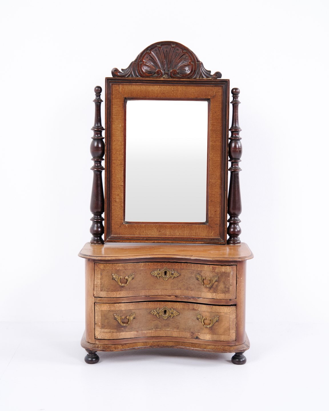 Beskrivelse: Lille barnemøbel fra ca. 1860, udført i mahogni med spejl og to skuffer. Et dekorativt og sjældent antikt møbel med fine detaljer, velegnet som samlerobjekt eller til klassisk indretning.