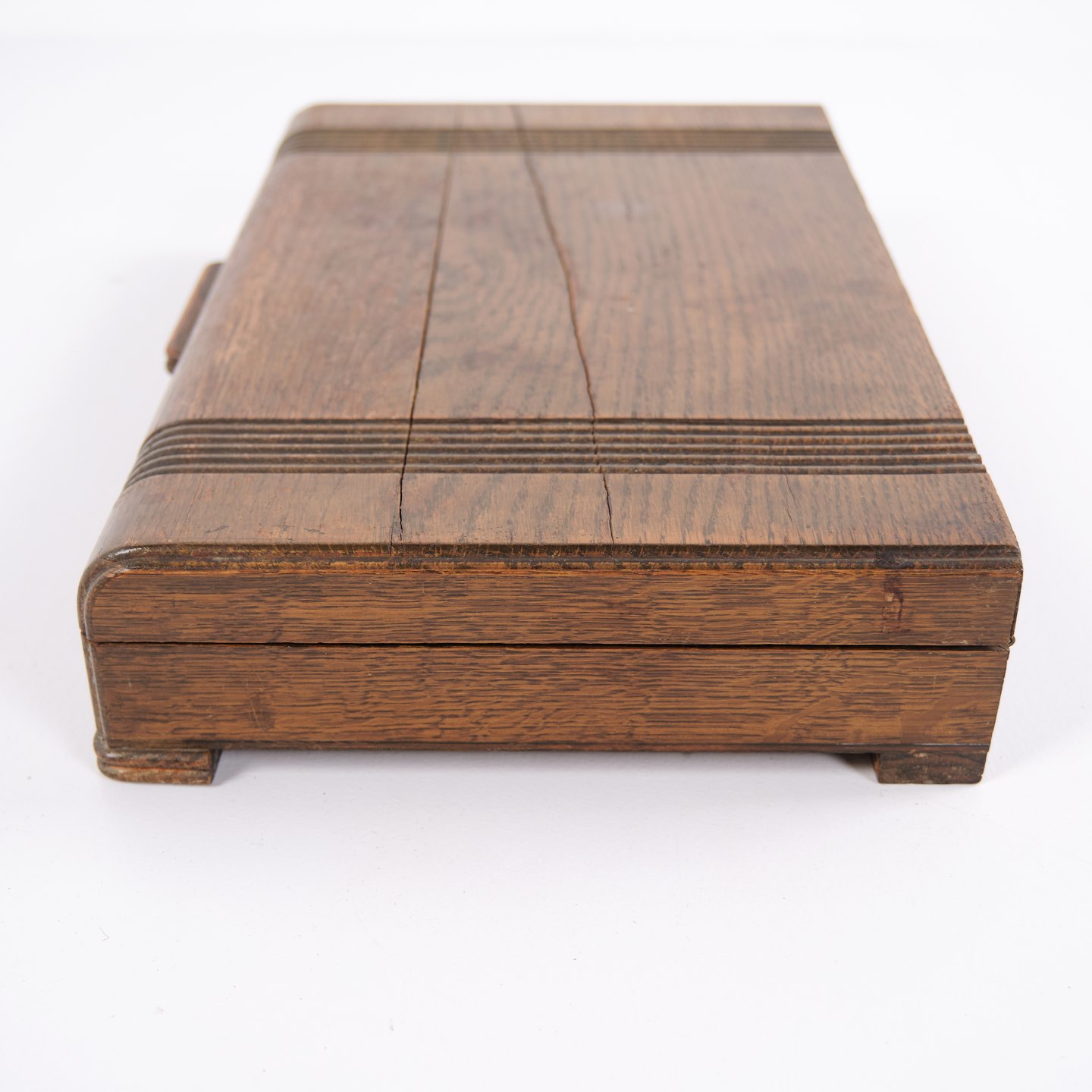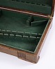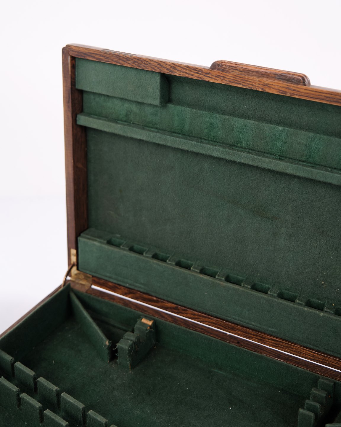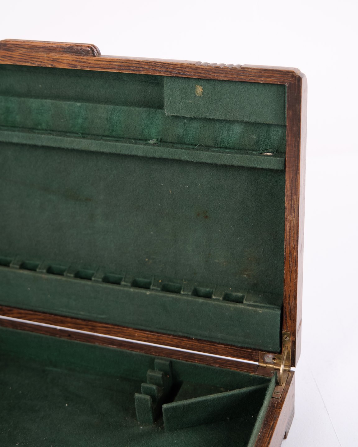 Description: Antique cutlery box in oak with green interior and brass fittings. Ideal for storing cutlery, silverware or small items. Solid craftsmanship with a decorative look.