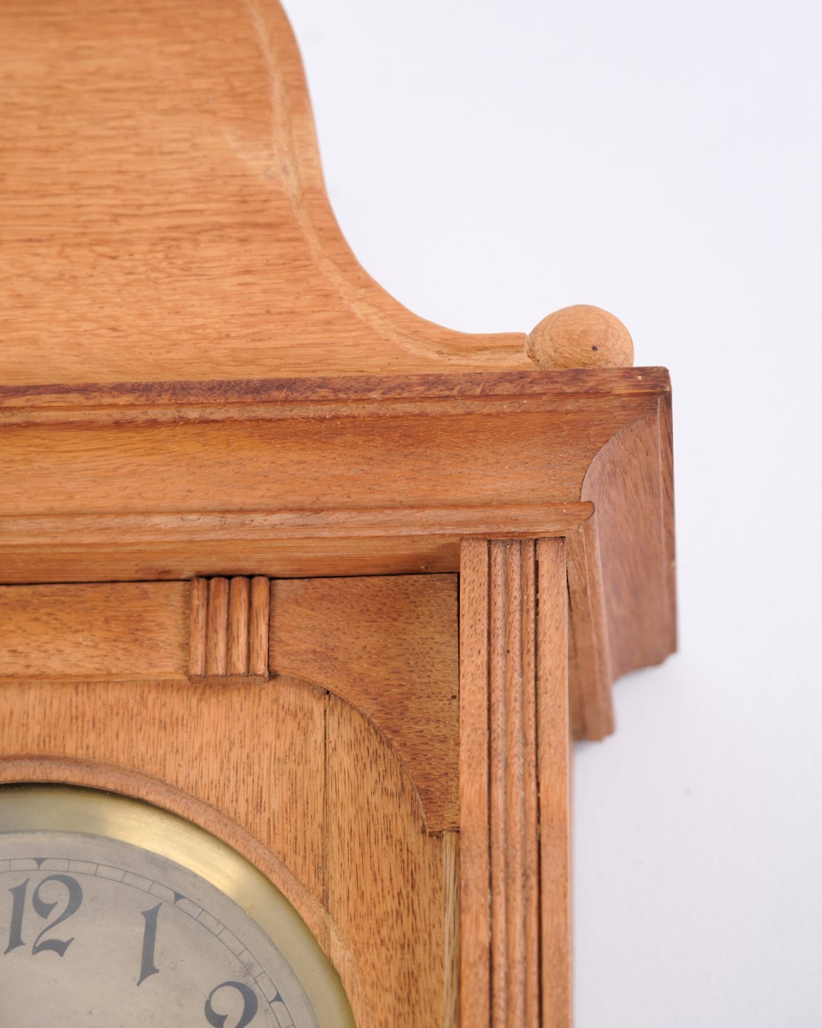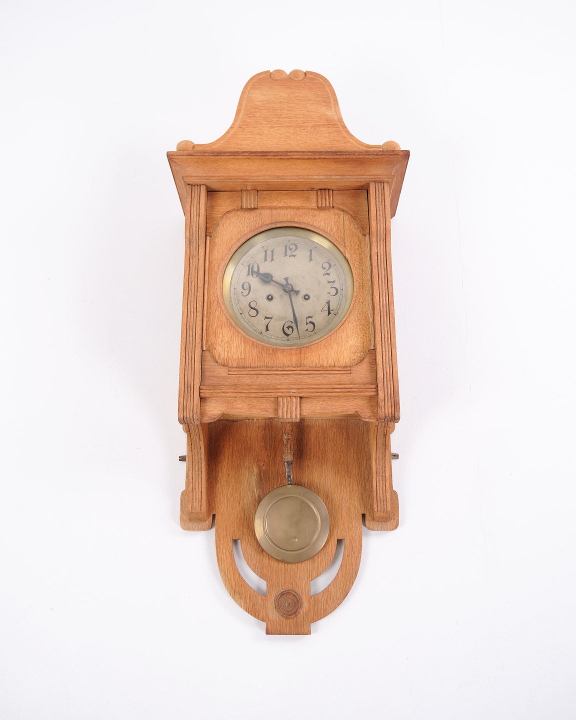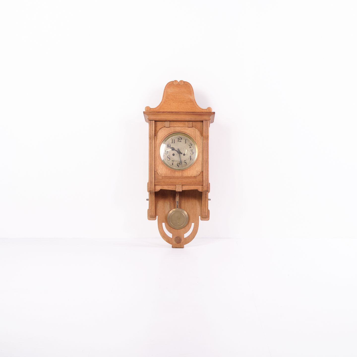 Beskrivelse: Vægur fra begyndelsen af 1930-tallet, udført i egetræ og designet i Jugendstilens karakteristiske organiske formsprog. Urkassen har elegante detaljer og en klassisk front, der understreger perioden og håndværket.