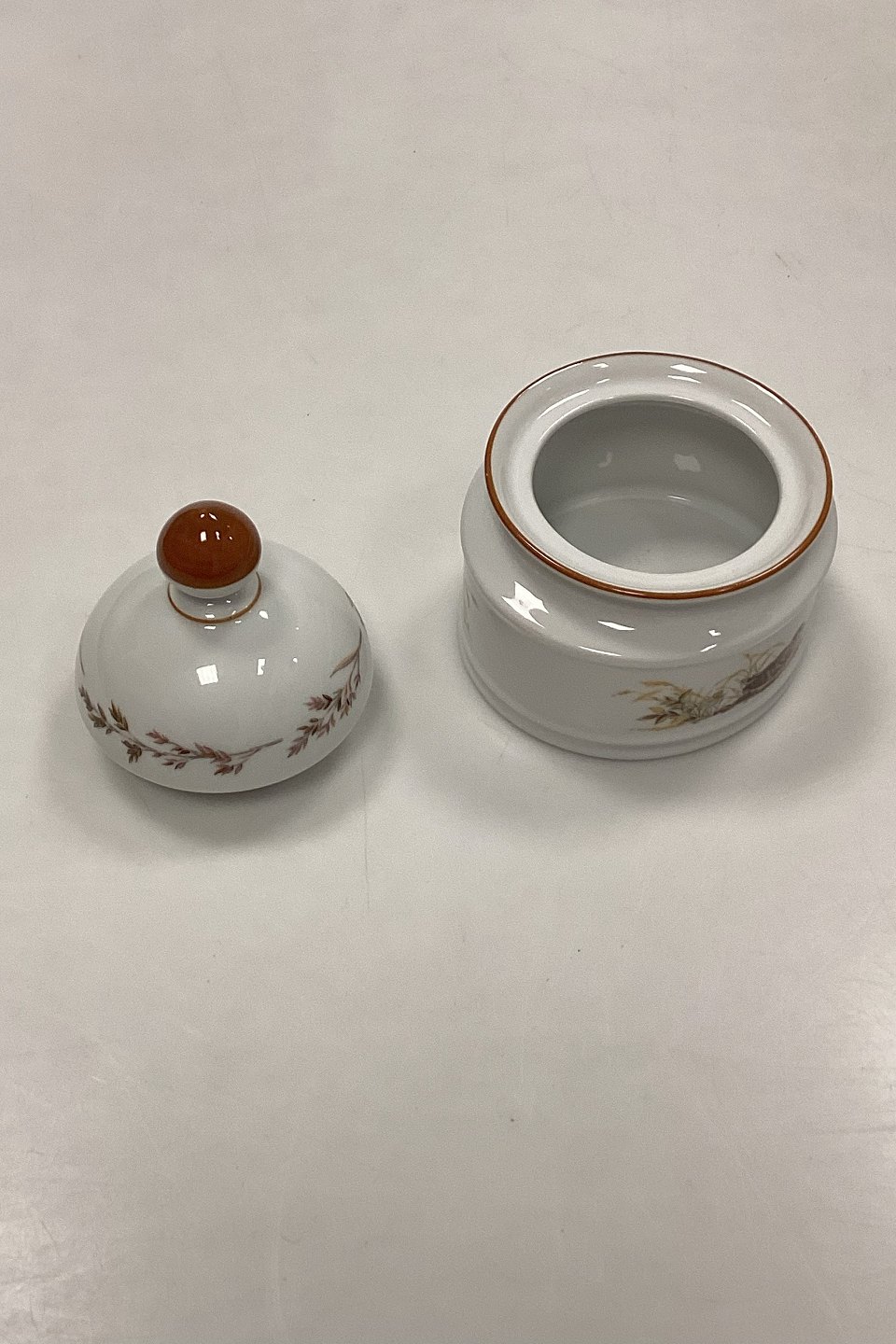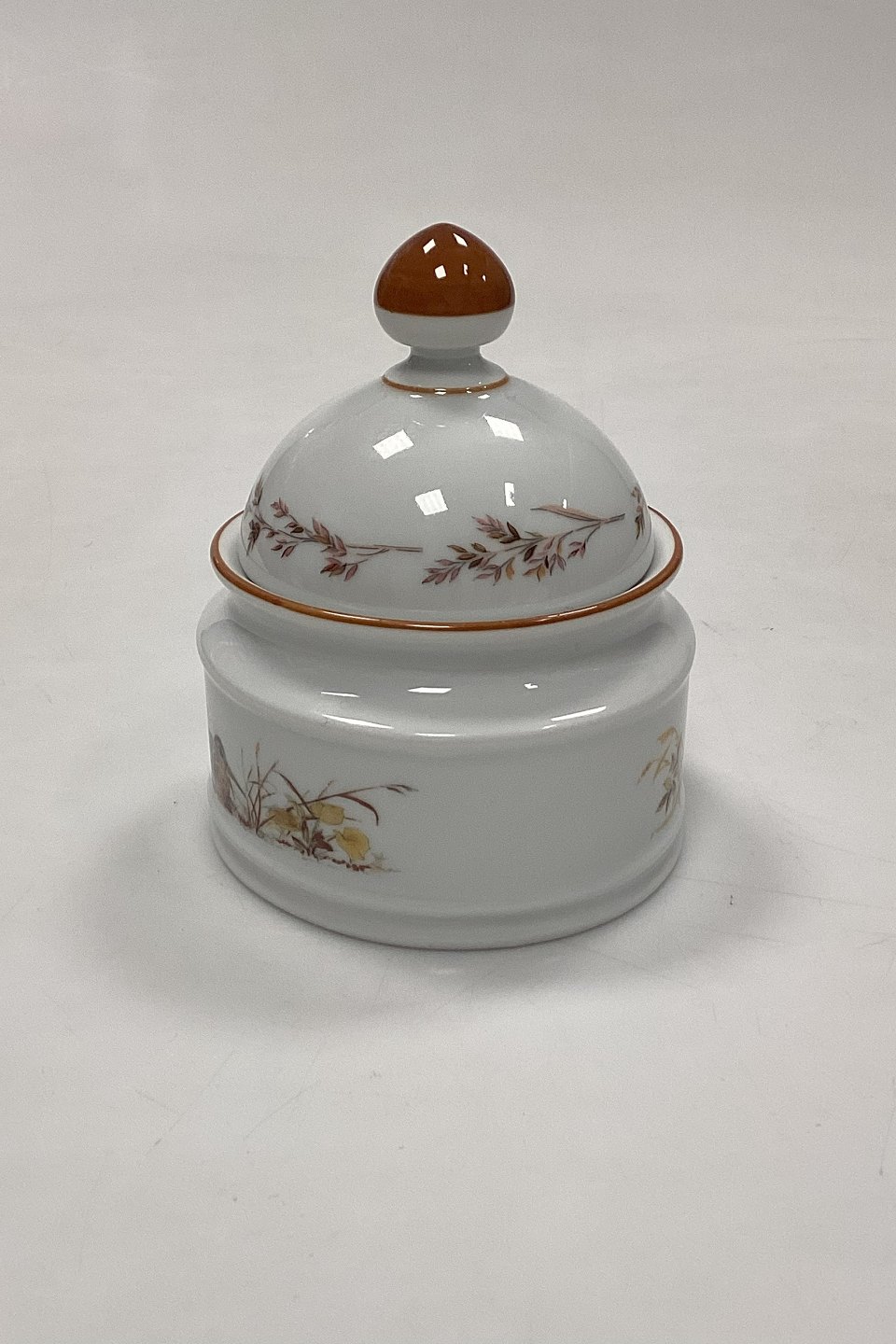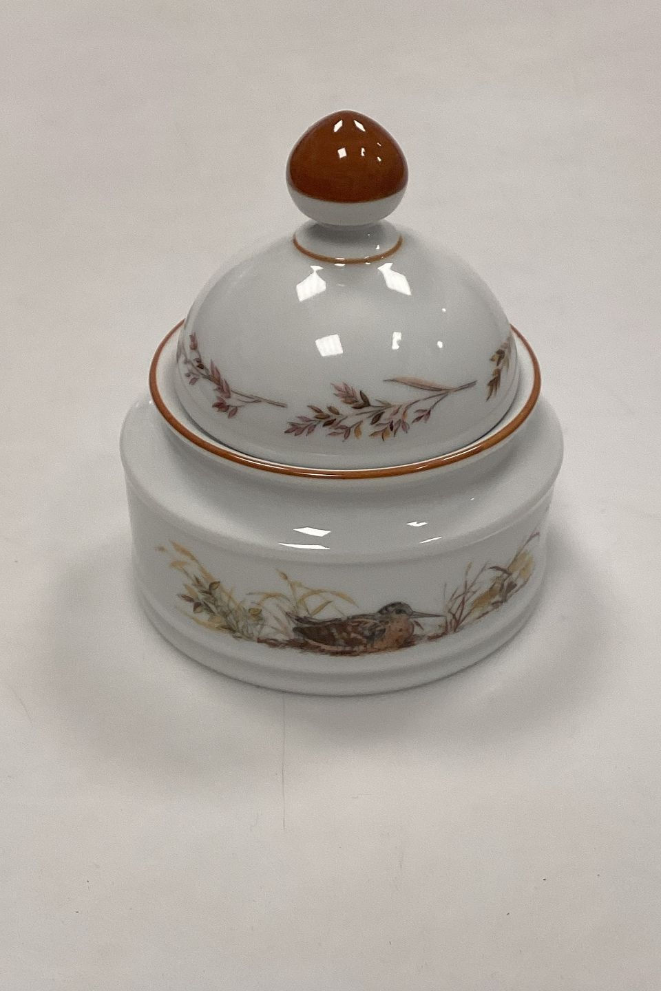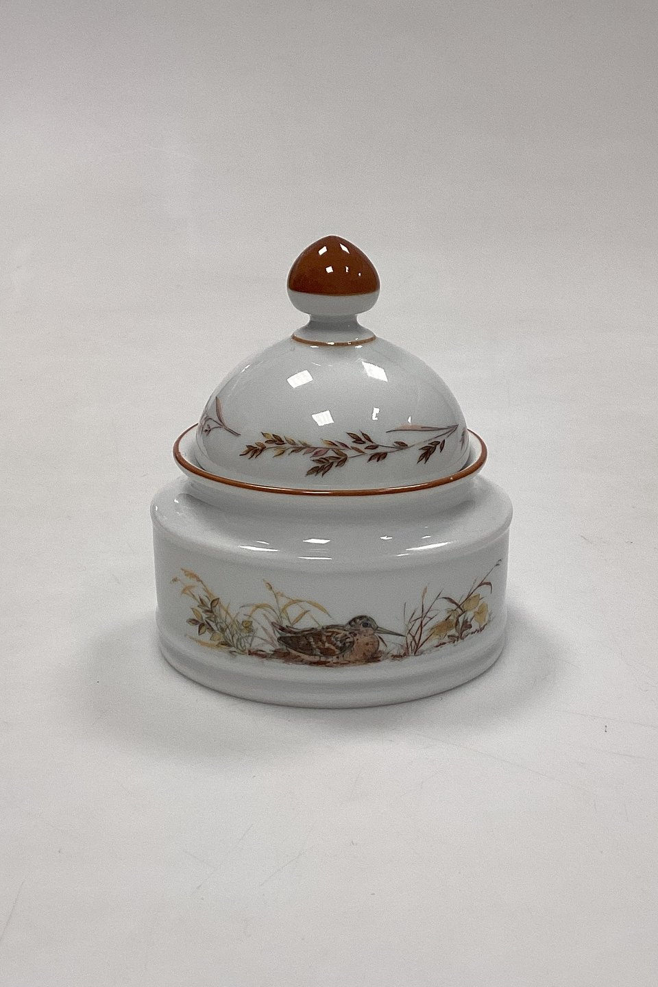 Description: Mads Stage Sugar Bowl with Lid - Woodcock. Latin: Scolopax Rusticola. Produced for Imerco Denmark