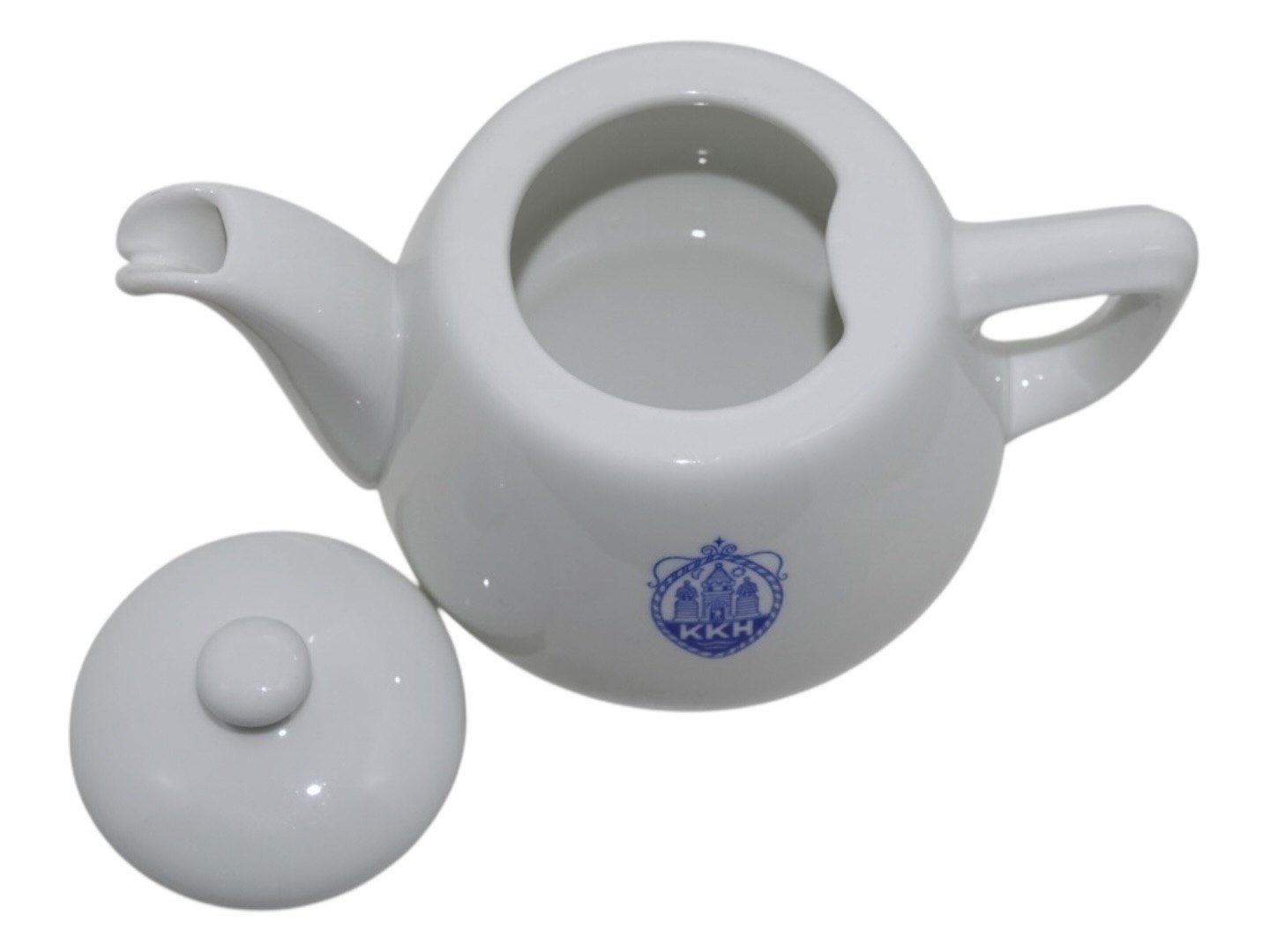 Description: Royal Copenhagen small white teapot in thick porcelain with logo on the side (KKH = Københavns Kommune Hospital).