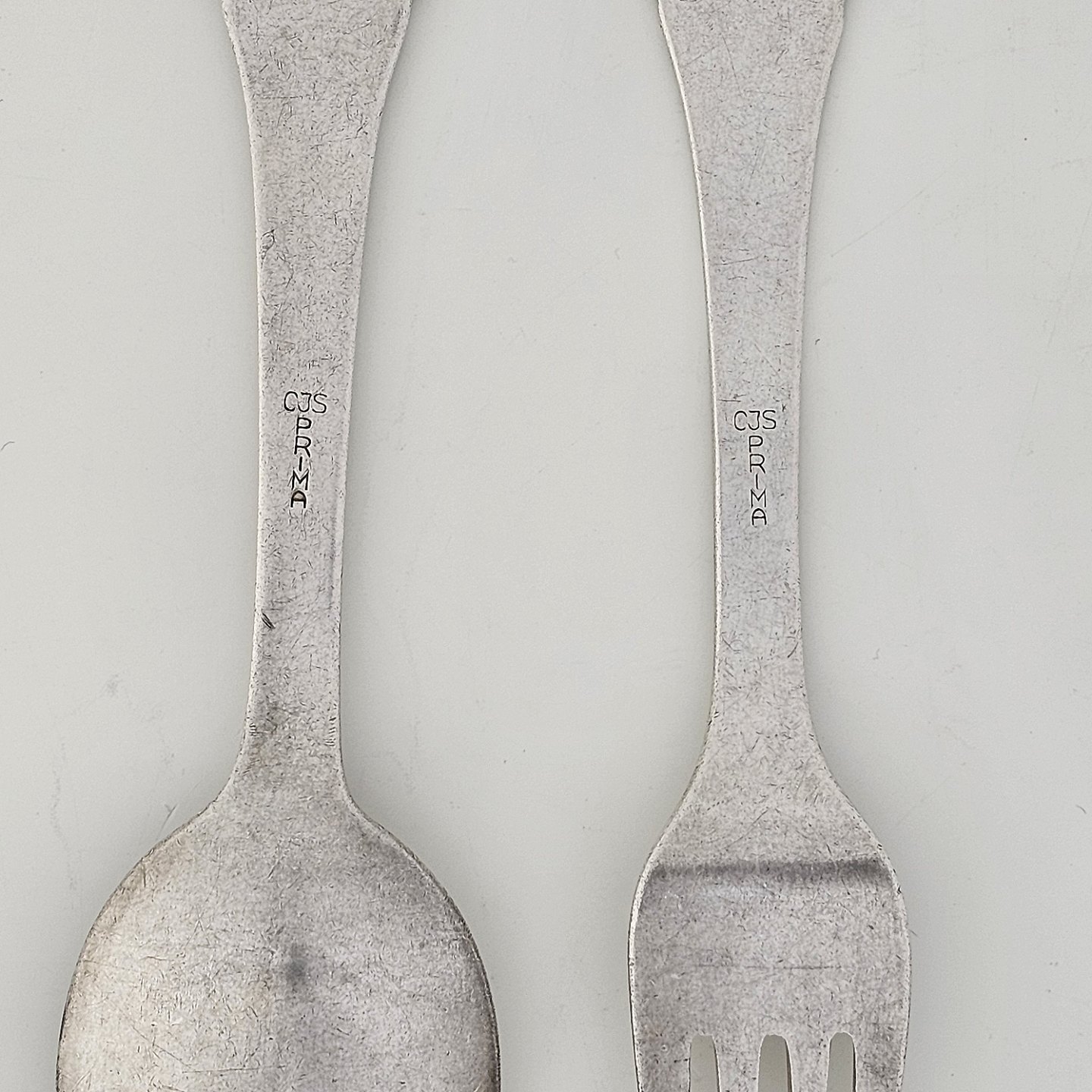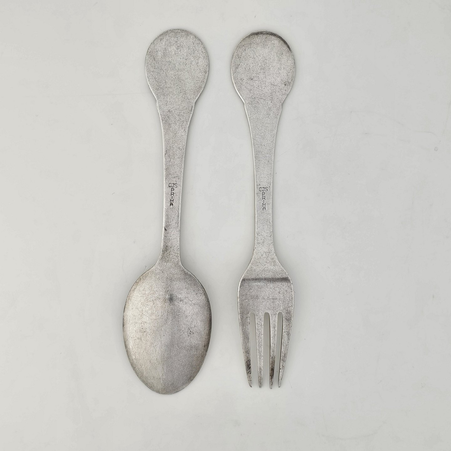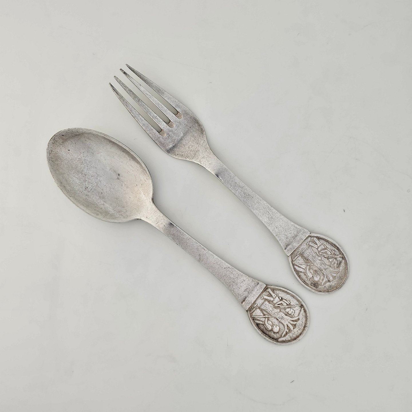 Beskrivelse: Gaffel og ske af pletsølv med motiv af H.C. Andersens Fyrtøjet