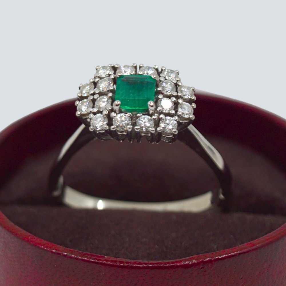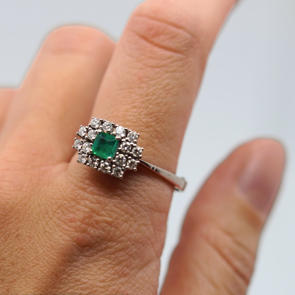 Beskrivelse: Carl Antonsen; Ring i 14 kt. hvidguld, prydet med diamanter og smaragd. Omkring ring str. 61. Med aftagelig skinne, som gør ringens størrelse mere fleksibel.