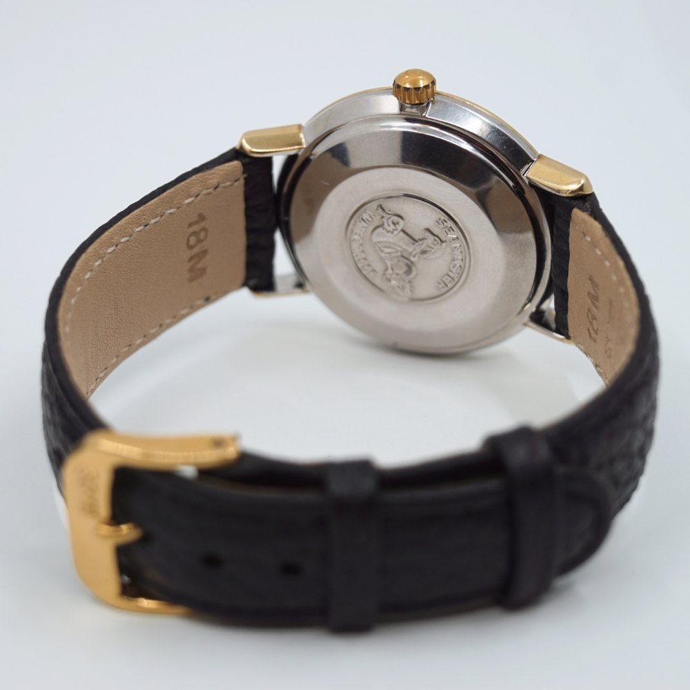 Beskrivelse: Omega armbåndsur, model Seamaster De Ville i stål med guld. Ref. 166-020. Cal: 565-1. Omega herreur årgang 1968. Automatic. Diameter 34 mm. Med sort læderrem.