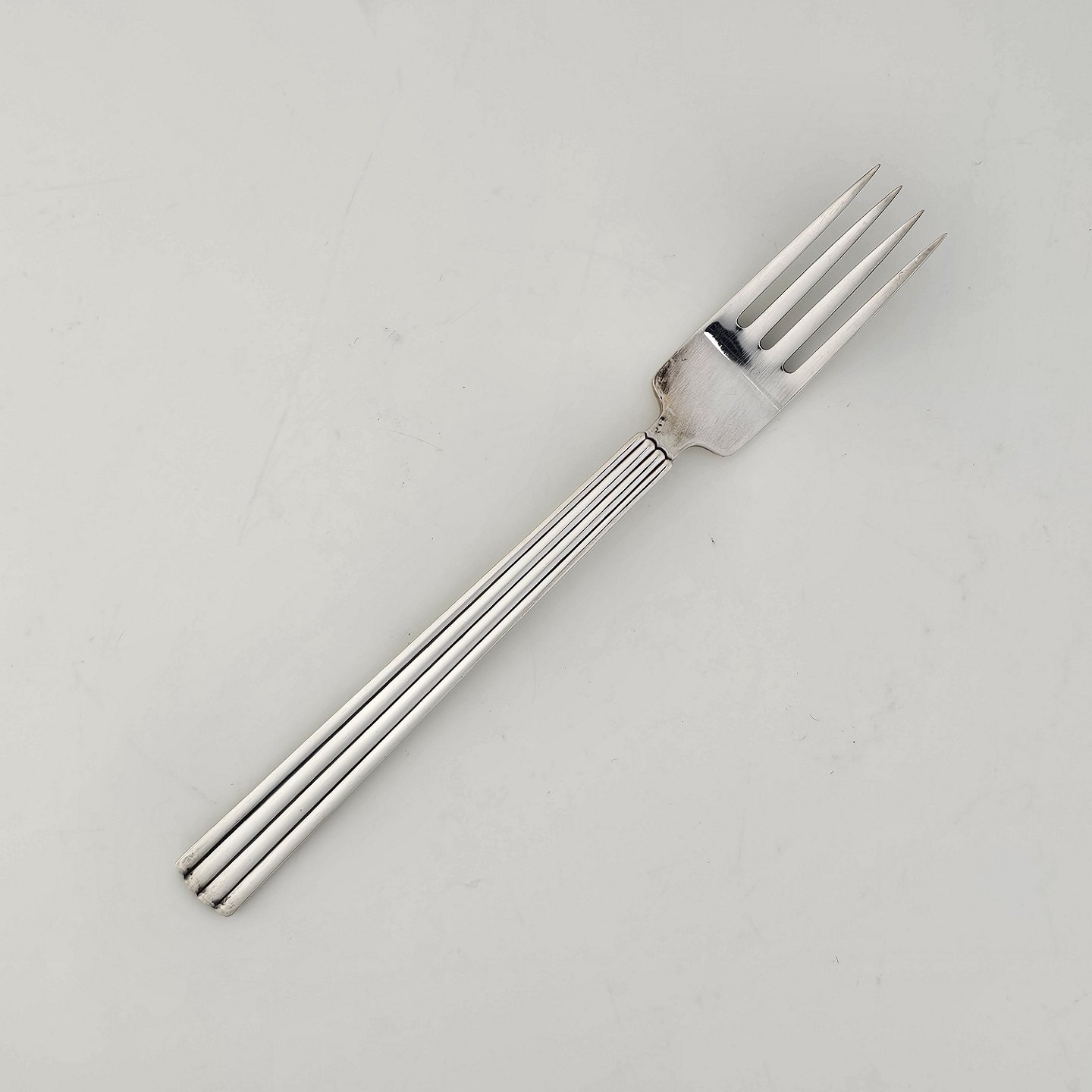 Beskrivelse: Barnegaffel i sterling sølv skaft dekoreret med striber