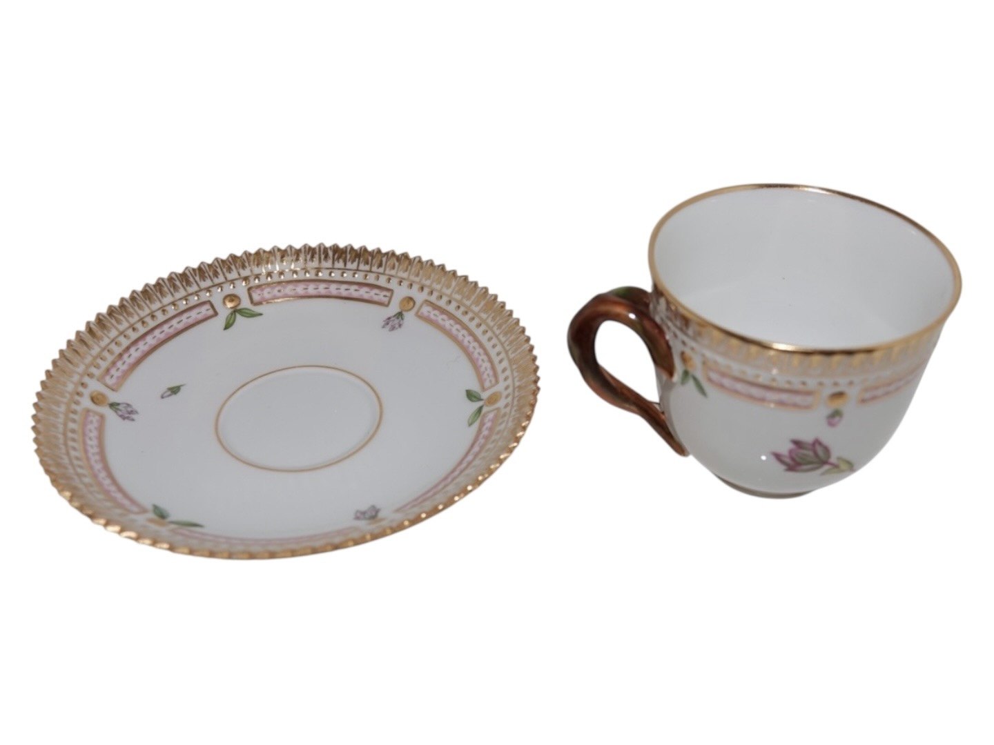 Beskrivelse: Royal Copenhagen Flora Danica, lille espressokop med underkop.