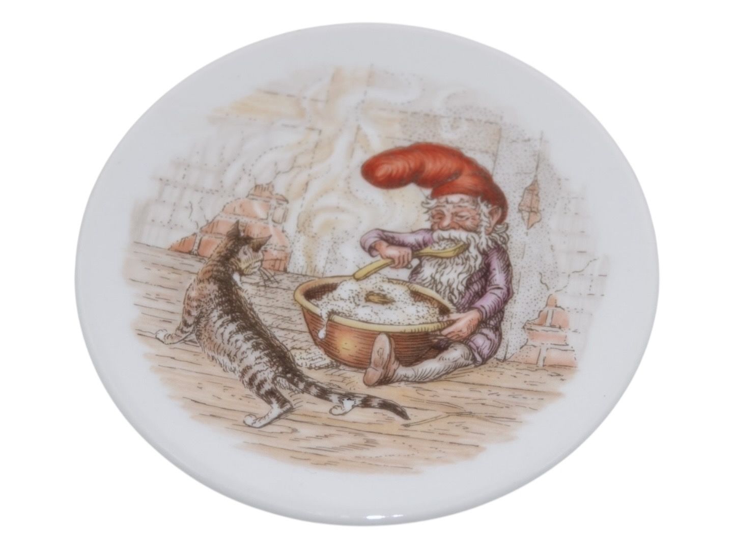 Beskrivelse: Royal Copenhagen julestel, lille asiet med julenisse, risengrød og kat.