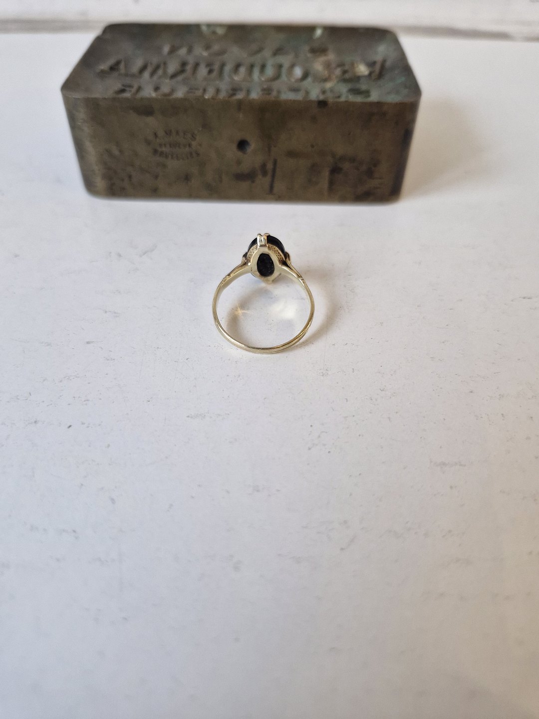 Beskrivelse: Smuk gammel ring i 14 kt. guld med oval onyx prydet med gammel slebet diamant