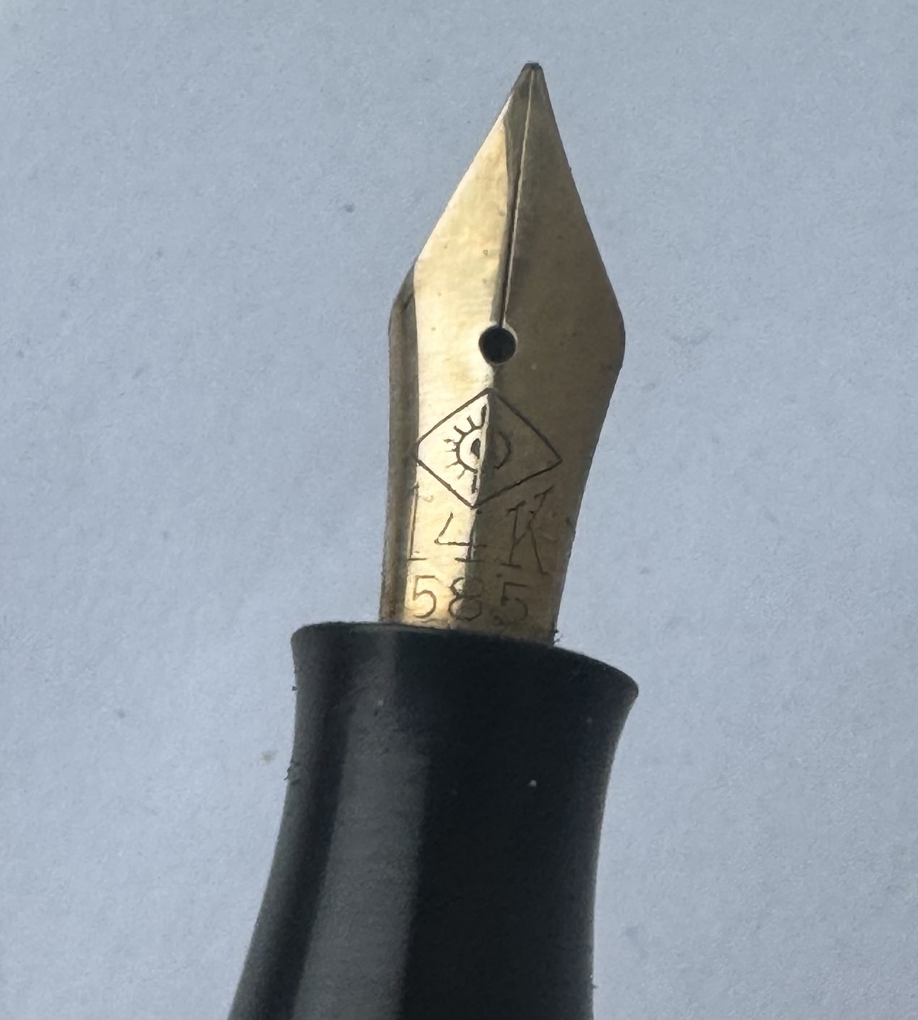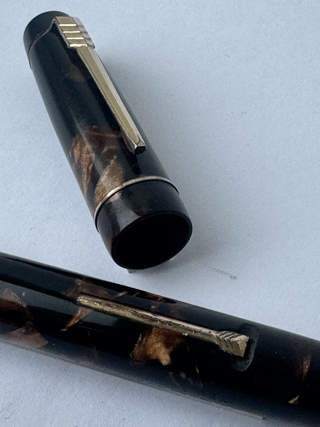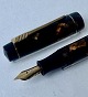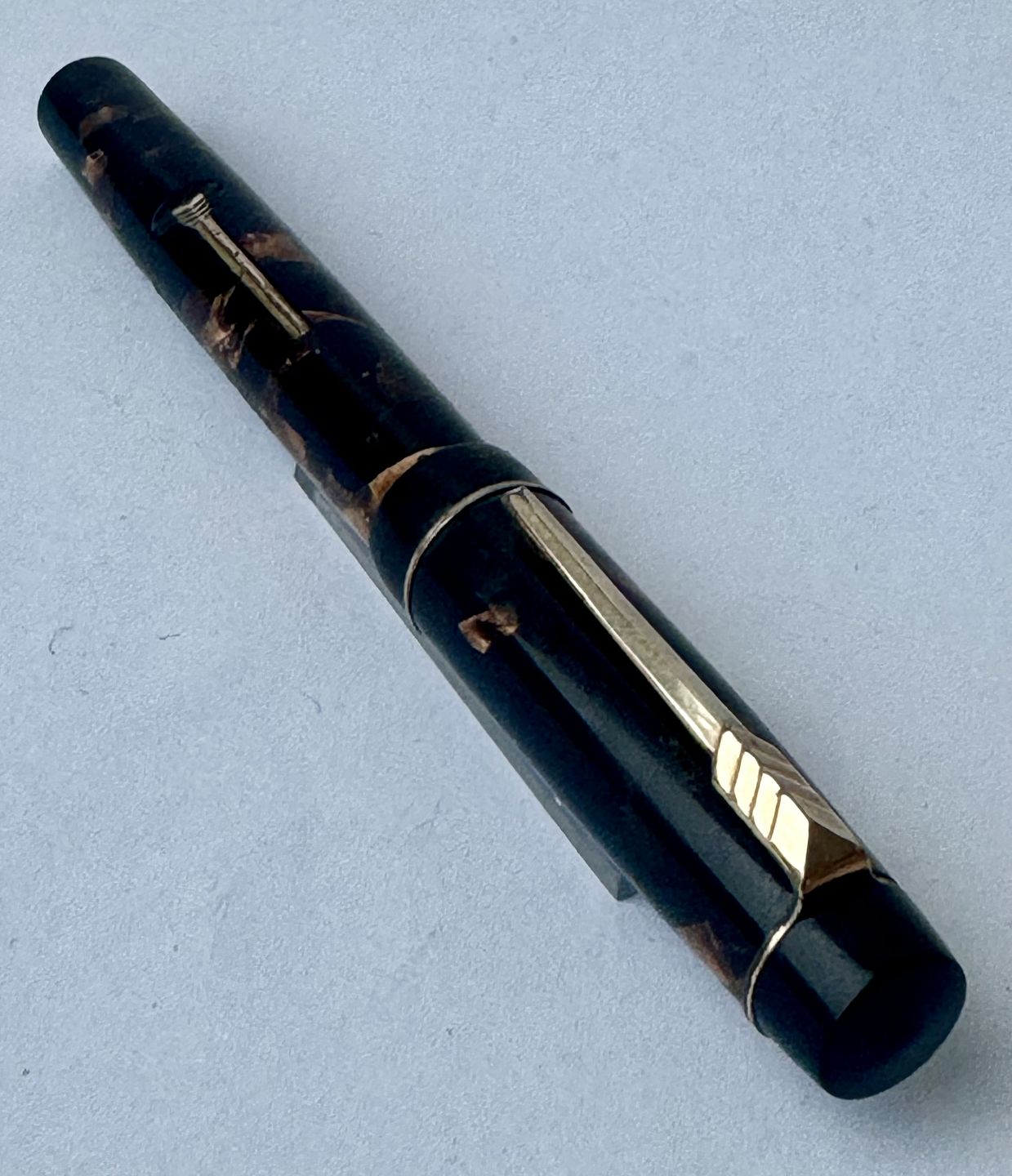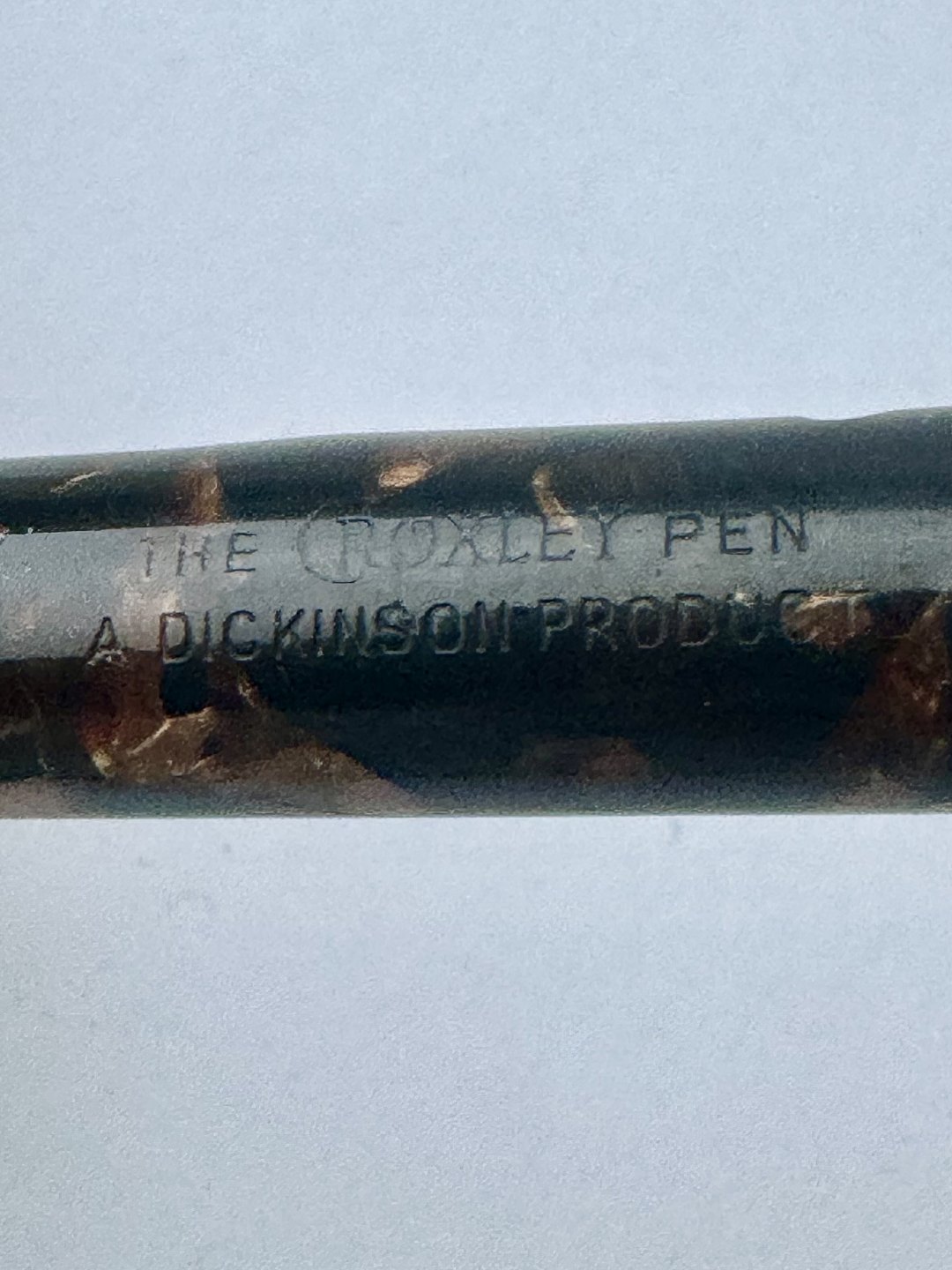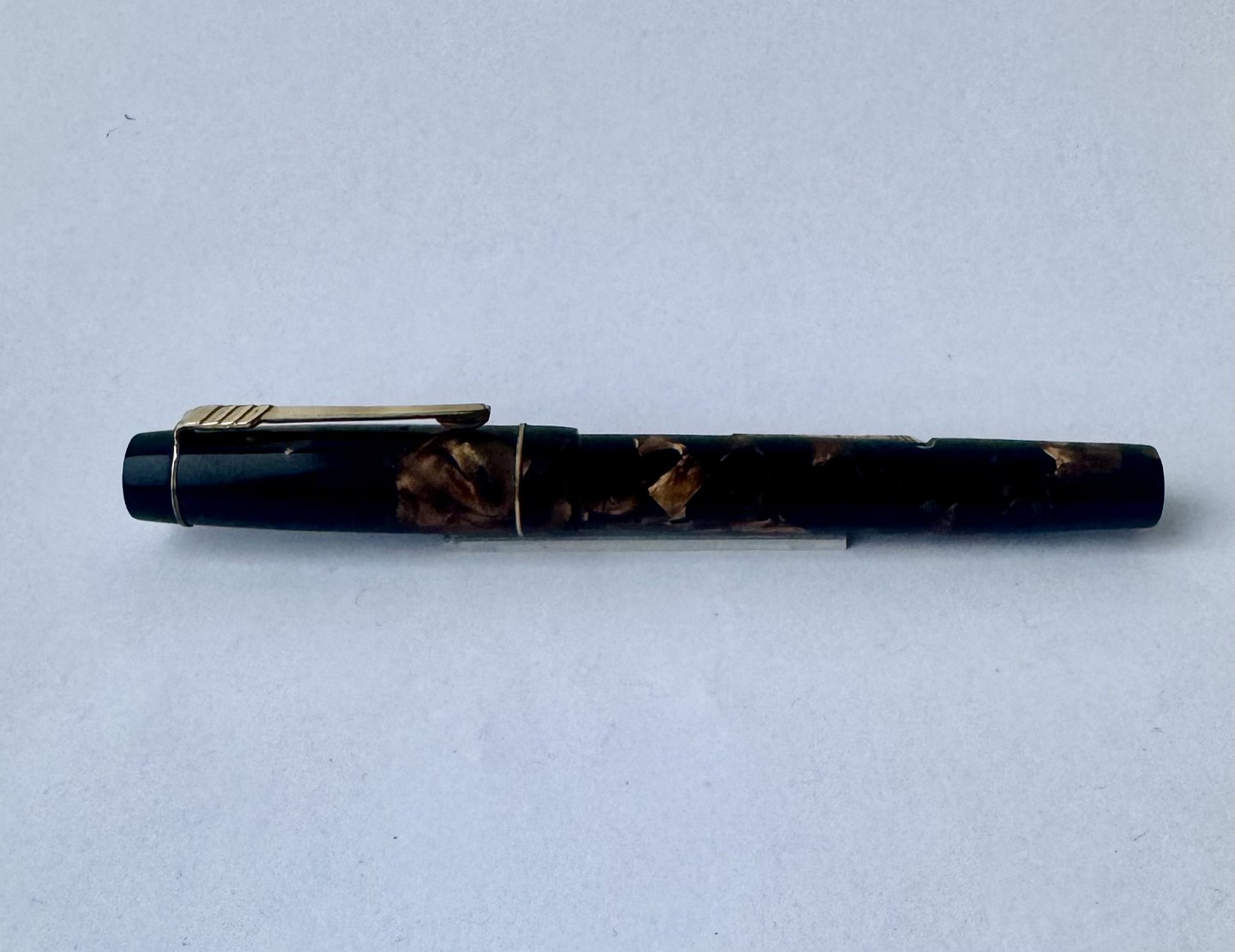 Description: Black and brown marbled Croxley fountain pen. Lever filler ink refill system. New rubber sack must be inserted before the pen can absorb ink and write again. Unoriginal 14 carat gold nib. Length: 12.5 cm
