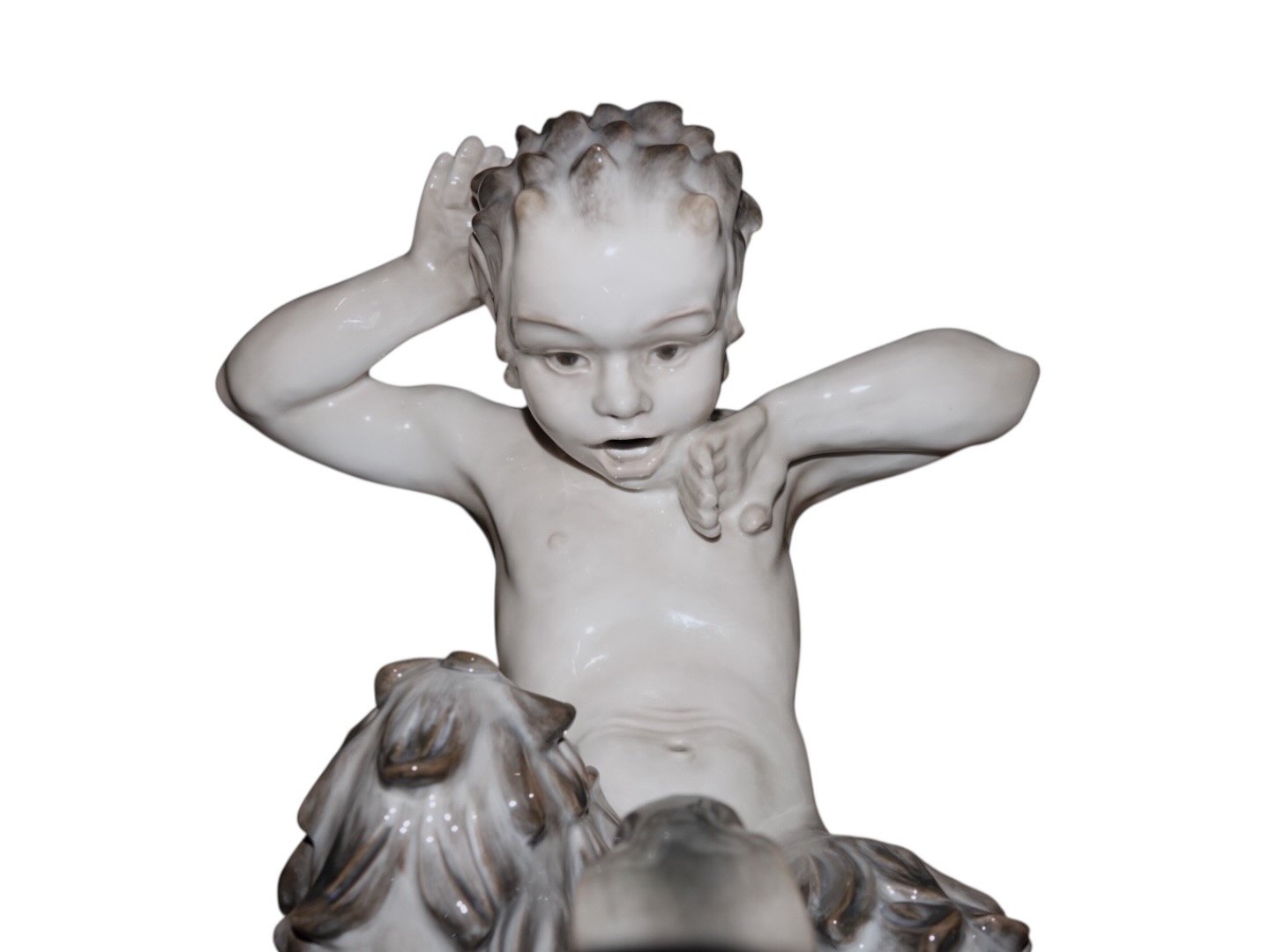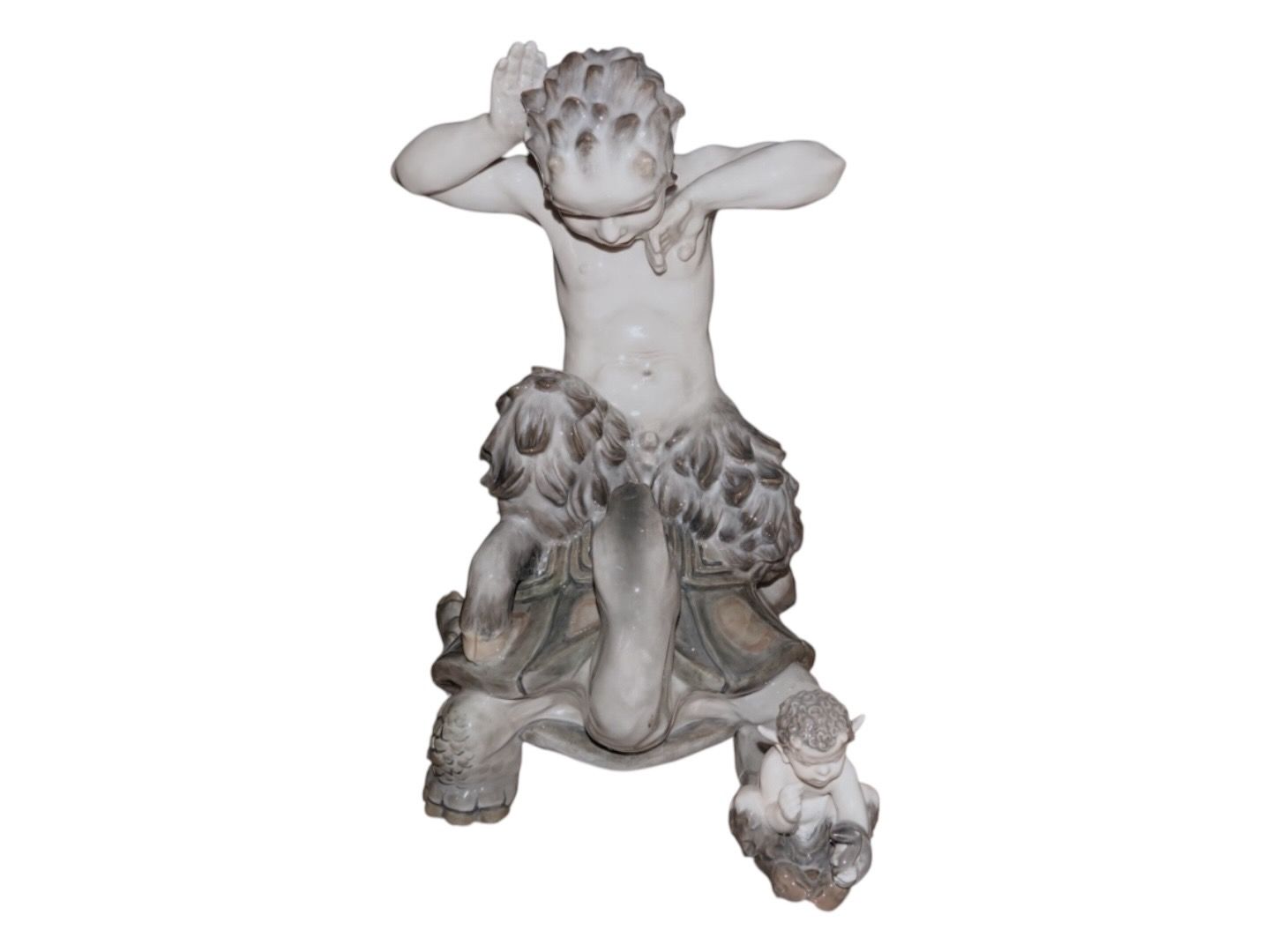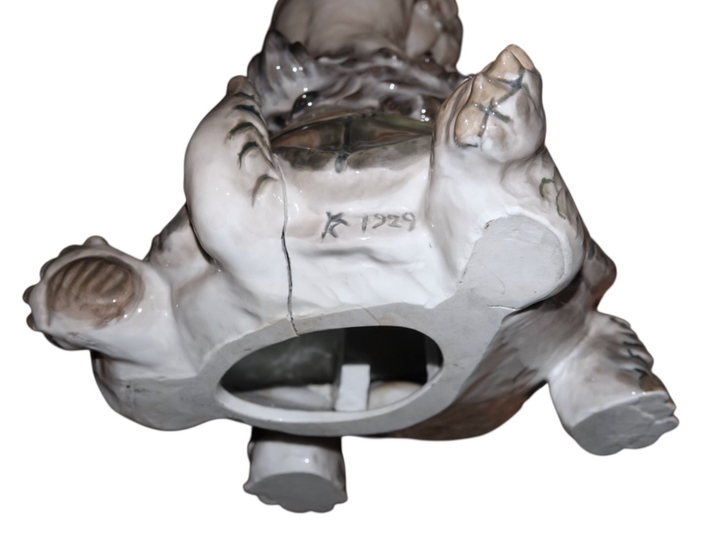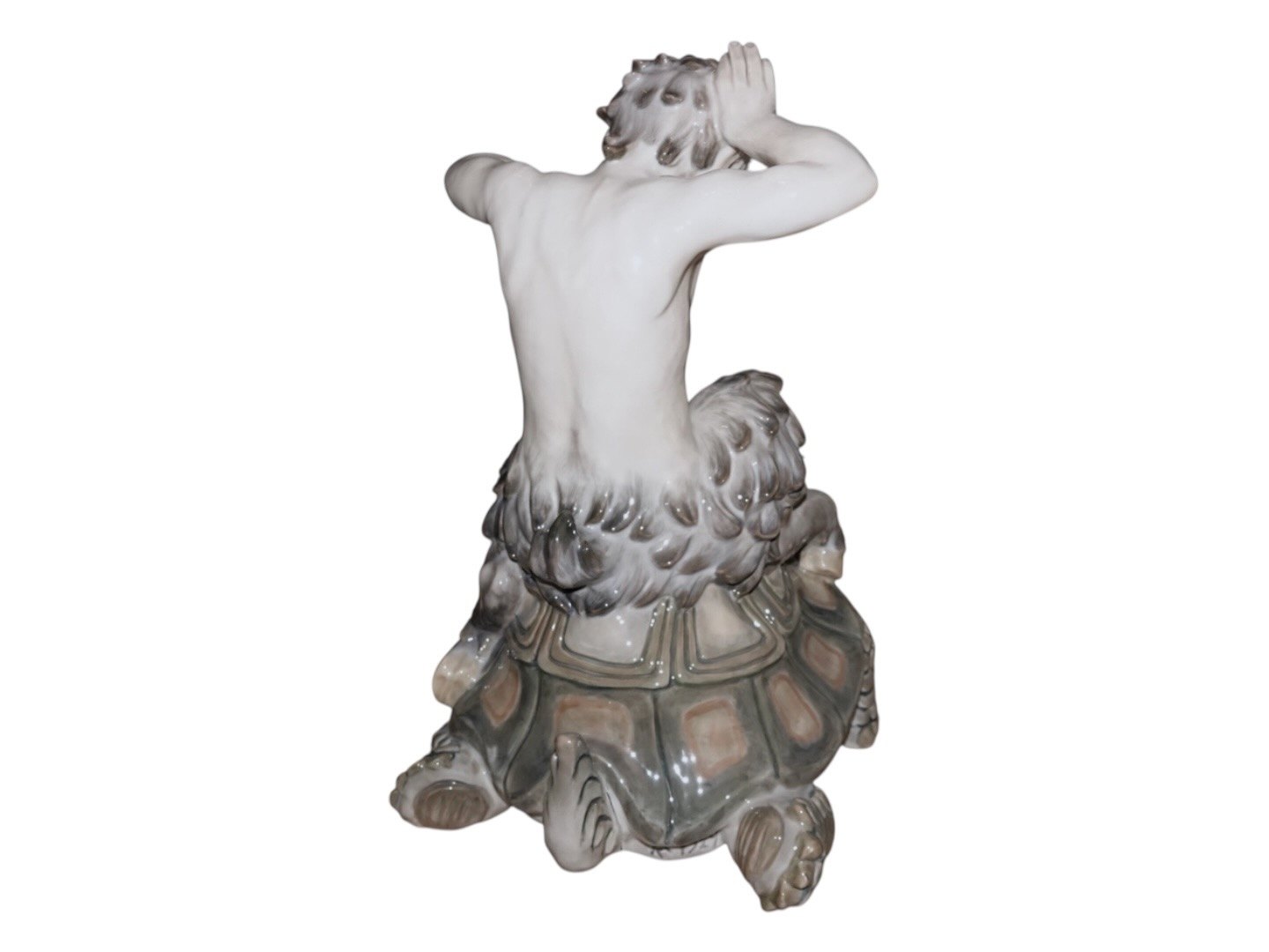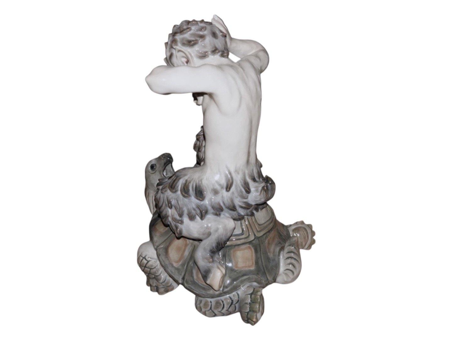 Beskrivelse: Meget sjælden kæmpe Royal Copenhagen figur, pan (faun) der kæmper med en skildpadde. På det første billede er der en "almindelig" pan figur for at illustrere størrelsesforskellen.