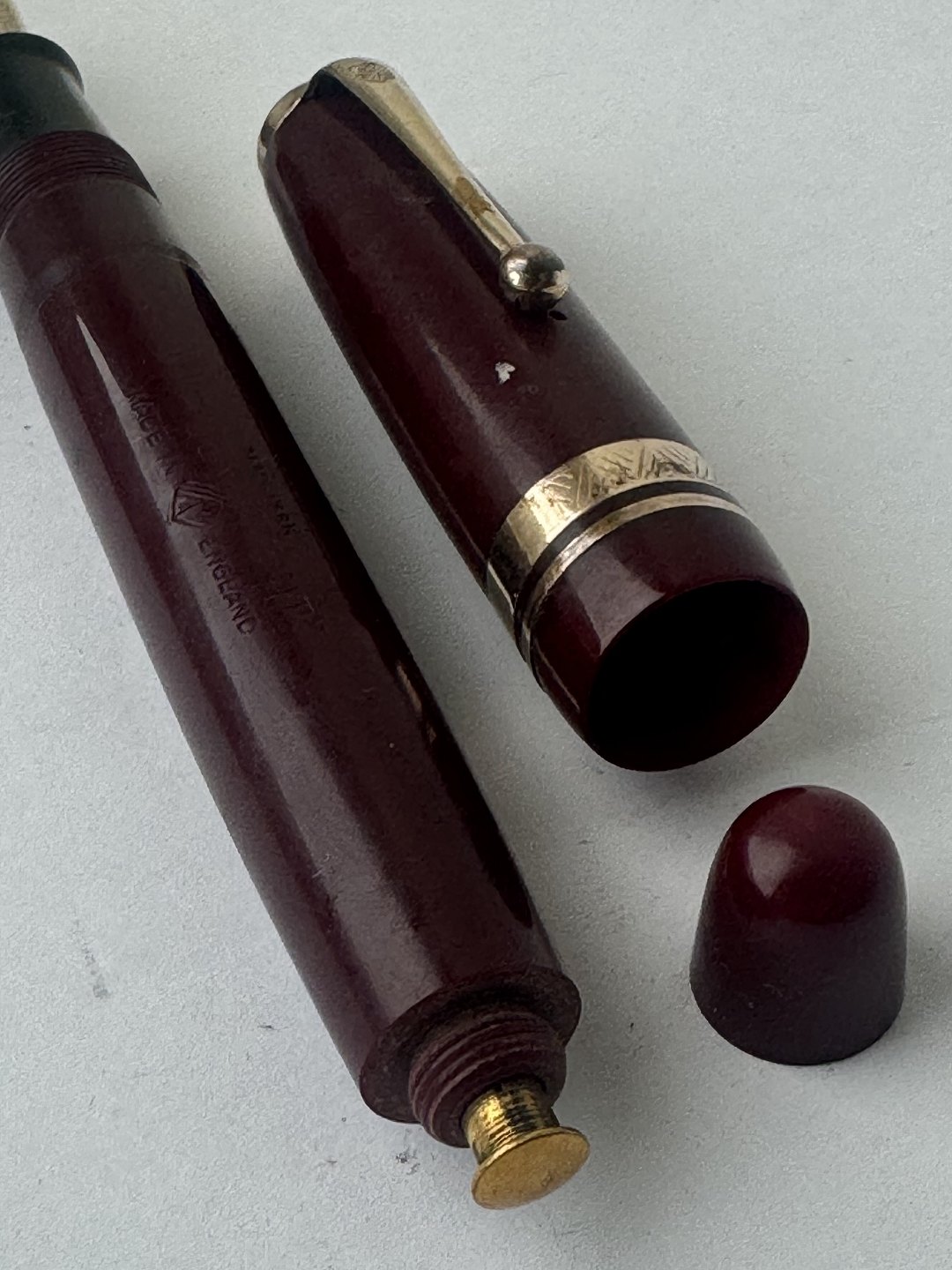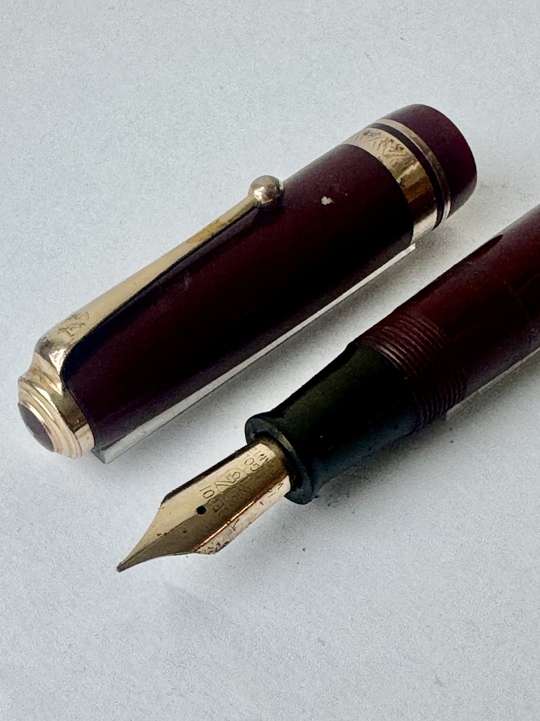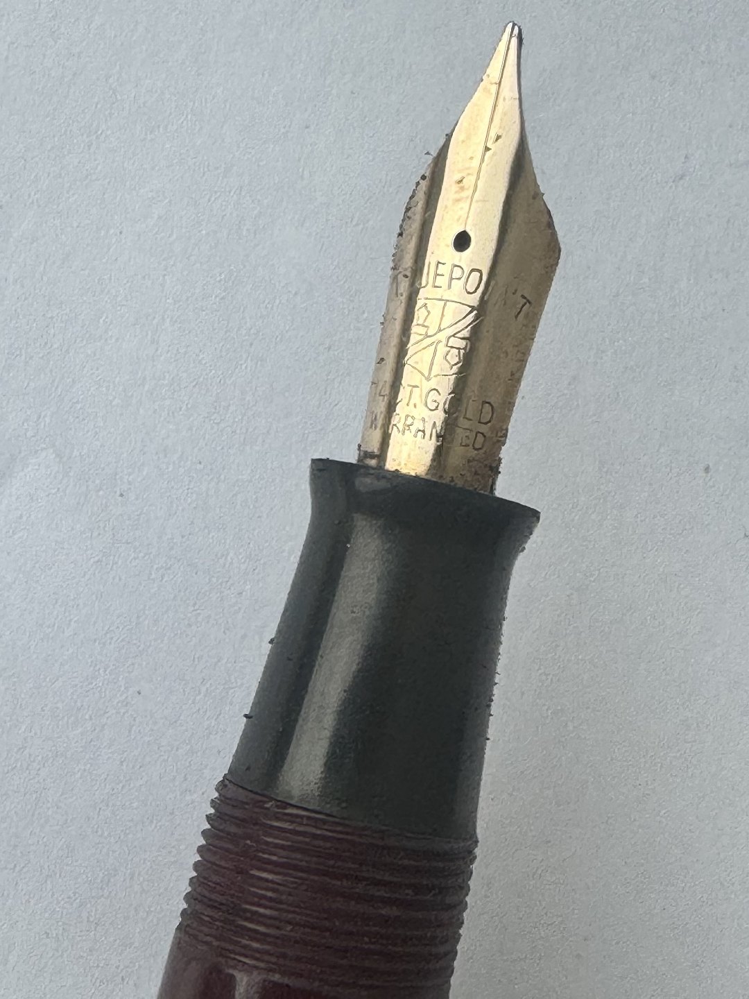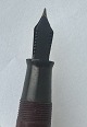 Beskrivelse: Kraftig Bordeaux “True Point” fountain pen. Push button filler. Fremstillet i England omkring 1950. Fremstår i god stand uden skader eller reparationer. Der skal indsættes en ny gummisæk før end fyldepennen igen skal optage blæk og skrive igen. Dette koster ekstra kr. 200, at få udført. Længde: 13,4 cm