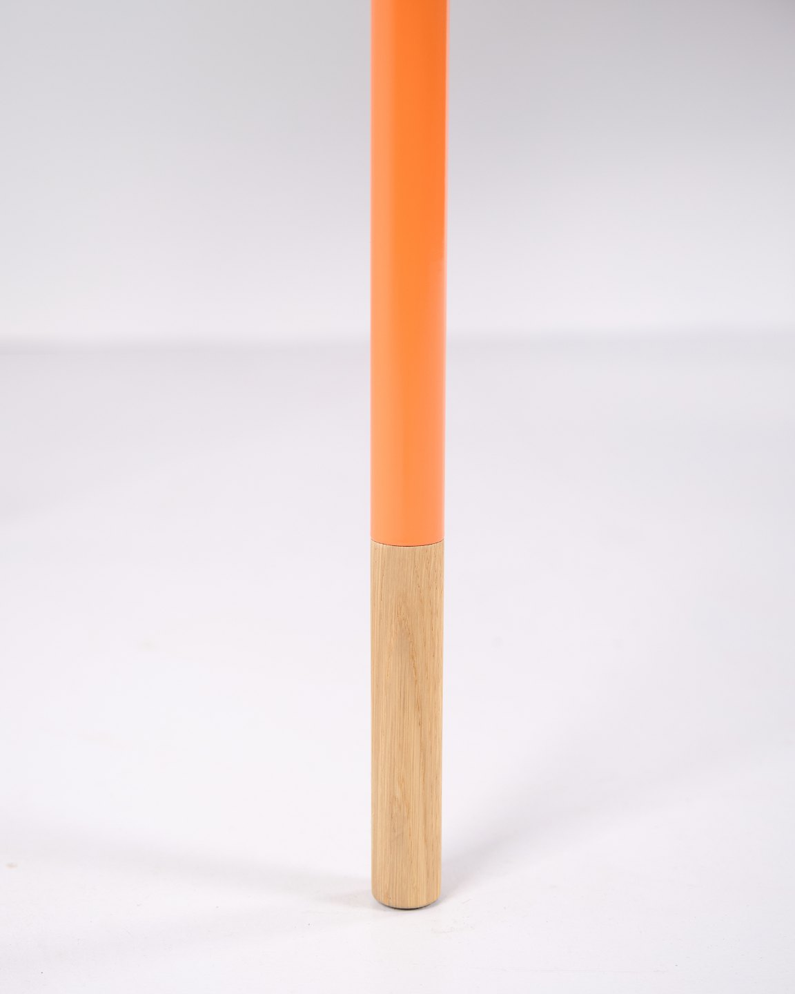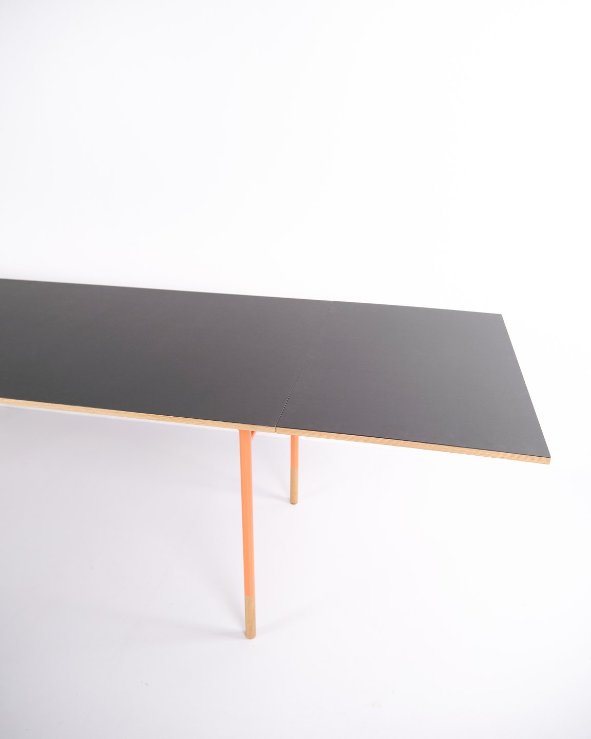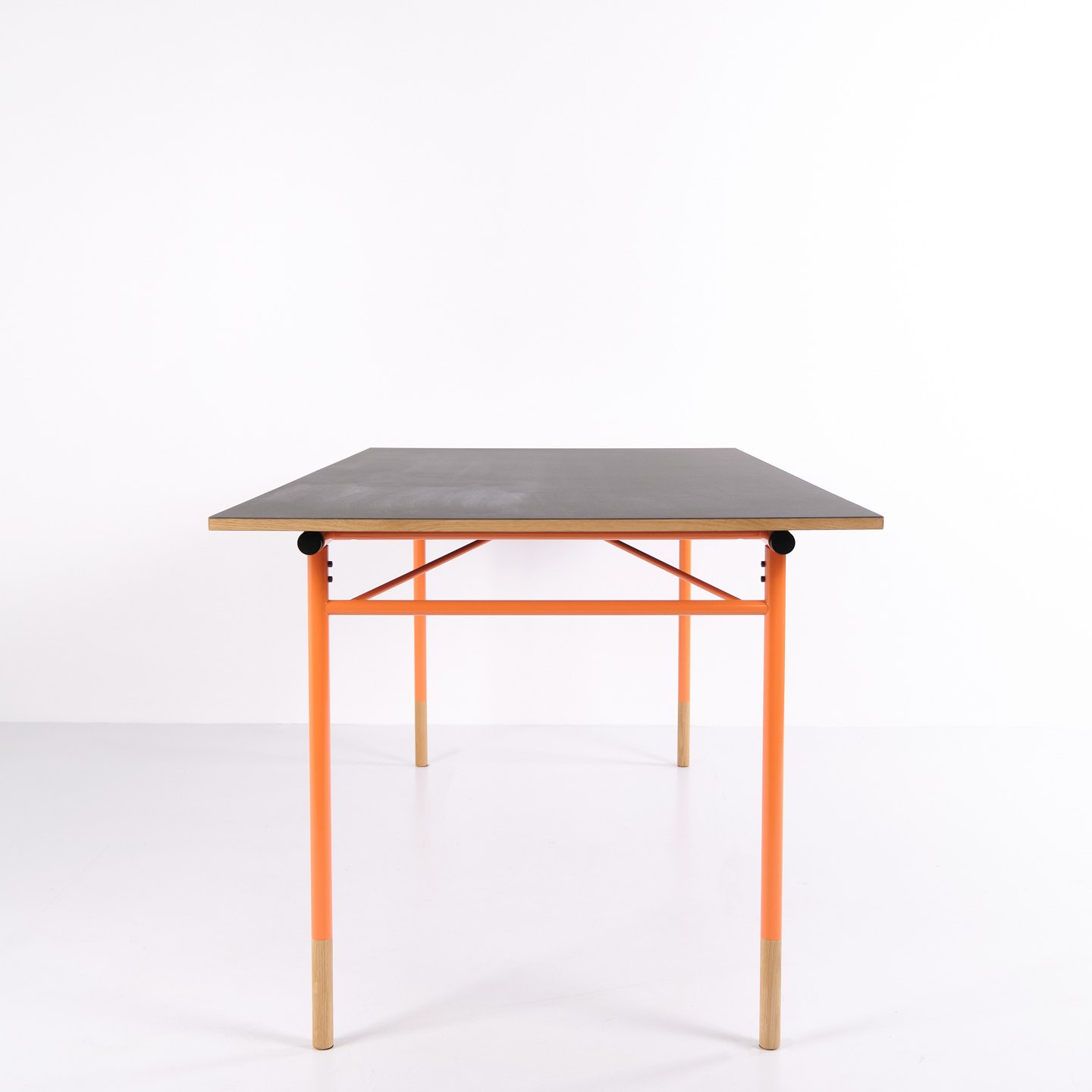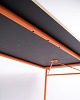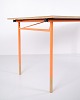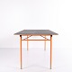 — Materiale: Grå linoleum, oregon pine kanter, orangelakerede stålben
