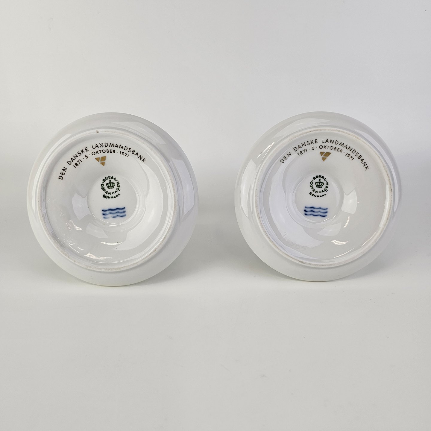 Beskrivelse: Et sæt lysestager i kongeligt porcelæn fra stellet Guld Vifte. Stagerne er stemplet Den Danske Landmandsbank, 1871 5. oktober 1971