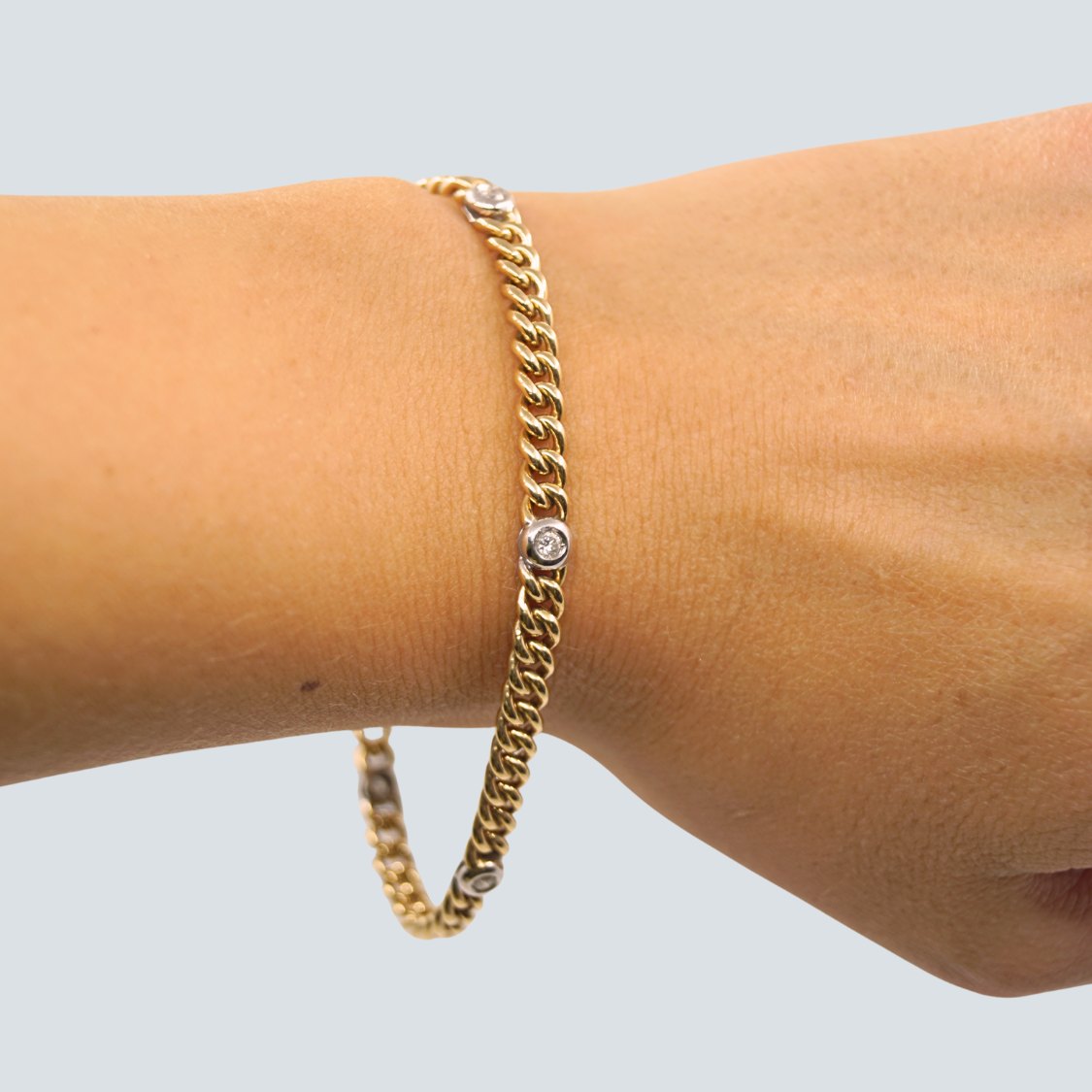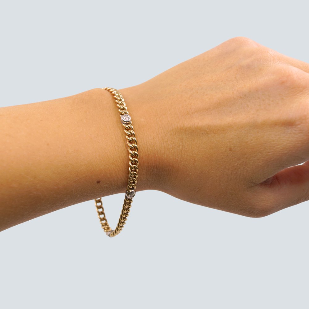 Panserarmbånd i 14 kt. guld prydet med diamanter fattet i hvidguld