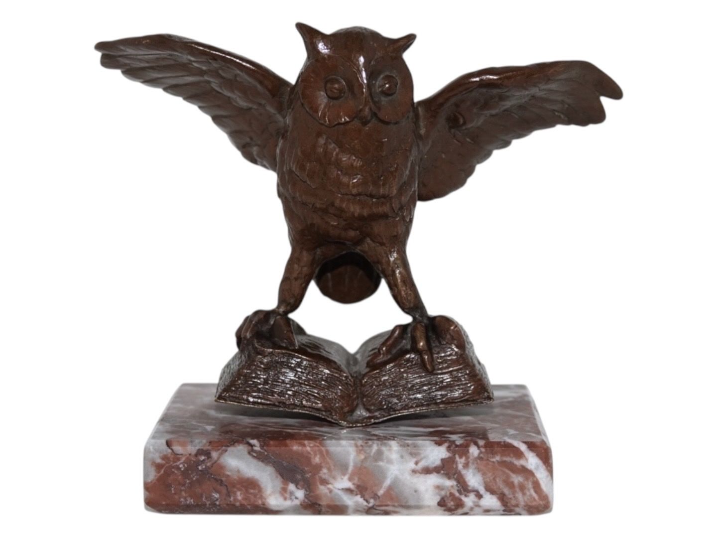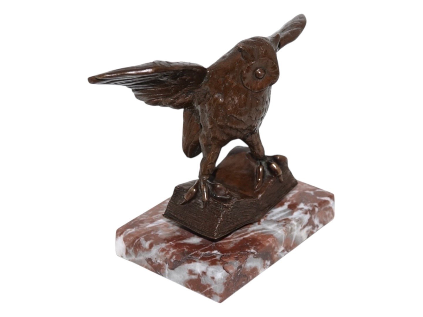 Beskrivelse: Bronze figur af ugle på marmorbase.