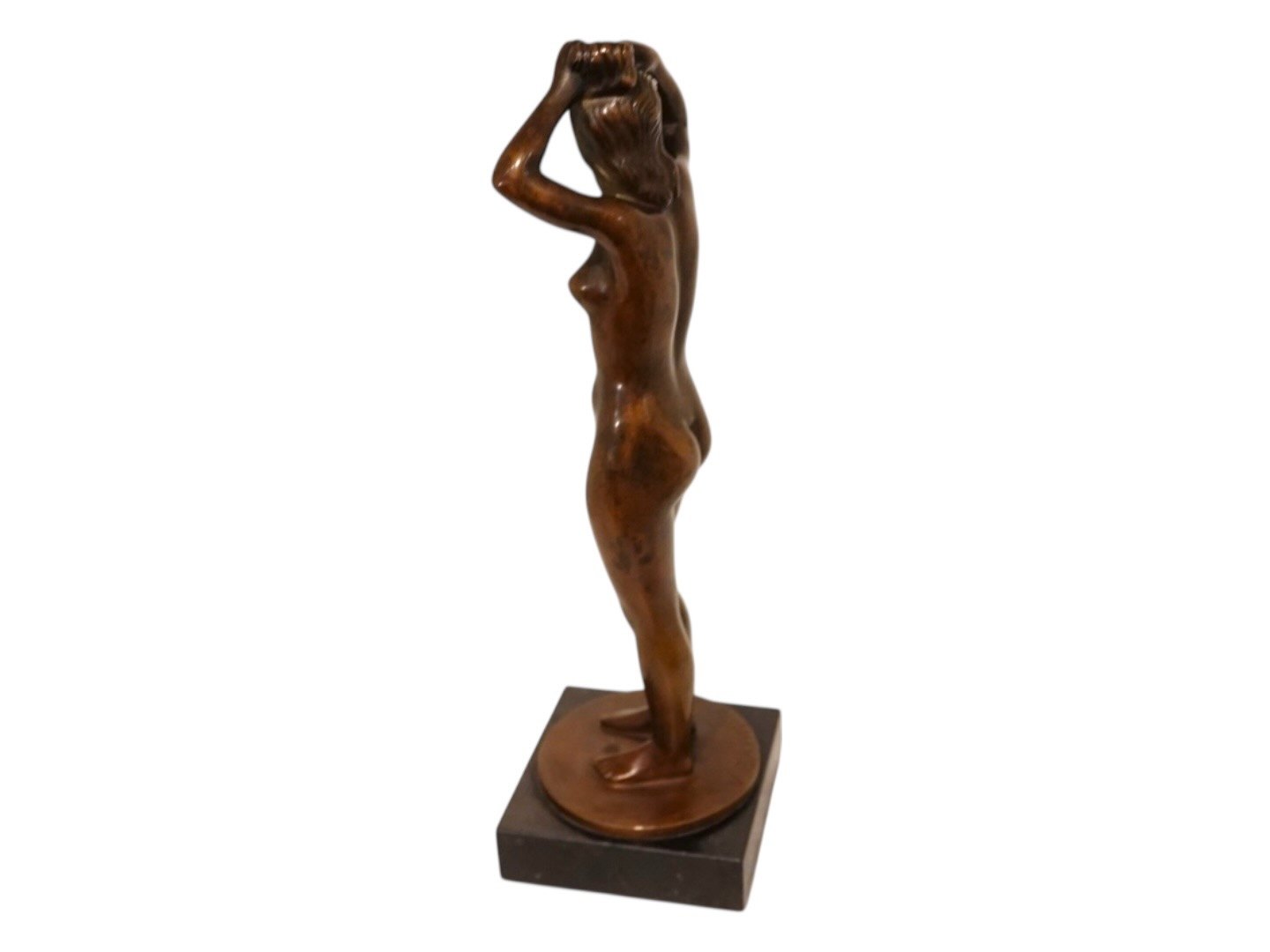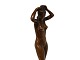 Beskrivelse: Volmer Bahner (1912-1995) bronze figur af nøgen dame der reder sit hår. Hun står på en sten sokkel.
