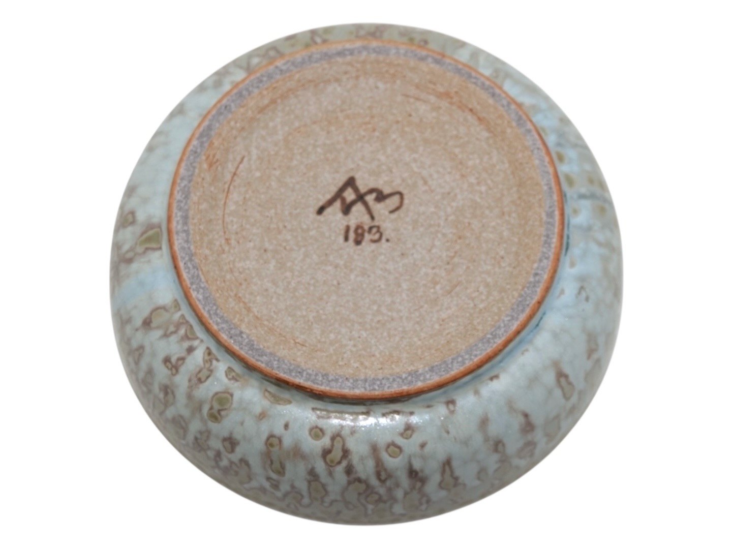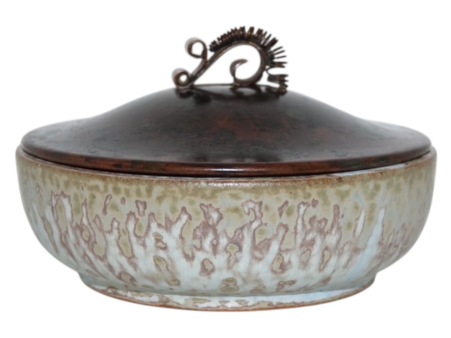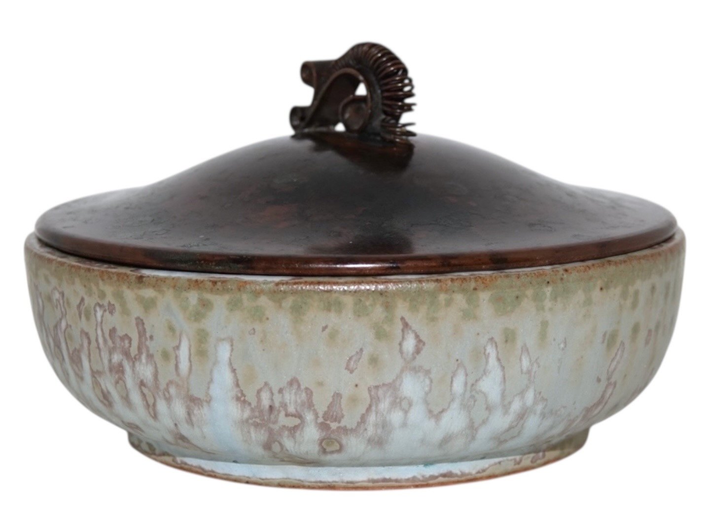 Beskrivelse: Arne Bang keramik, skål med en flot glasur samt originalt bronzelåg.