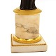 Beskrivelse: Et par store lueforgyldte og delvist sortpatinerede bronzekandelabre med marmorfod og -stamme