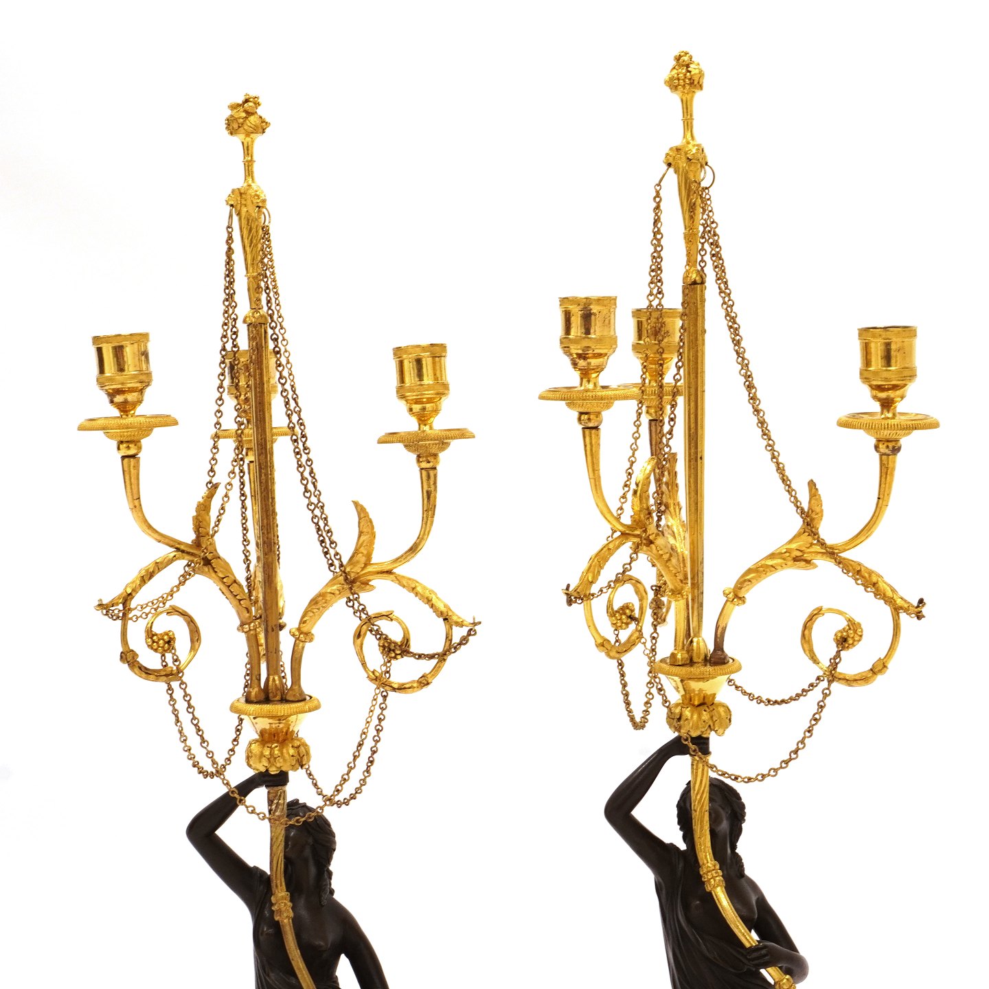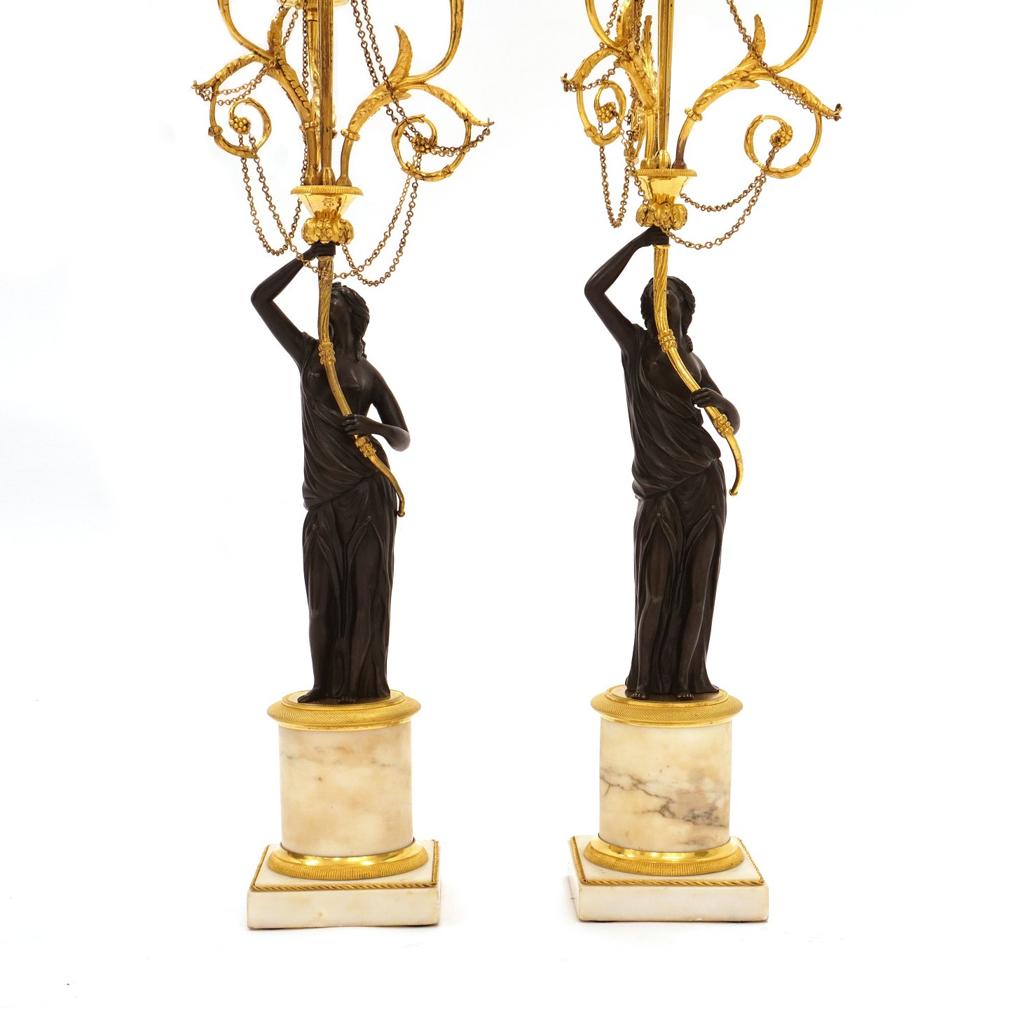Et par store lueforgyldte og delvist sortpatinerede kandelabre med marmorfod og -stamme. Frankrig ca. år 1810. H: 73cm