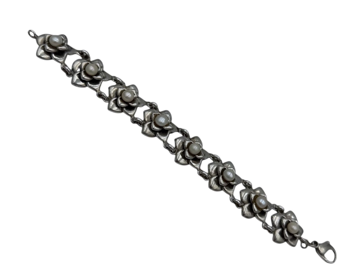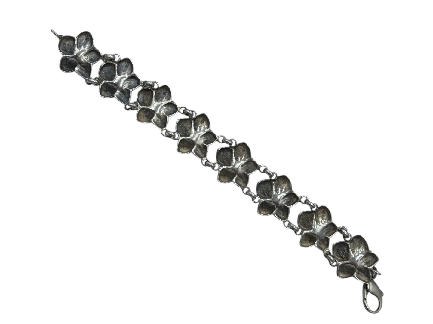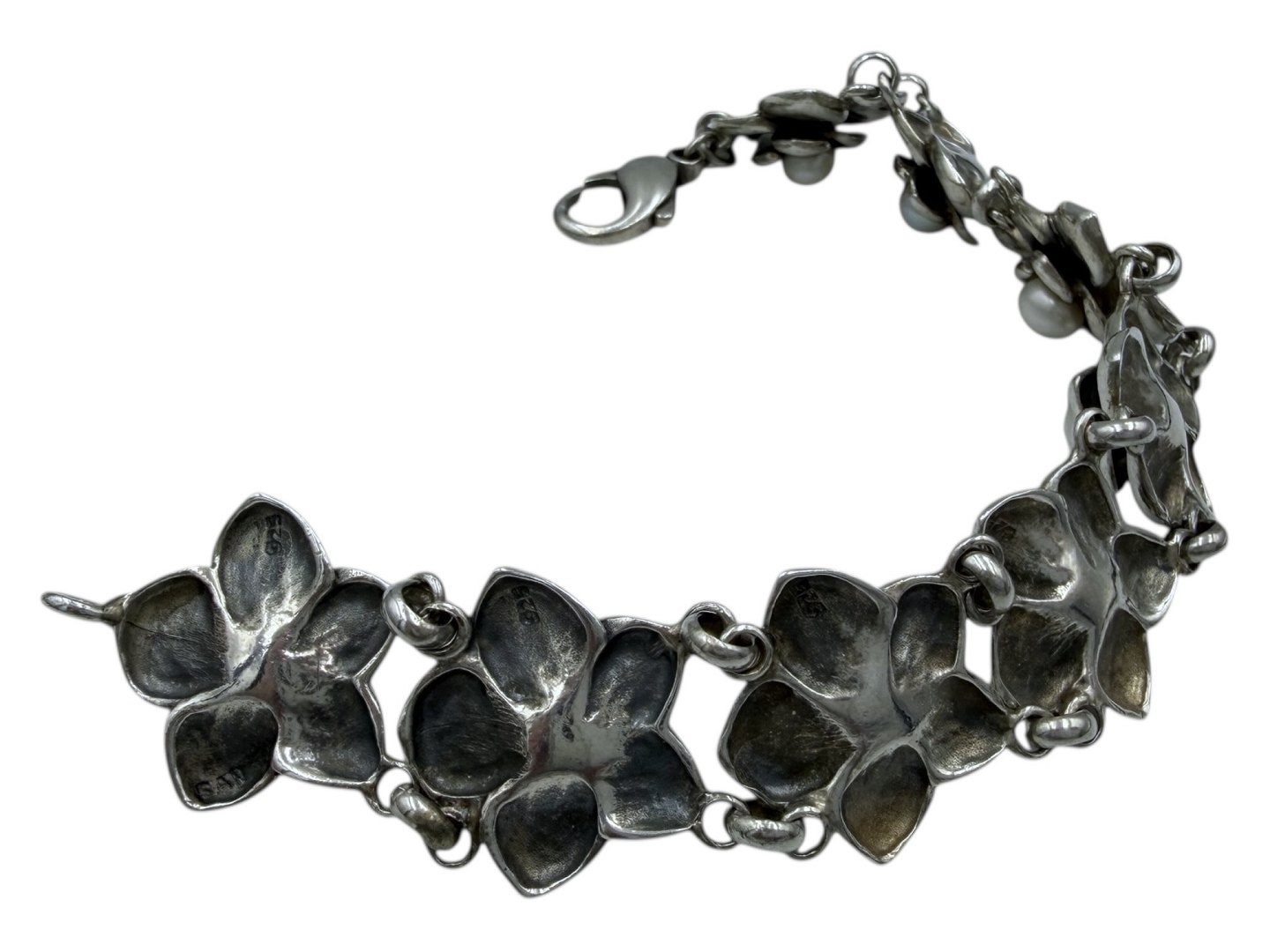 Beskrivelse: Tungt sterlingølv armbånd med blomster og perle lignende sten.